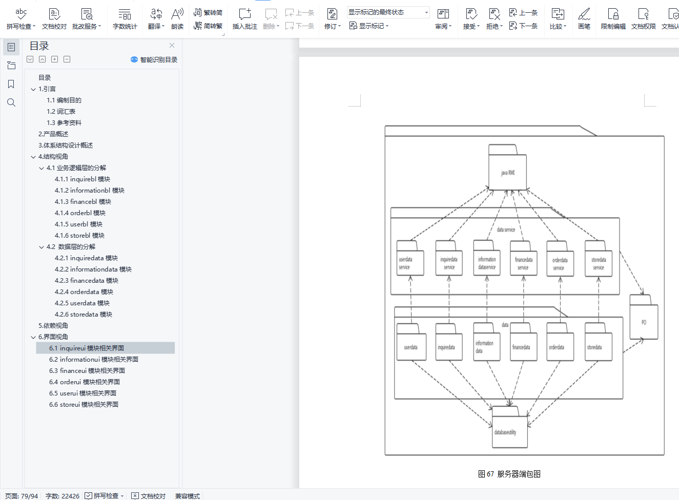 快递管理系统(LMS)目录1.引言 21.1编制目的 21.1词汇表 21.1参考资料 22.产品概述 33.体系结构设计概述 34.结构视角 34.1业务逻辑层的分解 34.1.1 inquirebl模块 34.1.2 informationbl模块 124.1.3 financebl模块 194.1.4 orderbl模块 324.1.5 userbl模块 544.1.6 storebl模块 574.2数据层的分解 644.2.1 inquiredata模块 644.2.2 informationdata模块 654.2.3 financedata模块 664.2.4 orderdata模块 684.2.5 userdata模块 694.2.6 storedata模块 705.依赖视角 726.界面视角 746.1 inquireui模块相关界面 746.2 informationui模块相关界面 766.3 financeui模块相关界面 786.4 orderui模块相关界面 806.5 userui模块相关界面 816.6 storeui模块相关界面 841.引言1.1编制目的本报告详细完成对物流企业管理系统的概要设计,达到指导详细设计和开发的目的,同时实现和测试人员以及用户的沟通。本报告面向开发人员、测试人员以及最终用户而编写,是了解系统的导航。
