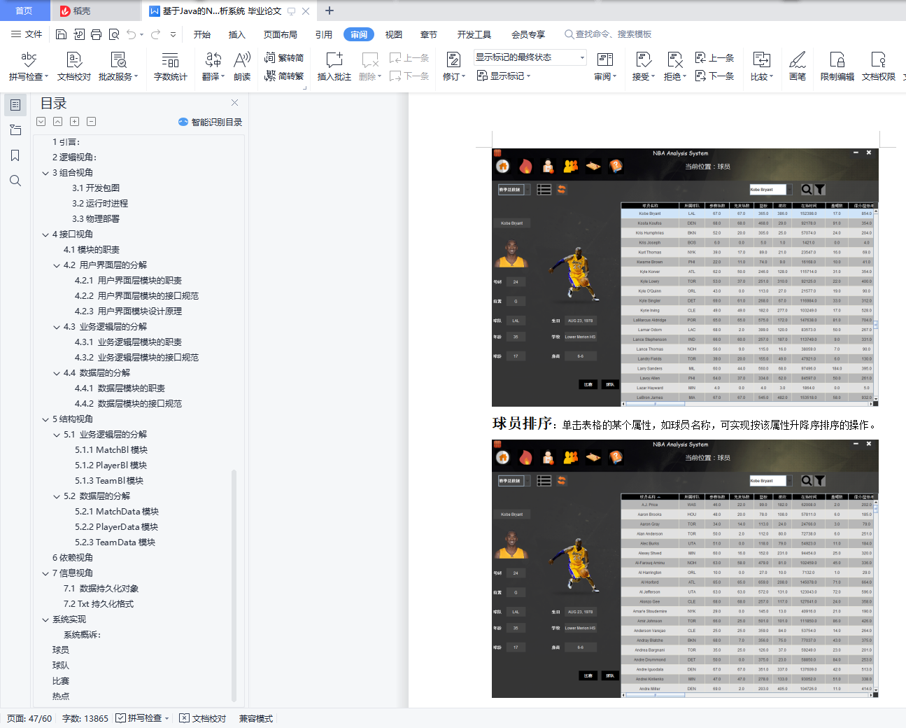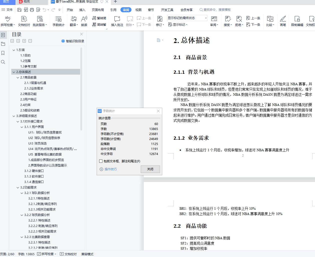 目录目录更新历史 ii1. 引言 31.1 目的 31.2 范围 31.3 参考文献 32. 总体描述 32.1 商品前景 32.1.1 背景与机遇 32.1.2 业务需求 32.2 商品功能 42.3 用户特征 42.4 约束 42.5 假设和依赖 43. 详细需求描述 53.1 对外接口需求 53.1.1用户界面 53.1.2硬件接口 63.1.3软件接口 73.1.4通信接口 73.2 功能需求 73.2.1球队数据分析 73.2.2球员数据分析 83.3 其他非功能需求 103.3.1 安全性 103.3.2 可维护性 103.3.3 易用性 103.3.4 可靠性 103.3.5 业务规则 103.3.6 约束 113.4 数据需求 113.4.1 数据定义 113.4.2 默认数据 113.4.3 数据格式要求 113.5 其他需求 111.引言1.1目的本文档描述了NBA数据分析系统的功能需求和非功能需求。开发小组的软件系统实现与验证工作都以此文档为依据。除特殊说明之外,本文档所包含的需求都是高优先级需求。1.2范围NBA数据分析系统是为NBA球迷开发的数据分析系统,在提高观众对NBA球队和球员的认识。1.3参考文献1、IEEE标准2.总体描述2.1商品前景2.1.1背景与机遇近年来,NBA赛事的收视率不断上升,越来越多的年轻人开始关注NBA赛事,并有了自己喜爱的NBA球队和球员,但是他们常常只在宏观上知道球队和球员的情况,难于从微观数据上分析球队和球员的情况,NBA数据分析系统DASN就是为满足球迷这一需求所开发的。NBA数据分析系统DASN就是为满足球迷想从微观上了解NBA球队和球员情况的要求而开发的,它包括一个数据集中服务器和多个客户端。数据集中服务器将所有的数据存储起来进行维护。用户通过客户端完成日常任务,客户端与数据集中服务器才是实时通信的方式完成数据交换。