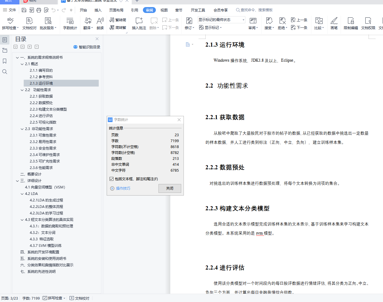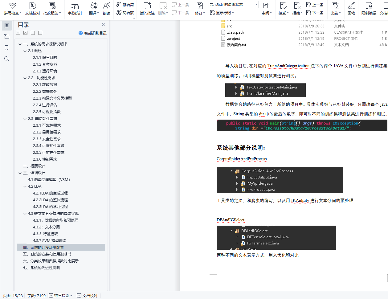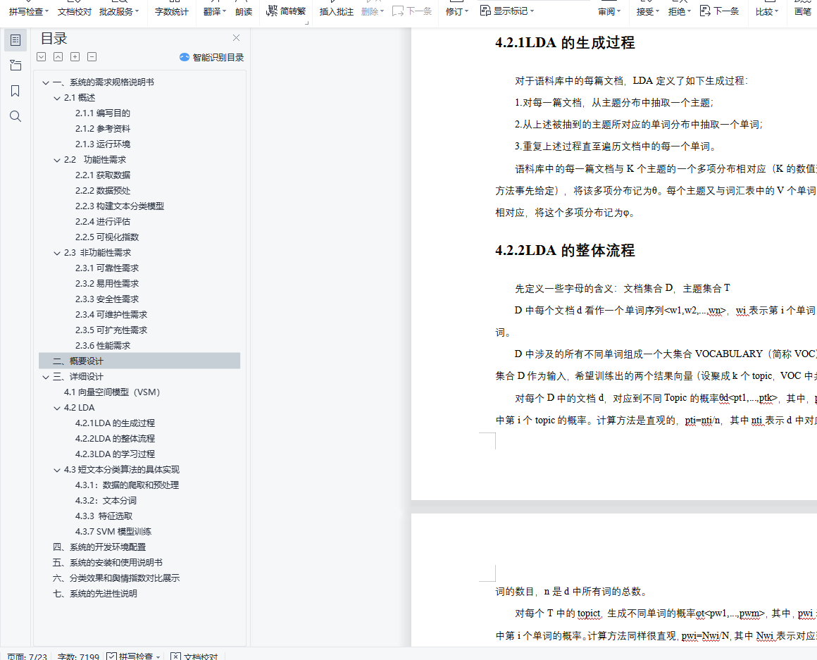 基于文本分类的金融舆情感知系统目录一、 系统的需求规格说明书 21.1概述 21.1.1编写目的 21.1.2参考资料 21.1.3运行环境 21.2 功能性需求 21.2.1获取数据 21.2.2数据预处 21.2.3构建文本分类模型 31.2.4进行评估 31.2.5可视化指数 31.3 非功能性需求 31.3.1可靠性需求 31.3.2易用性需求 31.3.3安全性需求 41.3.4可维护性需求 41.3.5可扩充性需求 41.3.6性能需求 4二、 概要设计 4三、 详细设计 54.1向量空间模型(VSM) 54.2 LDA 54.2.1LDA的生成过程 64.2.2LDA的整体流程 64.2.3LDA的学习过程 64.3短文本分类算法的具体实现 74.3.1:数据的爬取和预处理 74.3.2:文本分词 84.3.3 特征选取 84.3.7 SVM模型训练 11四、 系统的开发环境配置 12五、 系统的安装和使用说明书 12六、 分类效果和舆情指数对比展示 14七、 系统的先进性说明 16一、系统的需求规格说明书2.1概述2.1.1编写目的本设计书简单阐明了系统的基本设计思想、基本功能、模块划分以及模块间接口,以便保证开发的质量、需求的完整性与可追溯性。保证需求分析人员、开发人员、测试人员更好地了解该系统的基本情况及各模块的详细功能,对需求达成共识。