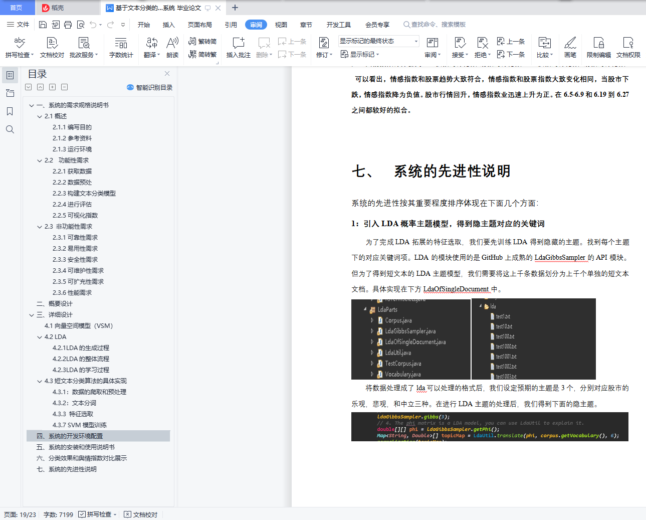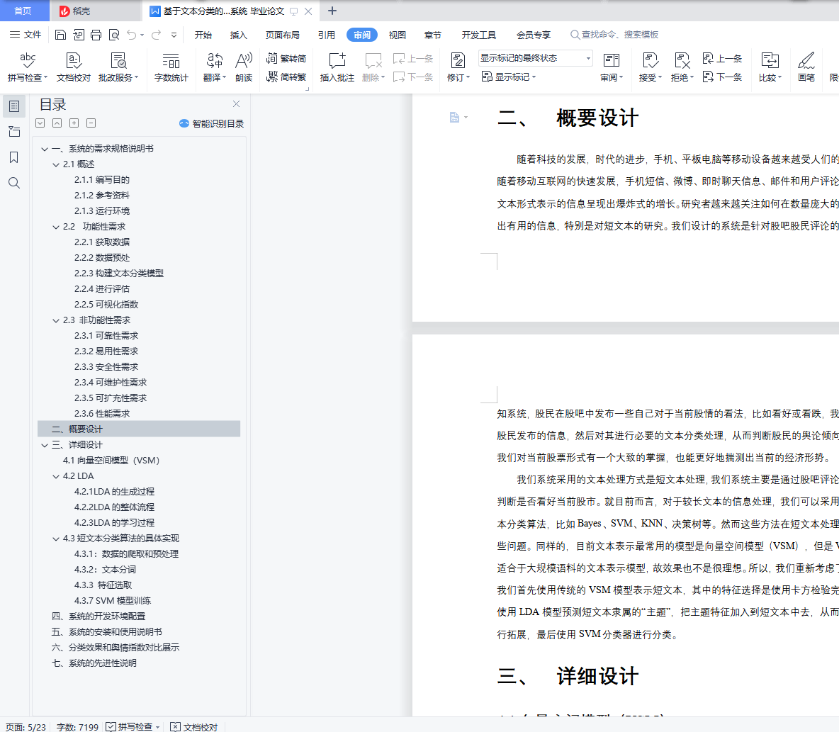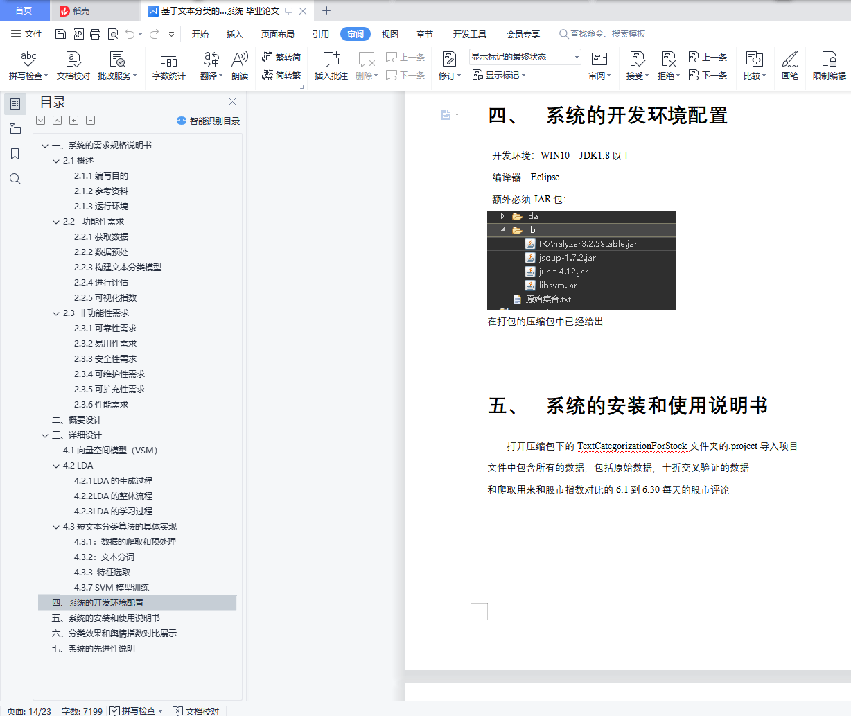 基于文本分类的金融舆情感知系统目录一、 系统的需求规格说明书 21.1概述 21.1.1编写目的 21.1.2参考资料 21.1.3运行环境 21.2 功能性需求 21.2.1获取数据 21.2.2数据预处 21.2.3构建文本分类模型 31.2.4进行评估 31.2.5可视化指数 31.3 非功能性需求 31.3.1可靠性需求 31.3.2易用性需求 31.3.3安全性需求 41.3.4可维护性需求 41.3.5可扩充性需求 41.3.6性能需求 4二、 概要设计 4三、 详细设计 54.1向量空间模型(VSM) 54.2 LDA 54.2.1LDA的生成过程 64.2.2LDA的整体流程 64.2.3LDA的学习过程 64.3短文本分类算法的具体实现 74.3.1:数据的爬取和预处理 74.3.2:文本分词 84.3.3 特征选取 84.3.7 SVM模型训练 11四、 系统的开发环境配置 12五、 系统的安装和使用说明书 12六、 分类效果和舆情指数对比展示 14七、 系统的先进性说明 16一、系统的需求规格说明书2.1概述2.1.1编写目的本设计书简单阐明了系统的基本设计思想、基本功能、模块划分以及模块间接口,以便保证开发的质量、需求的完整性与可追溯性。保证需求分析人员、开发人员、测试人员更好地了解该系统的基本情况及各模块的详细功能,对需求达成共识。