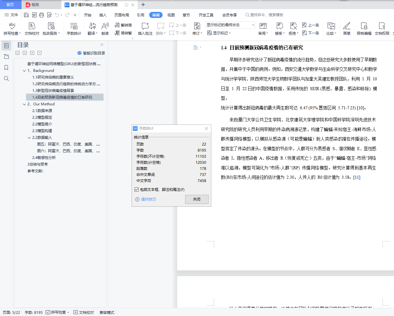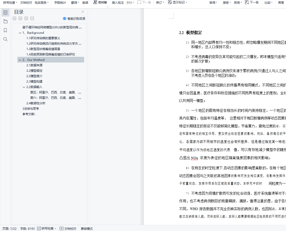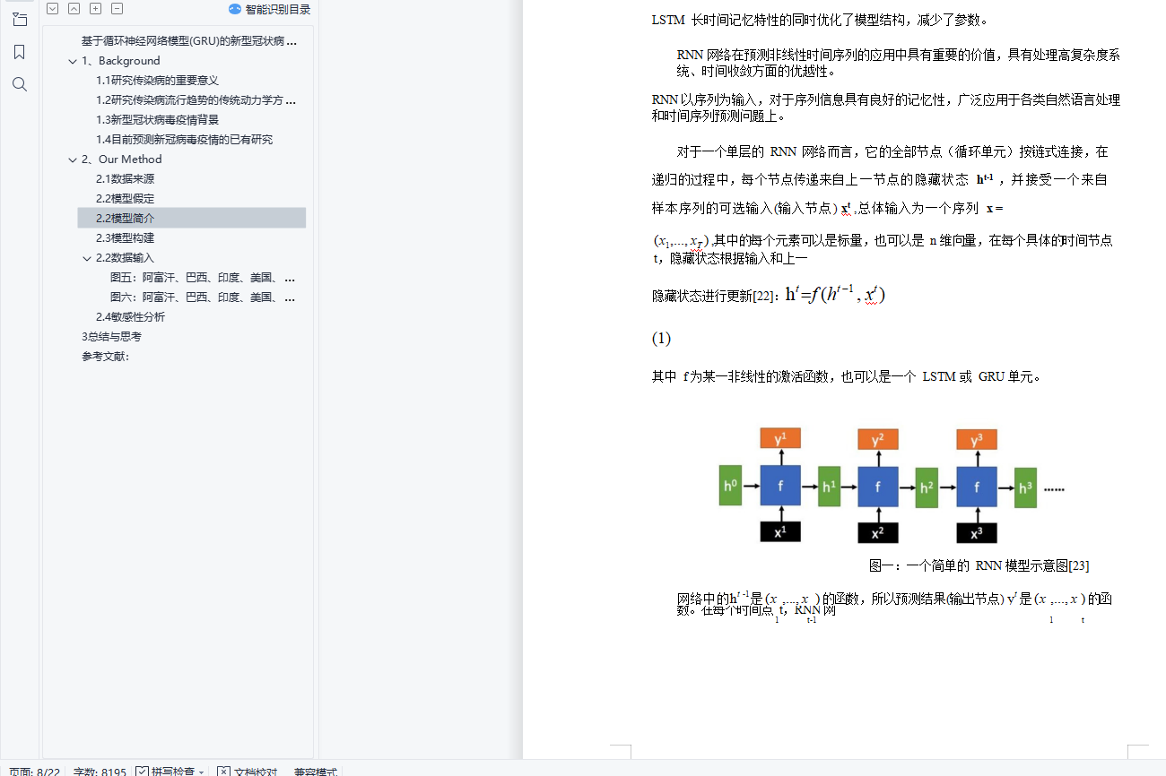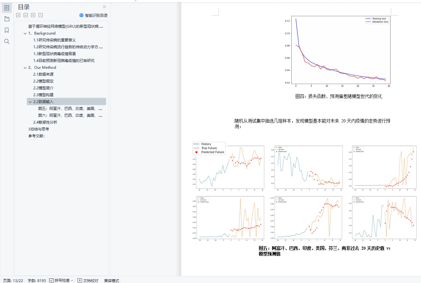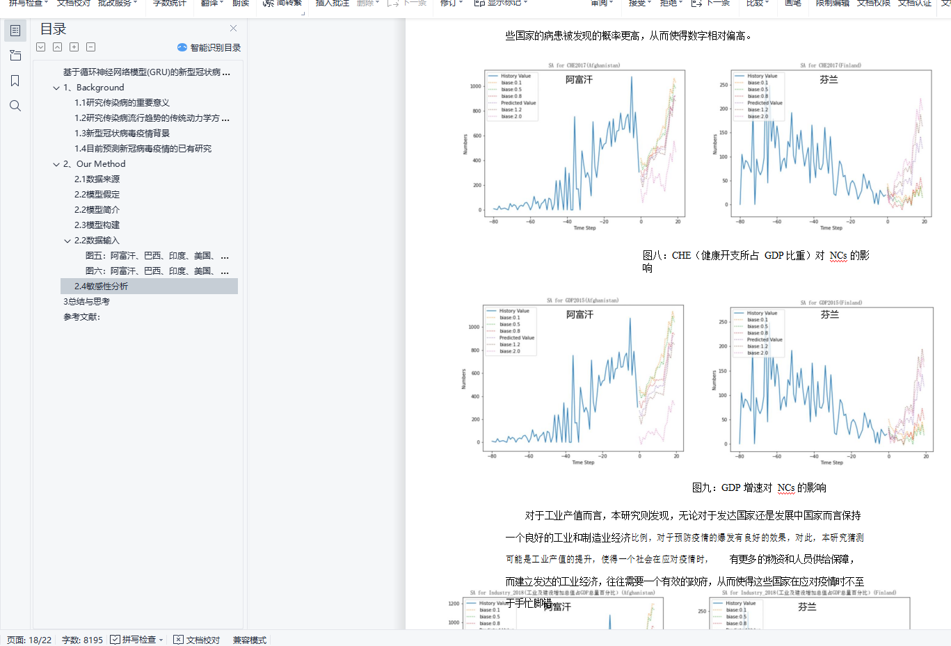 基于循环神经网络模型(GRU)的新型冠状病毒肺炎流行趋势预测目录基于循环神经网络模型(GRU)的新型冠状病毒肺炎流行趋势预测 11、Background 31.1 研究传染病的重要意义 31.2 研究传染病流行趋势的传统动力学方法 31.3 新型冠状病毒疫情背景 51.4 目前预测新冠病毒疫情的已有研究 52、Our Method 72.1 数据来源 72.2 模型假定 82.2 模型简介 92.3 模型构建 132.2 数据输入 212.4 敏感性分析 263 总结与思考 29参考文献: 29背景:流行病一直是人类生存发展的大敌,目前新冠疫情在中国得到了很好的控制,但在国外感染人数却仍然不断上升,如果世界各国不采取必要的应对措施,则极有可能在全球造成灾难性后果。由于新冠疫情的爆发对世界产生了全面而深刻的影响,所以借助数学手段对其流行趋势进行定量预测具有重要意义。目前许多研究已经预测了新冠疫情的流行趋势,但大多数研究局限于传统的流行病动力学数据,采用的是传统的微分模型。而本研究认为, 只有考虑社会因素、地区环境和政府政策和疫情传播的相互作用,才能得到更好的模型。方法:本研究根据 2020 年 1 月 11 日至 2020 年 5 月 27 日的全球数据,将基于循环神经网络的机器学习时间序列预测和传统的传染病动力学模型结合起来,建立了新冠疫情的日累计确诊病例(cumulative confirmed cases,CCCs)、新发病例(new cases,NCs)、新增死亡病例(new death cases,NDCs)和累计死亡病例(cumulative deathcases,CDCs)预测模型。模型不但包含 CCCs、NCs 等传统流行病模型参数,还引入了诸如地区 GDP 、居民健康开支(Current-health-expenditure,CHE)占 GDP 比例和人均预期寿命(Life Expectancy)等社会因素和地区年平均温度、空气污染变化幅度等环境因素以提升模型的精度,同时也克服了传统模型需要分地区建模的缺点,实现了全球各地区统一建模,从而更具普适性。基于这些模型,我们预测了新冠肺炎疫情在阿富汗、巴西、印度、美国、芬兰 和的南非流行趋势。结果:通过对比五个国家的过去 20 天新增病例历史值和模型预测值验证模型准确性,给出 216 个国家的未来20 天新增病例预测值,并展示分析了其中的六个典型国家。同时,对于模型的敏感性分析表明,新冠病毒在 5 - 15 ℃ 的温度下最易传播,地区流行风险和当地空气中 NOx 的含量呈显著的正相关,原因初步分析为 NOx 含量与地区人类交通活动强度呈正相关。其他和疫情严重程度显著相关的因素有:CHE (健康开支所占 GDP 比重)、GDP (国民生产总值) 增速、工业产值占 GDP 比重、地区年平均温度;而相较之下影响不显著的因素有:成人死亡率、麻疹免疫率、人均寿命、人口密度和人口总数。结论:新冠肺炎的流行趋势不是一个简单的生物学问题,而是深刻地受到了社会因素和环境因素的影响。各地 区环境不同,因而新冠肺炎的流行快慢也会受到影响,本模型并没有考虑病毒变异、社会动荡等更加不可预见的因 素然而现实和模型均表明,无论新冠疫情如何发展,采取全面而严格的控制措施才是应对疫情的不二良方。关键词:新冠疫情;预测;流行病学模型;SEIR 模型;机器学习;循环神经网络;GRU