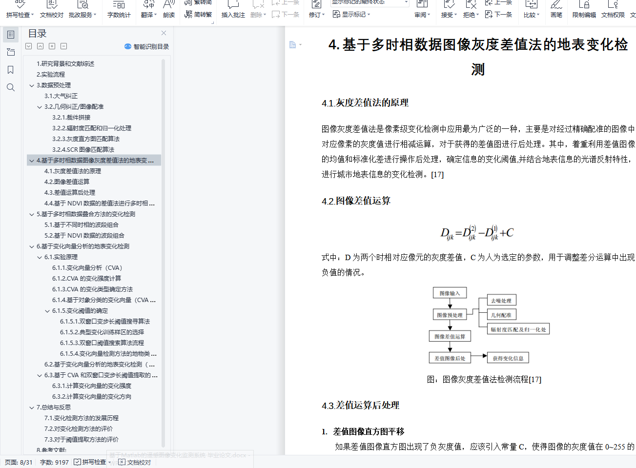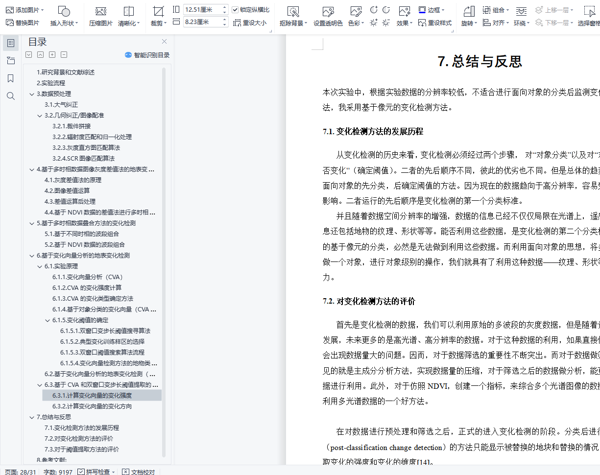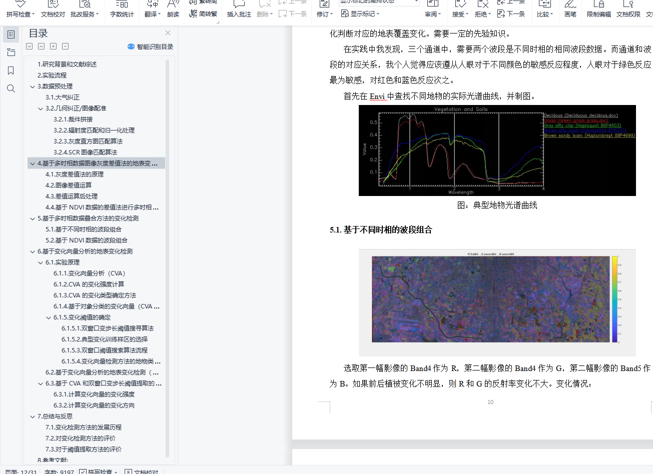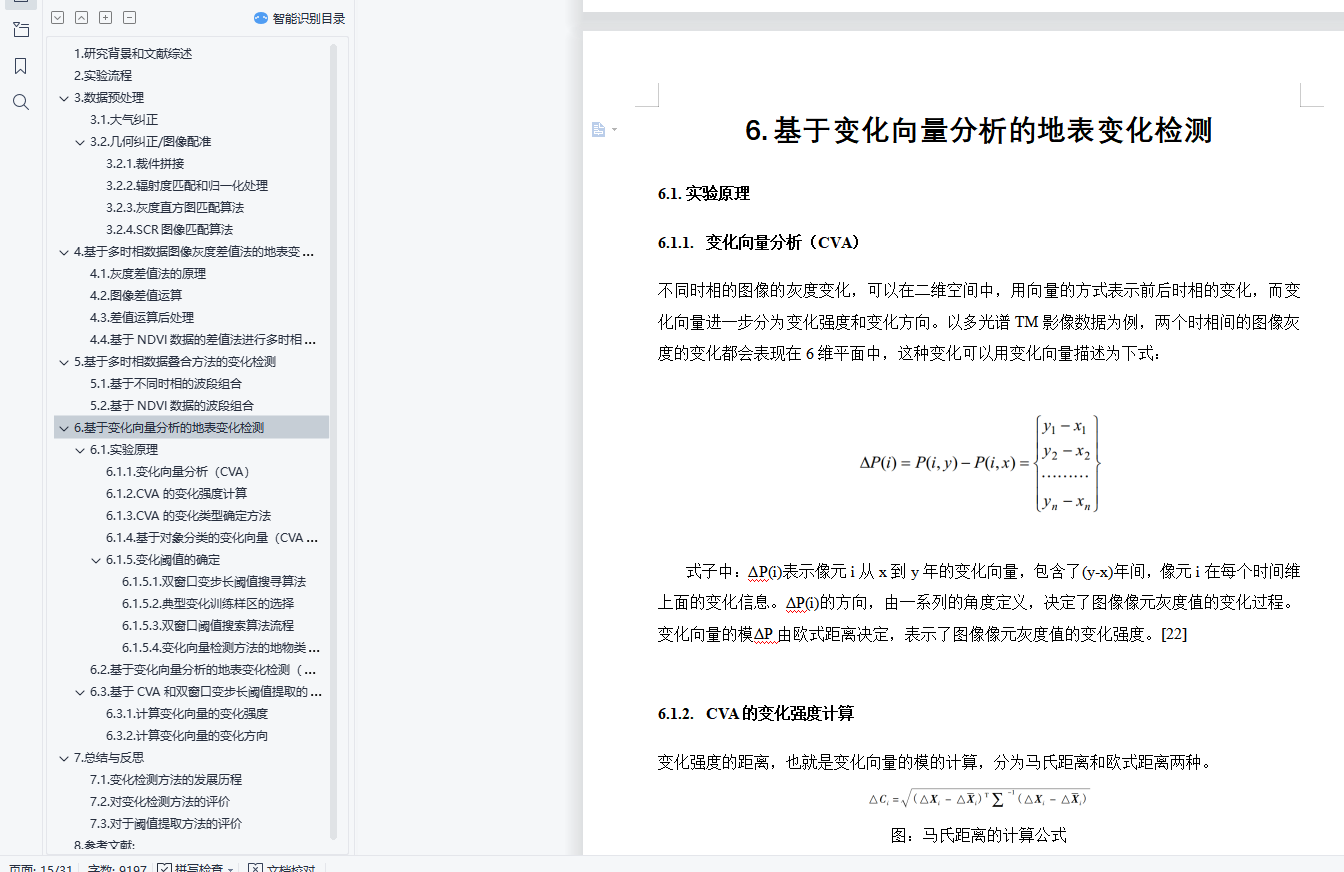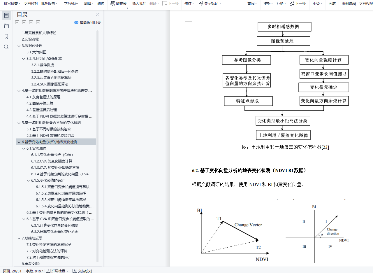 经过文献调研,我发现变化检测需要经过如下流程:1.数据预处理,包括对于数据的可用性和质量的评价,对于缺失数据的填补,对于不同时相数据做大气校正、几何精校正或者是相对配准。保证卫星图像的清晰、没有云雾的遮挡,分析前的几何精纠正(正射纠正),使得总误差小于一个像元,某些情况下,对于高分辨率的影响,为了减少数据量,可以将不同时相的数据进行重采样,需要将最后的RMS配准结果控制在0.5像素一下。如果只有两个时相的数据可以只进行相对配准,而如果出现多幅图像,则需要统一配准到坐标系里面。2.变化检测,包括使用基于像元的分析方法和基于对象的分析方法,分析不同时相数据的变化情况。将结果进一步使用Arcgis和Envi进行分级操作。3.阈值确定,对于第二步所获取的结果,人工或者使用相关算法确定较为合理的阈值。4.检测结果的精度评价和精度验证,一般情况下需要野外采点获取数据,也可以基于已有的矢量数据,进行评价。或者基于高光谱的数据验证分类之后的结果。