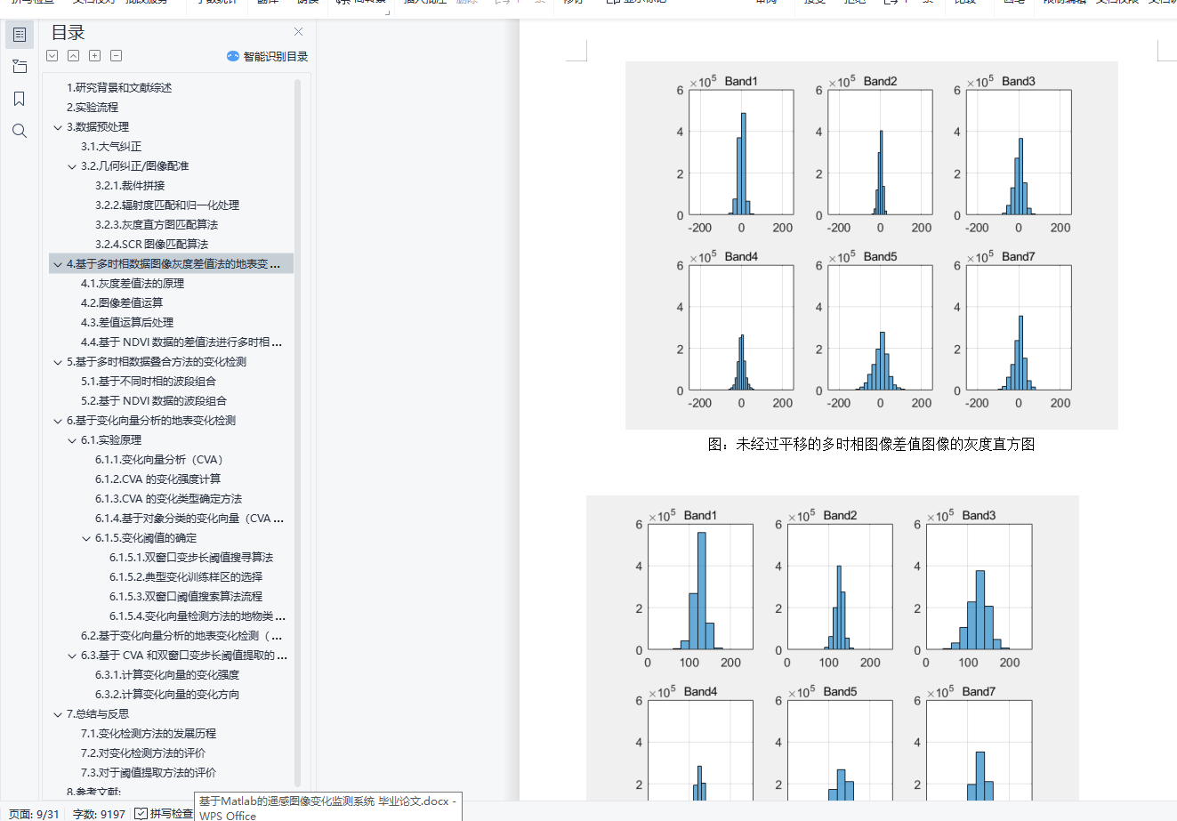 目 录1. 研究背景和文献综述 12. 实验流程 33. 数据预处理 43.1. 大气纠正 43.2. 几何纠正/图像配准 43.2.1. 裁件拼接 43.2.2. 辐射度匹配和归一化处理 43.2.3. 灰度直方图匹配算法 53.2.4. SCR图像匹配算法 54. 基于多时相数据图像灰度差值法的地表变化检测 64.1. 灰度差值法的原理 64.2. 图像差值运算 64.3. 差值运算后处理 64.4. 基于NDVI数据的差值法进行多时相数据检测 95. 基于多时相数据叠合方法的变化检测 105.1. 基于不同时相的波段组合 105.2. 基于NDVI数据的波段组合 126. 基于变化向量分析的地表变化检测 136.1. 实验原理 136.1.1. 变化向量分析(CVA) 136.1.2. CVA的变化强度计算 136.1.3. CVA的变化类型确定方法 146.1.4. 基于对象分类的变化向量(CVA)分析法 146.1.5. 变化阈值的确定 146.2. 基于变化向量分析的地表变化检测(NDVI BI数据) 186.3. 基于CVA和双窗口变步长阈值提取的变化监测 206.3.1. 计算变化向量的变化强度 206.3.2. 计算变化向量的变化方向 257. 总结与反思 267.1. 变化检测方法的发展历程 267.2. 对变化检测方法的评价 267.3. 对于阈值提取方法的评价 278. 参考文献: 28
