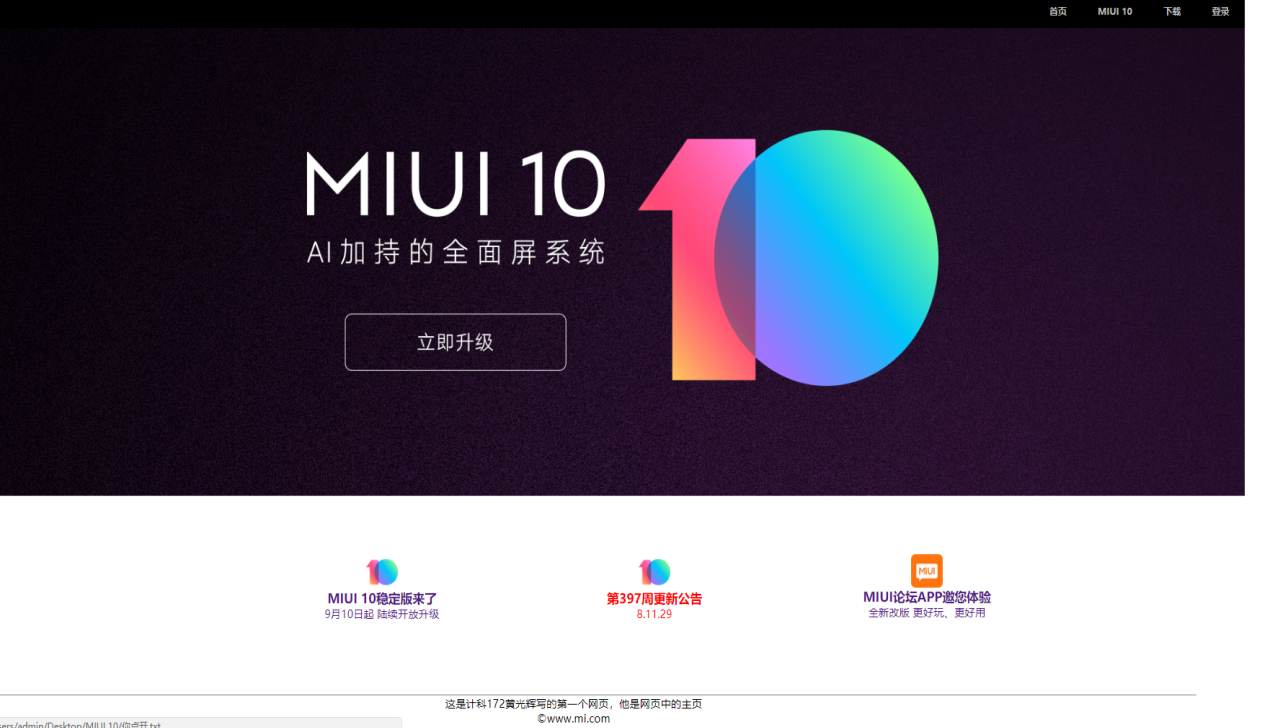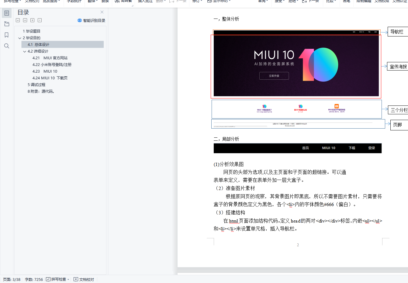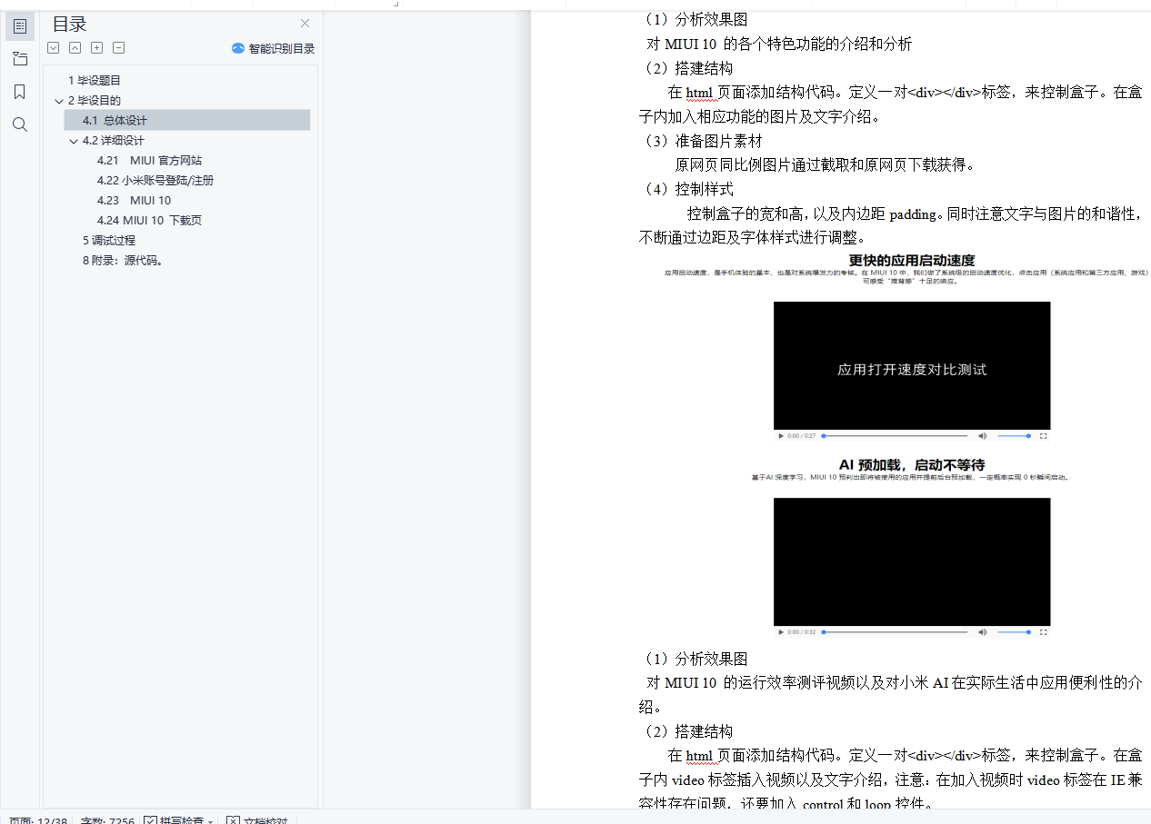 目录1毕设题目 12毕设目的 13选题依据及内容 14设计过程 14.1 总体设计 14.2详细设计 24.21 MIUI官方网站 24.22小米账号登陆/注册 44.23 MIUI 10 64.24 MIUI 10 下载页 125调试过程 166收获及体会 167参考文献 178附录:源代码。 171毕设题目基于HTML+CSS+JavaScript网站的设计与开发2毕设目的通过本课程设计,学生需要掌握web前端开发技术的基本技能和专业能力,培养学生如下技能:知识目标:复习、巩固Web前端的基础知识,进一步加深对Web前端技术的理解和掌握;能力目标:理解网站设计的四个阶段:网站的前期准备、网站的结构架设、网站的效果设计和网站的人机交互,综合应用 HTML、CSS、JavaScript等技术来开发网站;素养目标:课程设计为学生提供了一个既动手又动脑,独立实践的机会,将课本上的理论知识和实际有机的结合起来,锻炼学生的分析 解决实际问题的能力。培养学生在项目开发中团队合作精神、创新意识及能力。