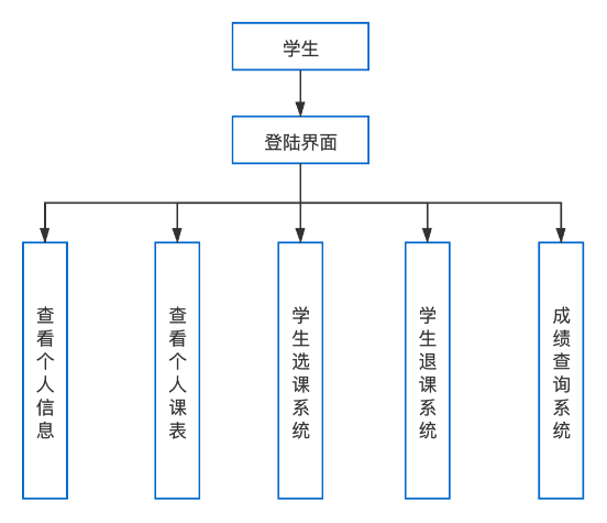 课程管理系统主要分为三个客户端登陆,分别是学生、任课教师和系主任,每个客户端的功能是不同的。这三个客户端的登陆拥有自己的功能实现。下面三个图分别是三个客户端的功能模块图。