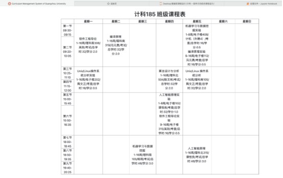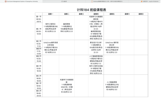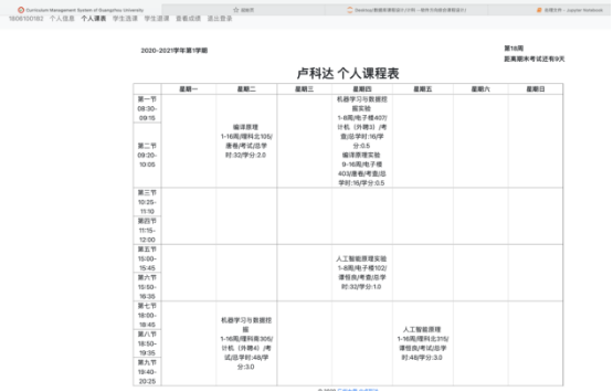(2) 学生定制专属课表,可以查看整个学期本人的课程安排,包括课程名称、上课时间、上课地点、任课老师、学分等等。