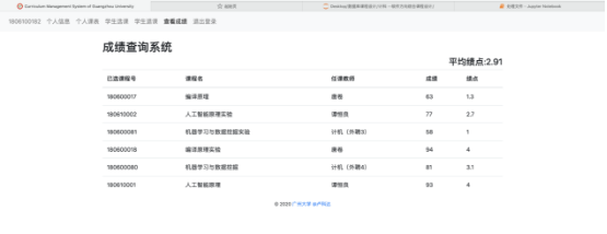(5) 学生可以查看自己选上的课的成绩,以及各个课程的得分、绩点,并给出其平均绩点,但不允许查看年级其他人的成绩。