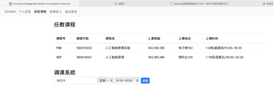 (7) 任课教师可以查看本人所任教课程信息,包括课程名称、上课时间、上课地点、上课班级等等。