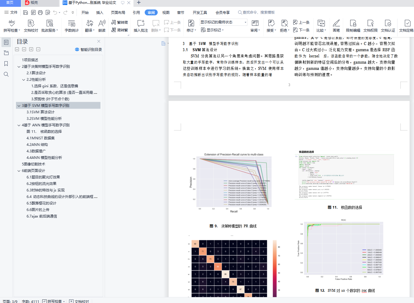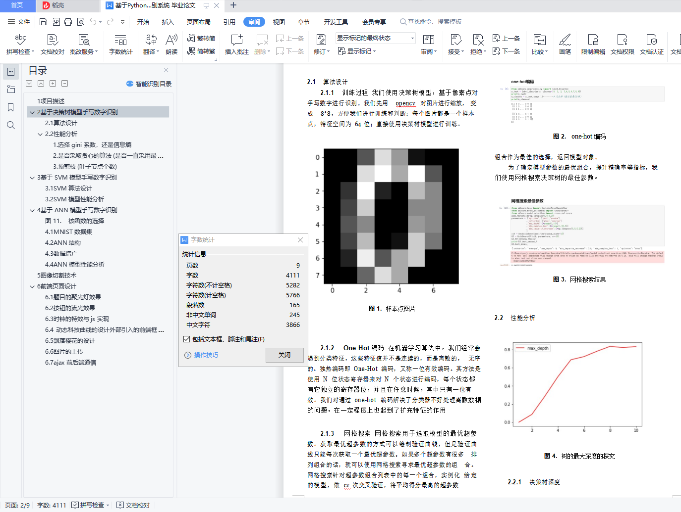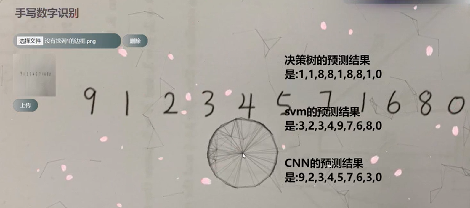 目录1 项目描述 12 基于决策树模型手写数字识别 22.1 算法设计 32.2 性能分析 31. 选择 gini 系数,还是信息熵 42. 是否采取贪心的算法 (是否一直采用最大信息熵增 43. 预剪枝 (叶子节点个数) 43 基于 SVM 模型手写数字识别 43.1 SVM 算法设计 43.2 SVM 模型性能分析 54 基于 ANN 模型手写数字识别 5图 11. 核函数的选择 54.1 MNIST 数据集 54.2 ANN 结构 54.3 数据增广 54.4 ANN 模型性能分析 65 图像切割技术 66 前端页面设计 66.1 题目的聚光灯效果 66.2 按钮的流光效果 76.3 时钟的特效与 js 实现 86.4 动态科技曲线的设计外部引入的前端框架 86.5 飘落樱花的设计 86.6 图片的上传 86.7 ajax 前后端通信 91项目描述图像识别(Image Recognition)是指利用计算机对图像进行处理、分析和理解,以识别各种不同模式的目标和对像 的技术。图像识别的发展经历了三个阶段:文字识别、数字 图像处理与识别、物体识别。机器学习领域一般将此类识别问题转化为分类问题。手写识别是常见的图像识别任务。计算机通过手写体 图片来识别出图片中的字,与印刷字体不同的是,不同人的手写体风格迥异,大小不一,造成了计算机对手写识别任务的一些困难。数字手写体识别由于其有限的类别(0 9 共 10 个数字)成为了相对简单的手写识别任务。手写数字识别作为模式识别领域的一个重要问题,也有着重要的理论价值, 在大数据时代的背景下,其应用领域非常之广。很多学者对手写数字识别提出了不同的算法,取得了不错的测试效果。为了更好的探究不同算法对手写数字识别的准确度,我们进行了一系列实验。我们分别实现了基于决策树模型、SVM 模型、ANN 模型的手写数字识别算法,并探究各种模型参数下手写数字识别的效果,从纵向和横向两个维度量化分析了各种模型在不同参数下以及三种模型之间的性能表现差异。同时我们也使用了图像切割技术提高了识别率,并完成了前端页面的设计。本文安排如下:在第二三四节我们将分别介绍基于决策 树模型、SVM 模型、ANN 模型的手写数字识别算法实现和性能分析;第五节介绍图像切割技术;第六节展示前端页面 的设计;第七节提出了科研创新点;最后进行了整个项目总结。