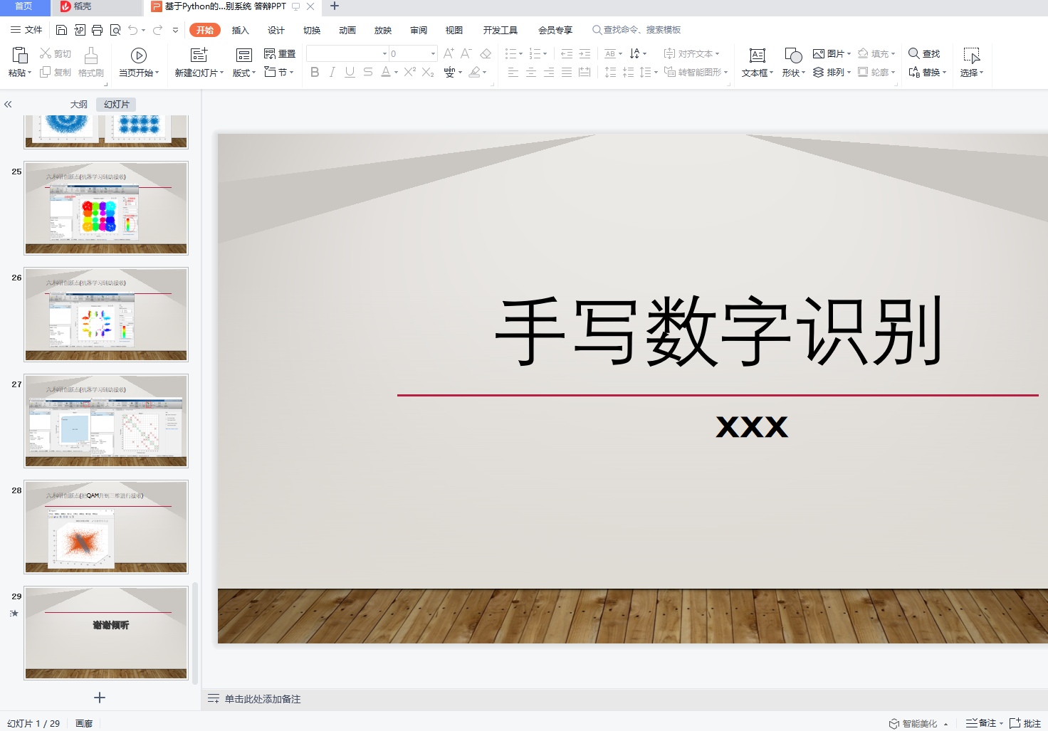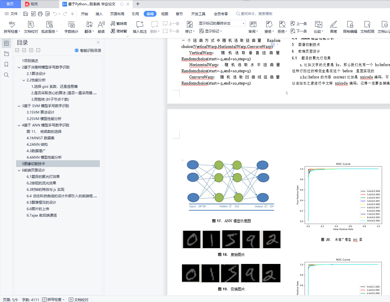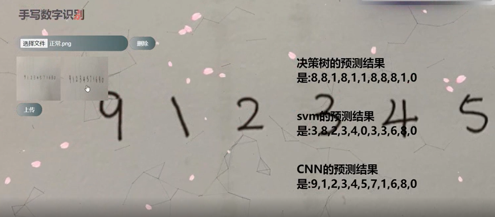 目录1 项目描述 12 基于决策树模型手写数字识别 22.1 算法设计 32.2 性能分析 31. 选择 gini 系数,还是信息熵 42. 是否采取贪心的算法 (是否一直采用最大信息熵增 43. 预剪枝 (叶子节点个数) 43 基于 SVM 模型手写数字识别 43.1 SVM 算法设计 43.2 SVM 模型性能分析 54 基于 ANN 模型手写数字识别 5图 11. 核函数的选择 54.1 MNIST 数据集 54.2 ANN 结构 54.3 数据增广 54.4 ANN 模型性能分析 65 图像切割技术 66 前端页面设计 66.1 题目的聚光灯效果 66.2 按钮的流光效果 76.3 时钟的特效与 js 实现 86.4 动态科技曲线的设计外部引入的前端框架 86.5 飘落樱花的设计 86.6 图片的上传 86.7 ajax 前后端通信 91项目描述图像识别(Image Recognition)是指利用计算机对图像进行处理、分析和理解,以识别各种不同模式的目标和对像 的技术。图像识别的发展经历了三个阶段:文字识别、数字 图像处理与识别、物体识别。机器学习领域一般将此类识别问题转化为分类问题。手写识别是常见的图像识别任务。计算机通过手写体 图片来识别出图片中的字,与印刷字体不同的是,不同人的手写体风格迥异,大小不一,造成了计算机对手写识别任务的一些困难。数字手写体识别由于其有限的类别(0 9 共 10 个数字)成为了相对简单的手写识别任务。手写数字识别作为模式识别领域的一个重要问题,也有着重要的理论价值, 在大数据时代的背景下,其应用领域非常之广。很多学者对手写数字识别提出了不同的算法,取得了不错的测试效果。为了更好的探究不同算法对手写数字识别的准确度,我们进行了一系列实验。我们分别实现了基于决策树模型、SVM 模型、ANN 模型的手写数字识别算法,并探究各种模型参数下手写数字识别的效果,从纵向和横向两个维度量化分析了各种模型在不同参数下以及三种模型之间的性能表现差异。同时我们也使用了图像切割技术提高了识别率,并完成了前端页面的设计。本文安排如下:在第二三四节我们将分别介绍基于决策 树模型、SVM 模型、ANN 模型的手写数字识别算法实现和性能分析;第五节介绍图像切割技术;第六节展示前端页面 的设计;第七节提出了科研创新点;最后进行了整个项目总结。