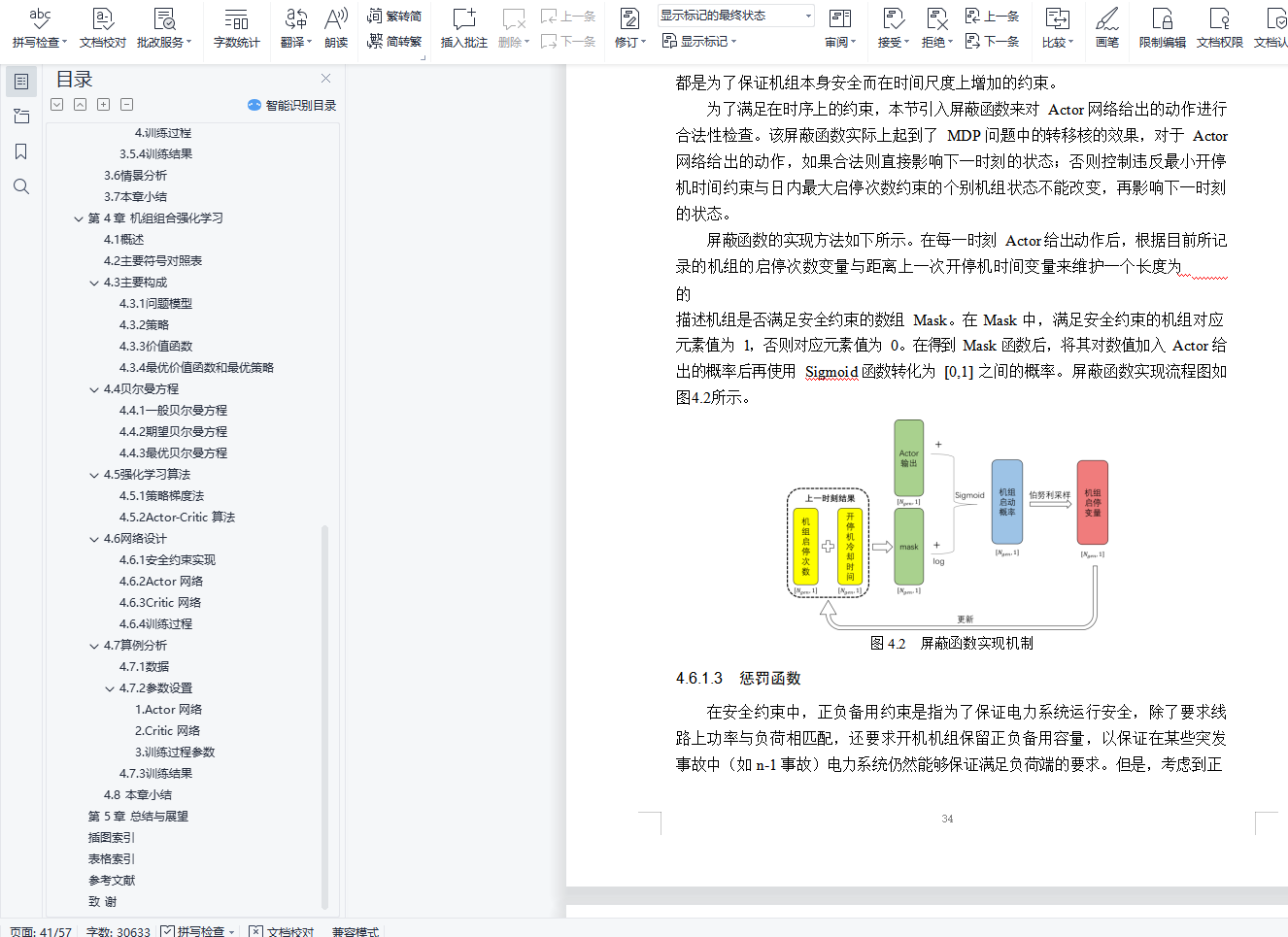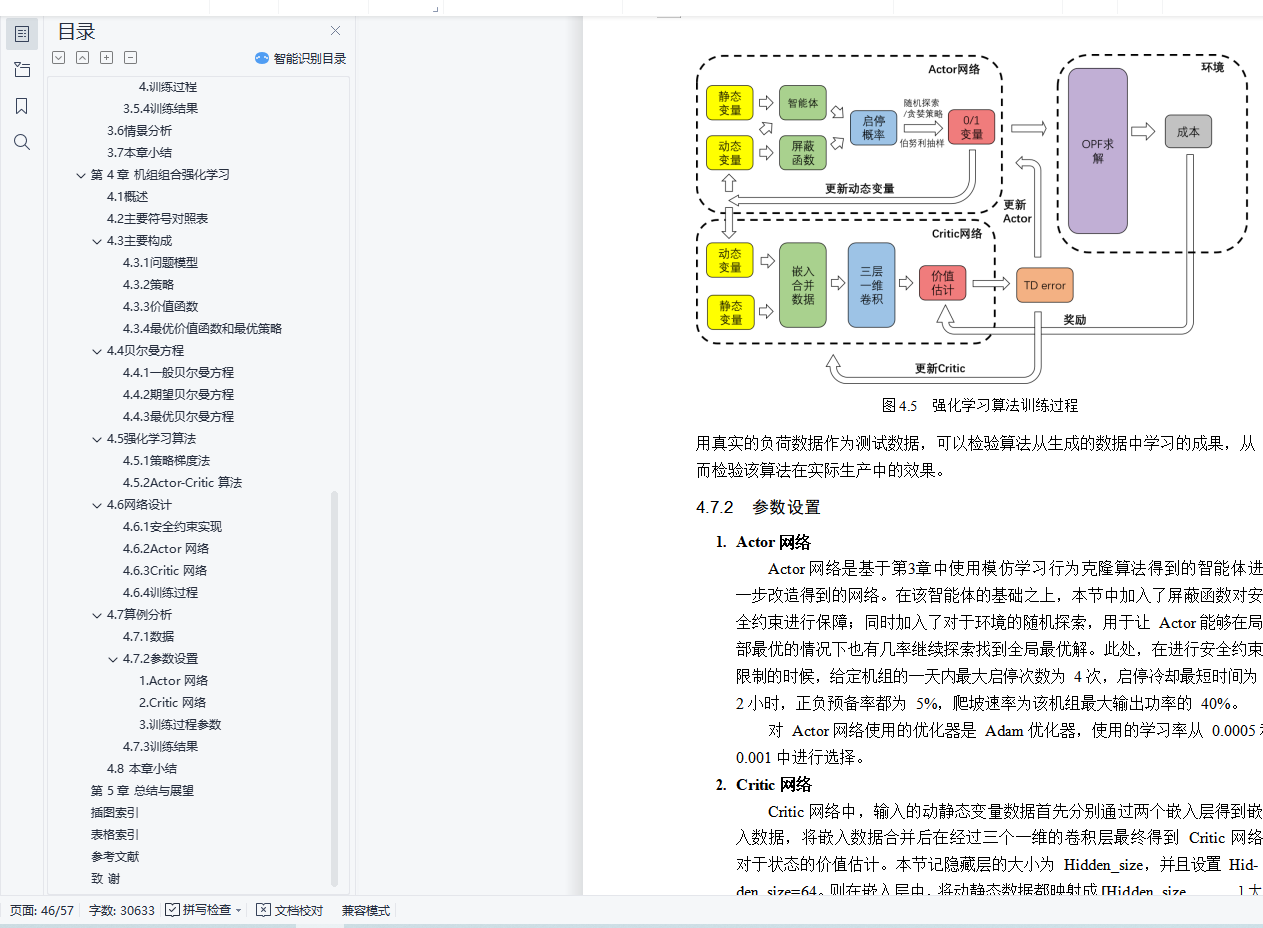 中文摘要随着我国电力市场制度的逐步发展以及清洁能源的引入,机组组合问题又面临着新的挑战。使用传统方法进行机组组合求解,能够求得经济上的最优解,但是在求解时间上随着系统规模的增大而迅速增大,难以满足当前电力市场快速出清的要求。针对上述问题,本文提出了基于强化学习的机组组合求解方法,在保证电力系统安全约束的情况下实现机组组合问题的快速求解。本文首先对机组组合问题进行混合整数线性规划模型与马尔可夫决策过程的建模。在机组组合的问题背景下,引入了保证电力系统安全约束的混合整数线性规划问题模型,使用该分析方法能够利用 Gurobi 求解器实现求解,给出机组组合问题的最优解。引入了强化学习中马尔可夫决策过程的概念,基于机组组合问题的特点给出状态空间、动作空间、转移概率以及奖励函数,为强化学习打下基础。针对机组组合过程中每一个时段内的决策过程,引入了模仿学习的行为克隆方法。本文给出了一个基于ResNet 网络的智能体结构,并令其模仿混合整数线性规划问题方法给出的在某些场景下的状态决策对,使之能够求解在单时段内的机组组合问题。通过模仿学习,该智能体为强化学习提供了一个基础的策略网络,便于强化学习的求解。最后,本文基于模仿学习给出的智能体作为基础的决策网络,引入了强化学习中的策略梯度算法,使用 ActorCritic 算法对该问题进行求解。提出了使用最优潮流优化限制、屏蔽函数与惩罚函数的三种方法实现了电力系统安全约束在各机组之间上与时序上的安全约束。使用强化学习方法给出的策略模型,能够以远小于优化方法的求解时间给出与优化方法相比成本差不多的解。综上所述,本文的工作实现了对机组组合问题进行了优化问题及马尔可夫决策过程的建模,使用模仿学习得到一个求解单时段机组组合的模型,并使用强化学习使其能求解多时段的机组组合问题。本文引入数据驱动的方法扩展了电力系统优化调度的分析方法。关键词:机组组合;MILP;MDP;模仿学习;强化学习ABSTRACTUsing the traditional method for unit commitment solution, we can find the econom ically optimal solution, but the solution time increases rapidly with the increase of system size, which is difficult to meet the current requirements of rapid market clearing. To solve the above problems, this paper proposes a reinforcement learning based unit combination method to achieve fast solution of the unit commitment problem while ensuring the secu rity constraints of the power system.In this paper, we first model the mixed integer linear programming model and Markov decision process for the unit commitment problem. In the context of the unit commitment problem, a MILP model is proposed to ensure the safety constraints of the power system. The concept of MDP in reinforcement learning is introduced.The behavioral cloning method of imitation learning is introduced for the decision process within each time period of the unit commitment process. In this paper, an agent based on ResNet network is given and made to imitate the statedecision pairs given by the MILP method in certain scenarios to solve the unit commitment problem in a single time period.Finally, this paper introduces the policy gradient algorithm in reinforcement learning based on the agent given by imitation learning as the underlying decision network, and solves the problem using the Actor Critic algorithm. Three methods using OPF optimiza tion restrictions, shielding functions and penalty functions are proposed to achieve the safety constraints of the power system in cross section and in time sequence.In summary, this paper implements the modeling of the MDP for the unit commit ment problem, using imitation learning to obtain a model for solving the single time unit commitment, and using reinforcement learning to enable it to solve the multi time unit commitment problem. This paper introduces a data driven approach to extend the analyt ical approach to optimal scheduling of power systems.Keywords: unit commitment; MILP; MDP; imitate learning; reinforcement learning目 录第 1 章 引言 11.1研究背景 11.2研究现状 11.3研究意义 21.4研究目标与主要工作 31.4.1研究目标 31.4.2主要工作 3第 2 章 机组组合的马尔可夫决策过程建模 52.1概述 52.2主要符号对照表 52.3直流潮流模型 62.4考虑安全约束的电力系统机组组合优化模型 72.4.1决策变量 72.4.2目标函数 82.4.3约束条件 82.5考虑安全约束的电力系统 MDP 建模 92.5.1状态空间 102.5.2动作空间 122.5.3转换概率 122.5.4 奖励 132.6本章小结 13第 3 章 机组组合模仿学习 143.1 概述 143.2主要符号对照表 143.3模仿学习 143.4网络设计 163.4.1问题结构 163.4.2智能体网络 173.5算例分析 193.5.1实际负荷数据 193.5.2生成负荷数据 203.5.3参数设置 203.5.4训练结果 213.6情景分析 223.7本章小结 23第 4 章 机组组合强化学习 244.1 概述 244.2主要符号对照表 244.3主要构成 254.3.1 问题模型 254.3.2 策略 264.3.3价值函数 264.3.4最优价值函数和最优策略 274.4贝尔曼方程 274.4.1一般贝尔曼方程 274.4.2期望贝尔曼方程 284.4.3最优贝尔曼方程 284.5强化学习算法 284.5.1策略梯度法 294.5.2ActorCritic 算法 294.6网络设计 314.6.1安全约束实现 314.6.2Actor 网络 334.6.3Critic 网络 344.6.4训练过程 354.7算例分析 354.7.1 数据 354.7.2参数设置 364.7.3训练结果 374.8本章小结 39第 5 章 总结与展望 40插图索引 42表格索引 43参考文献 44致 谢 47