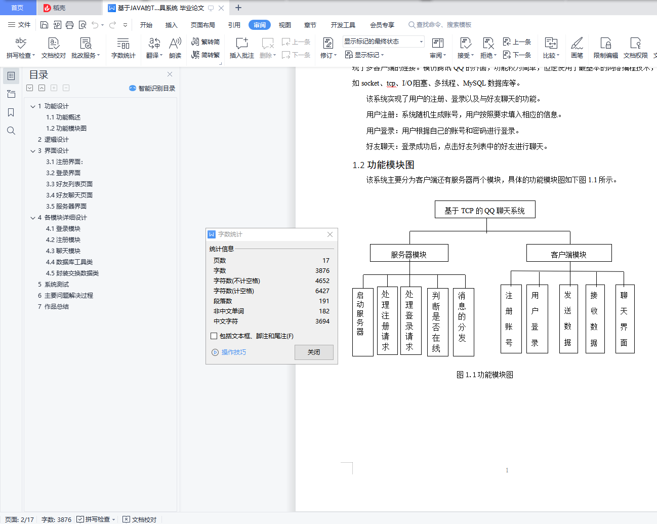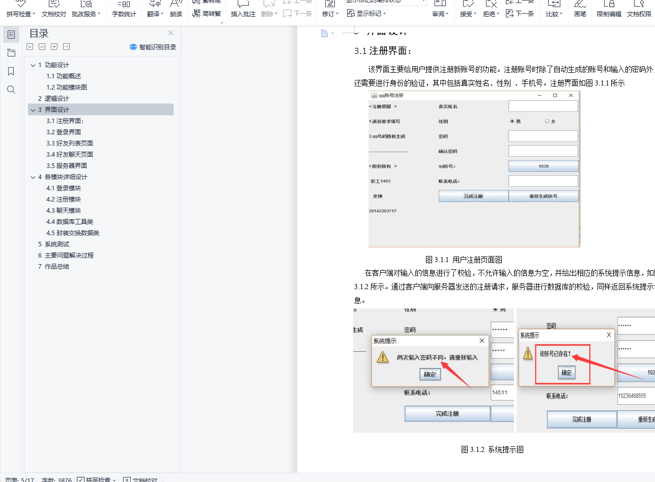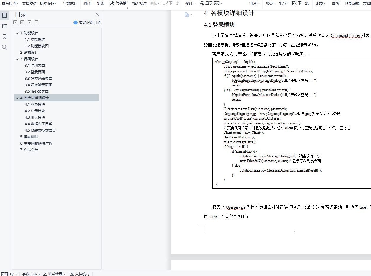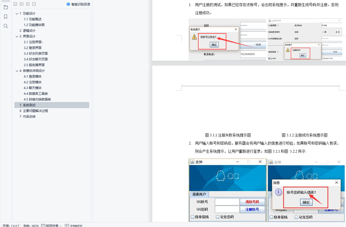 目 录1 功能设计 11.1功能概述 11.2功能模块图 12 逻辑设计 23 界面设计 43.1注册界面: 43.2登录界面 53.3好友列表页面 53.4好友聊天页面 63.5服务器界面 74 各模块详细设计 74.1登录模块 74.2注册模块 94.3聊天模块 104.4数据库工具类 124.5封装的数据交换类 125 系统测试 136 主要问题解决过程 157 作品总结 161 功能设计1.1功能概述该系统是基于JAVA语言开发的一款网络聊天工具,通过Socket实现TCP编程,使用多线程实现了多客户端的连接。模仿腾讯QQ的界面,功能较为简单,但是使用了最基本的网络编程技术,如socket、tcp、I/O阻塞、多线程、MySQL数据库等。该系统实现了用户的注册、登录以及与好友聊天的功能。用户注册:系统随机生成账号,用户按照要求填入相应的信息。用户登录:用户根据自己的账号和密码进行登录。好友聊天:登录成功后,点击好友列表中的好友进行聊天。