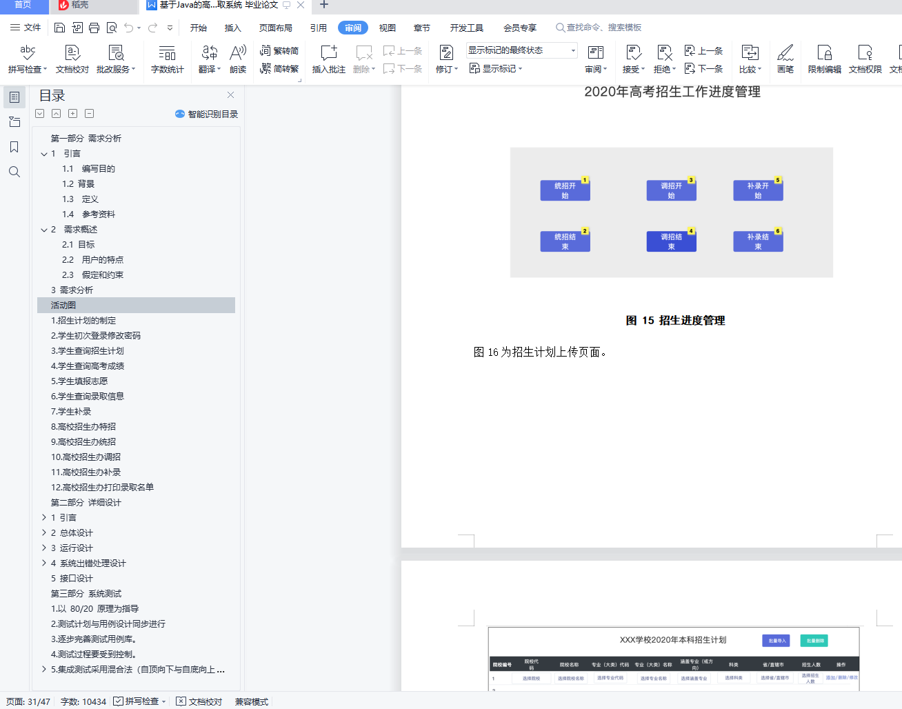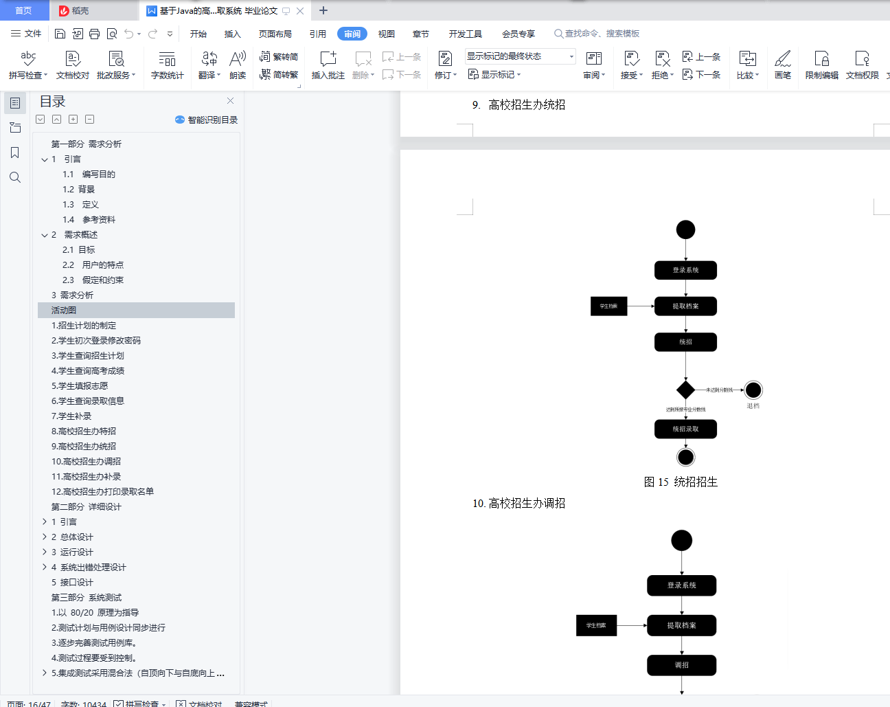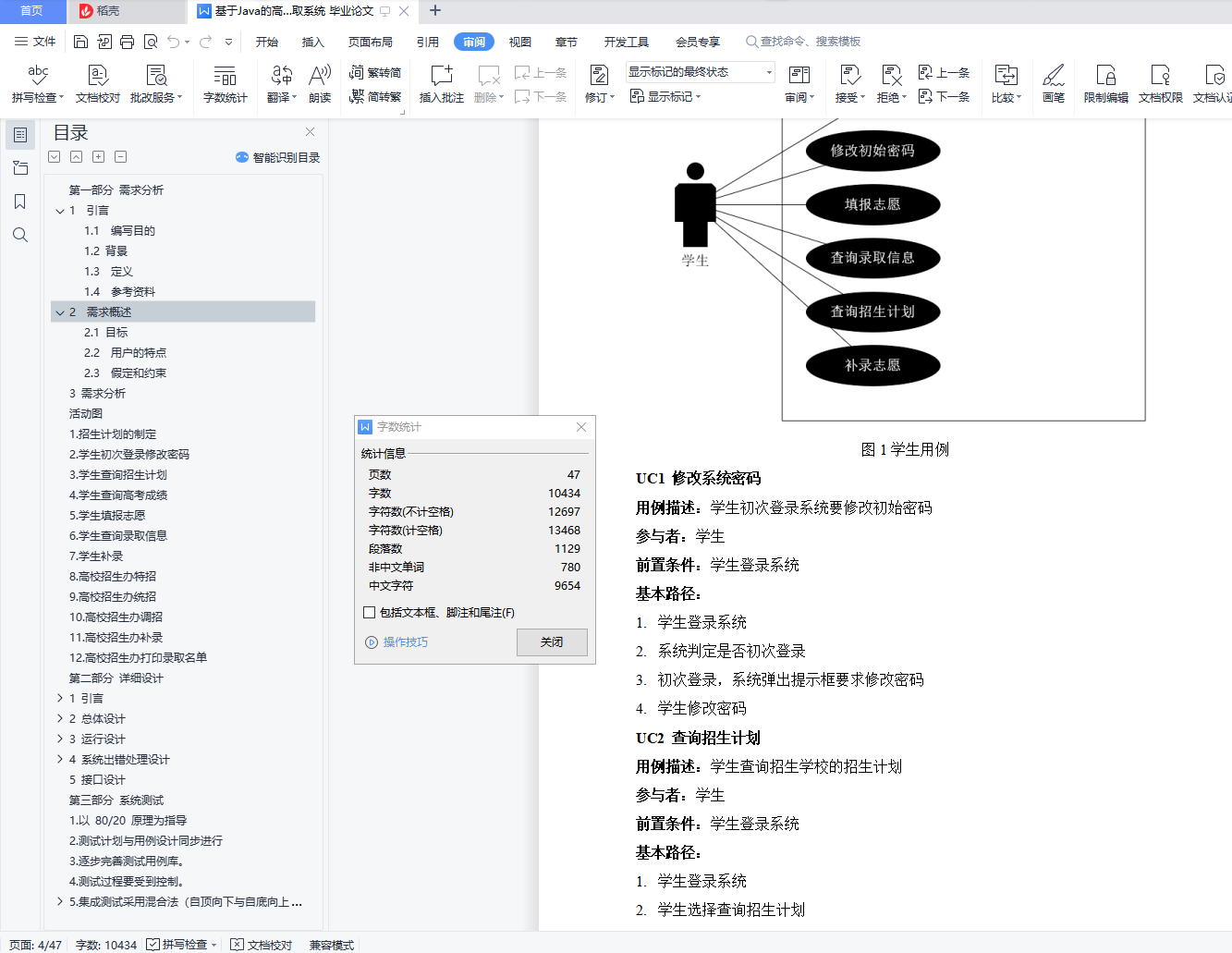 目录第一部分 需求分析 21 引言 21.1 编写目的 21.2 背景 21.3 定义 21.4 参考资料 22 需求概述 22.1 目标 22.2 用户的特点 32.3 假定和约束 33 需求分析 3活动图 121. 招生计划的制定 122. 学生初次登录修改密码 133. 学生查询招生计划 134. 学生查询高考成绩 145. 学生填报志愿 146. 学生查询录取信息 157. 学生补录 158. 高校招生办特招 169. 高校招生办统招 1610. 高校招生办调招 1711. 高校招生办补录 1712. 高校招生办打印录取名单 18第二部分 详细设计 201 引言 201.1 编写目的 20本文档的预期读者为: 201)项目的责任人和管理者; 202)参与概要设计和需求确认的有关业务人员; 203)项目的开发人员、测试人员; 201.2 背景 211.3 定义 211.4 参考资料 212 总体设计 212.1 设计概述 212.2 运行环境 222.3 系统的结构设计 232.4 问题域类模型 252.5 系统的界面设计 282.6 数据存储设计 332.7 尚未解决的问题 363 运行设计 363.1 运行模块组合 363.2 运行控制 363.3 运行时间 374 系统出错处理设计 374.1 出错信息 374.2 补救措施 384.3 系统维护设计 395 接口设计 39第三部分 系统测试 401. 以 80/20 原理为指导 442. 测试计划与用例设计同步进行 443. 逐步完善测试用例库。 444. 测试过程要受到控制。 445. 集成测试采用混合法(自顶向下与自底向上相结合)进行测试 44 硬件需求 48第一部分 需求分析1 引言1.1 编写目的编写需求分析报告的目的在于记录本次系统开发中所收集到的需求情况,并指导以后的软件设计阶段。本说明书主要给小组开发人员做开发指导,作为用户与开发人员交流的依据,读者为开发人员和用户。1.2 背景开发软件名称:考试招生录取系统用户:各省市高考考生,国家招生管理部门和各大高校招生办提出和编写人员:本项目由软件协同设计教师赵逢禹老师提出,由开发小组开发。1.3 定义统招:高中毕业报考大学的考生依照《全国普通高等学校(普通中等专业学校)招生计划》经过选拔考试后统一录取的招生形式;特招:按照国家相关文件规定,对具有一定技艺特长,且达到国家规定标准的学生实行特定的招收政策,特长生可以享受一定范围内的降分招录的待遇;调招:统招基础上,考生选择服从调剂后,被调剂到其他专业录取;补录:一些院校在第一次招生的时候没有招满学生,进行的第二次录取;退档:当录取工作完成以后,系统必须要退档(即将未录取的考试档案退还给招生办);