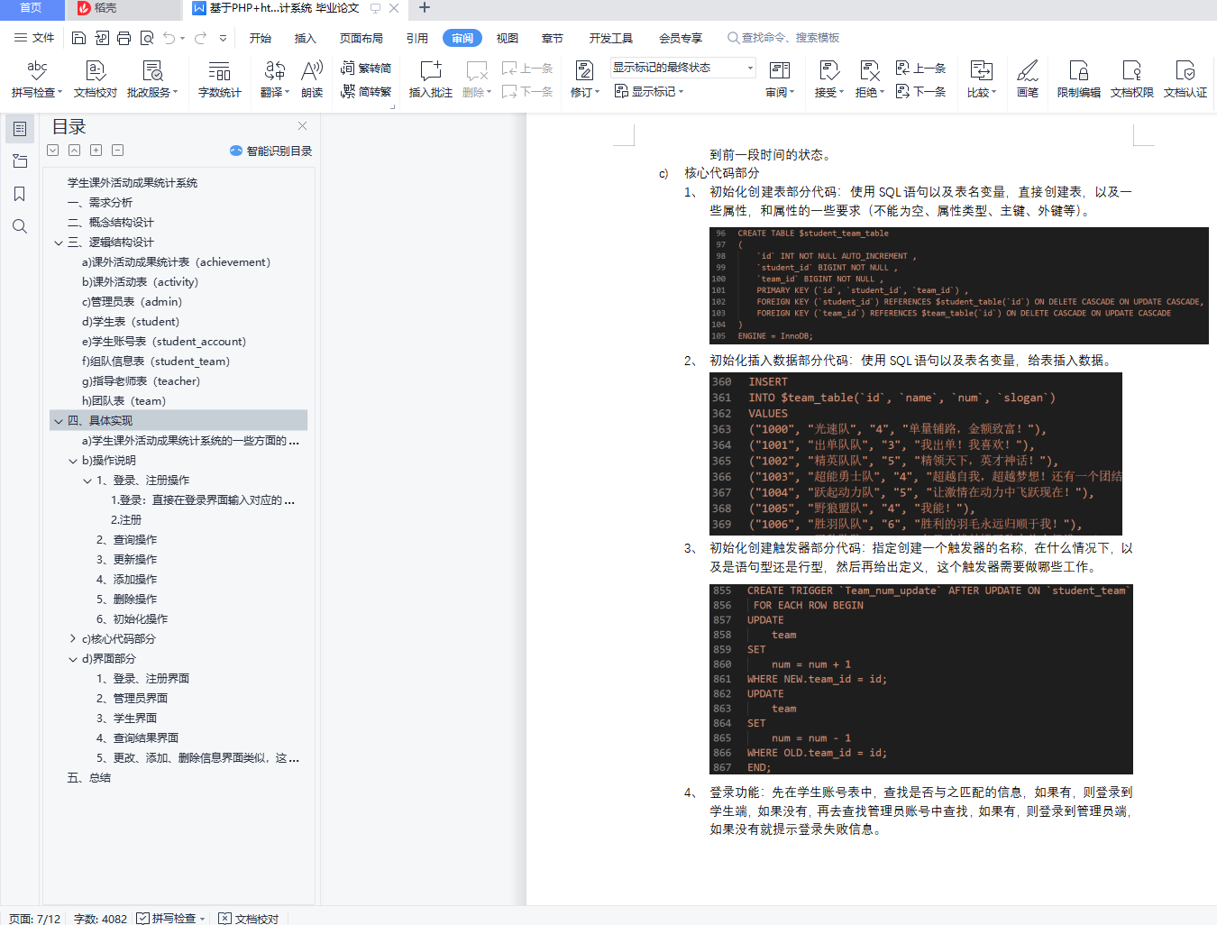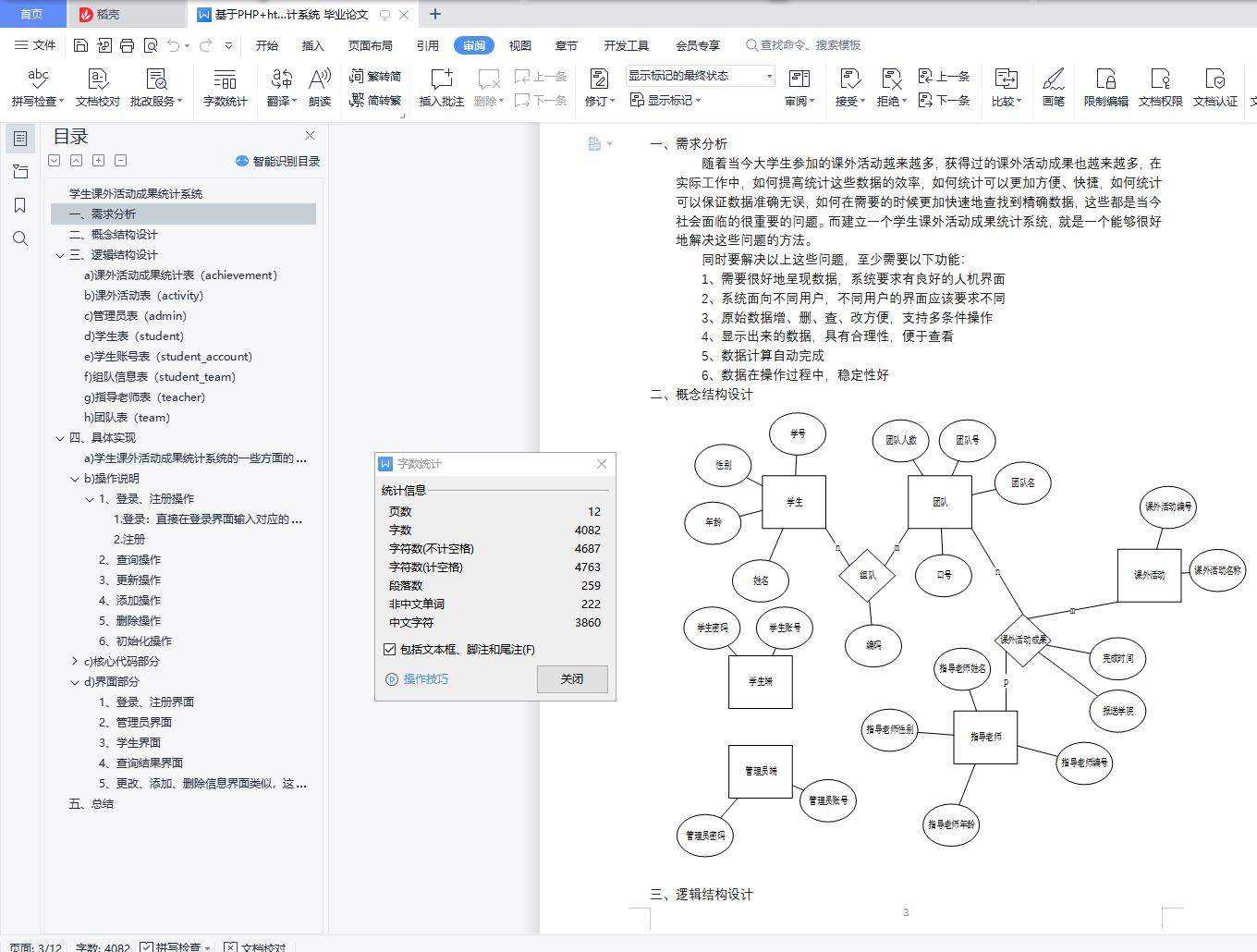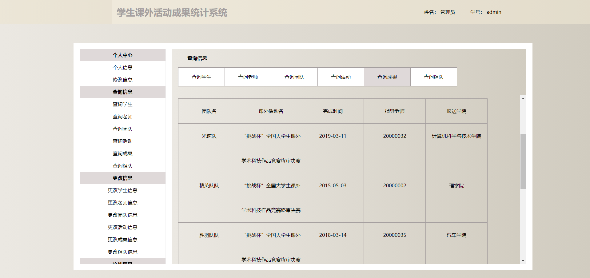 目录学生课外活动成果统计系统 3一、需求分析 3二、概念结构设计 3三、逻辑结构设计 3a) 课外活动成果统计表(achievement) 3b) 课外活动表(activity) 4c) 管理员表(admin) 4d) 学生表(student) 4e) 学生账号表(student_account) 4f) 组队信息表(student_team) 5g) 指导老师表(teacher) 5h) 团队表(team) 5四、具体实现 5a) 学生课外活动成果统计系统的一些方面的数据控制功能 5b) 操作说明 51、登录、注册操作 52、查询操作 63、更新操作 64、添加操作 65、删除操作 66、初始化操作 6c) 核心代码部分 71、初始化创建表部分代码 72、初始化插入数据部分代码 73、初始化创建触发器部分代码 74、登录功能 75、检查规范问题 86、注册功能 87、切换学生端和管理员端 88、查询功能 89、更新功能 810、插入功能 811、删除功能 912、记录报错信息 913、检查URL功能 914、获取当前登录信息功能 10d) 界面部分 101、登录、注册界面 102、管理员界面 103、学生界面 114、查询结果界面 115、更改、添加、删除信息界面类似,这里以更改界面为例 11五、总结 11学生课外活动成果统计系统一、需求分析随着当今大学生参加的课外活动越来越多,获得过的课外活动成果也越来越多,在实际工作中,如何提高统计这些数据的效率,如何统计可以更加方便、快捷,如何统计可以保证数据准确无误,如何在需要的时候更加快速地查找到精确数据,这些都是当今社会面临的很重要的问题。而建立一个学生课外活动成果统计系统,就是一个能够很好地解决这些问题的方法。同时要解决以上这些问题,至少需要以下功能:1、需要很好地呈现数据,系统要求有良好的人机界面2、系统面向不同用户,不同用户的界面应该要求不同3、原始数据增、删、查、改方便,支持多条件操作4、显示出来的数据,具有合理性,便于查看5、数据计算自动完成6、数据在操作过程中,稳定性好