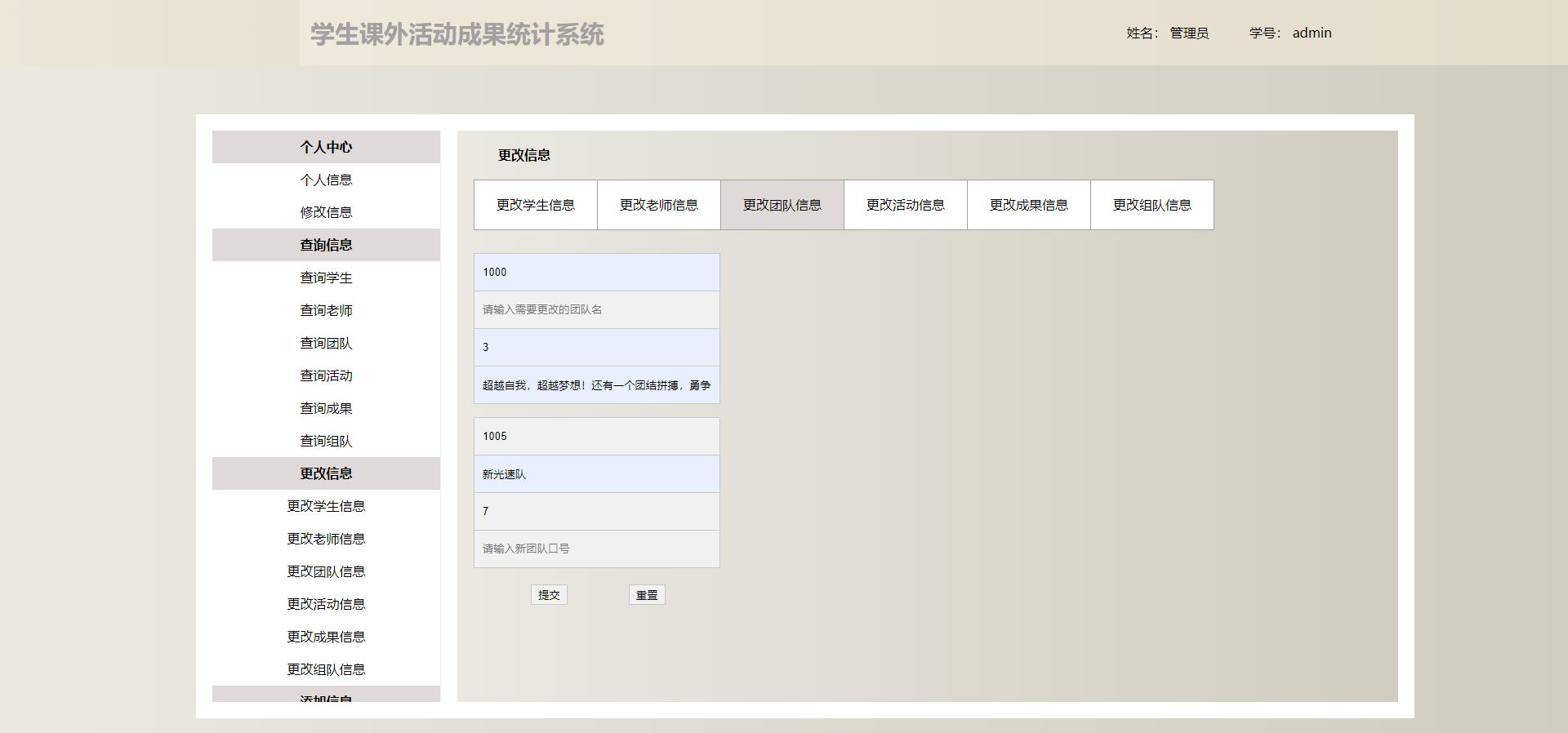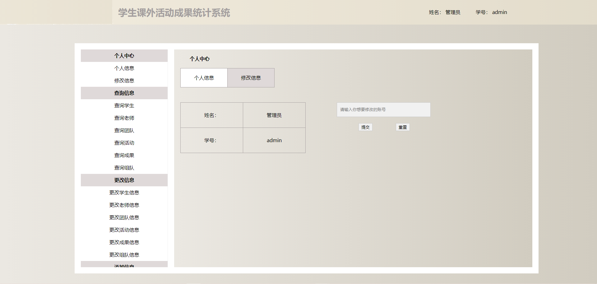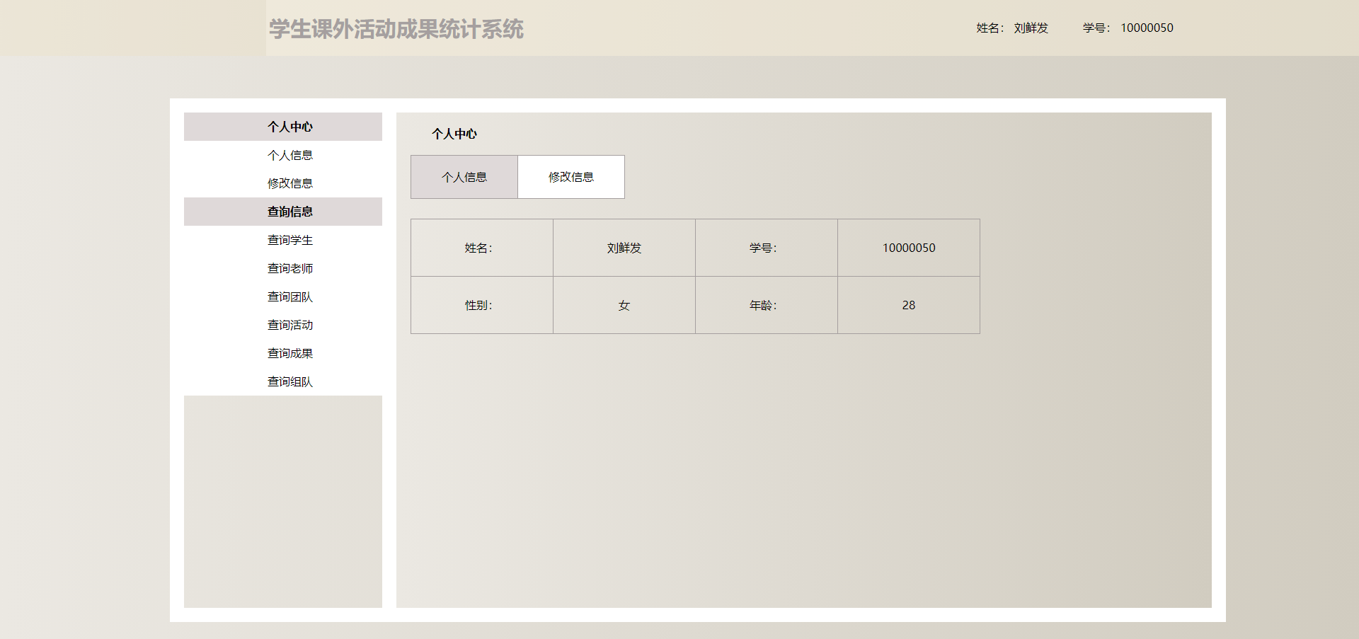 目录学生课外活动成果统计系统 3一、需求分析 3二、概念结构设计 3三、逻辑结构设计 3a) 课外活动成果统计表(achievement) 3b) 课外活动表(activity) 4c) 管理员表(admin) 4d) 学生表(student) 4e) 学生账号表(student_account) 4f) 组队信息表(student_team) 5g) 指导老师表(teacher) 5h) 团队表(team) 5四、具体实现 5a) 学生课外活动成果统计系统的一些方面的数据控制功能 5b) 操作说明 51、登录、注册操作 52、查询操作 63、更新操作 64、添加操作 65、删除操作 66、初始化操作 6c) 核心代码部分 71、初始化创建表部分代码 72、初始化插入数据部分代码 73、初始化创建触发器部分代码 74、登录功能 75、检查规范问题 86、注册功能 87、切换学生端和管理员端 88、查询功能 89、更新功能 810、插入功能 811、删除功能 912、记录报错信息 913、检查URL功能 914、获取当前登录信息功能 10d) 界面部分 101、登录、注册界面 102、管理员界面 103、学生界面 114、查询结果界面 115、更改、添加、删除信息界面类似,这里以更改界面为例 11五、总结 11学生课外活动成果统计系统一、需求分析随着当今大学生参加的课外活动越来越多,获得过的课外活动成果也越来越多,在实际工作中,如何提高统计这些数据的效率,如何统计可以更加方便、快捷,如何统计可以保证数据准确无误,如何在需要的时候更加快速地查找到精确数据,这些都是当今社会面临的很重要的问题。而建立一个学生课外活动成果统计系统,就是一个能够很好地解决这些问题的方法。同时要解决以上这些问题,至少需要以下功能:1、需要很好地呈现数据,系统要求有良好的人机界面2、系统面向不同用户,不同用户的界面应该要求不同3、原始数据增、删、查、改方便,支持多条件操作4、显示出来的数据,具有合理性,便于查看5、数据计算自动完成6、数据在操作过程中,稳定性好