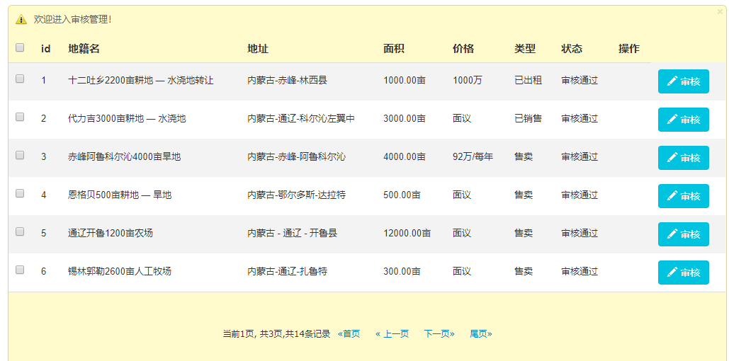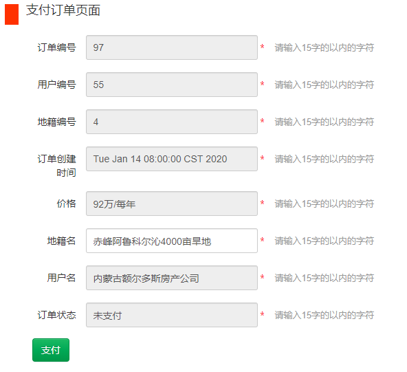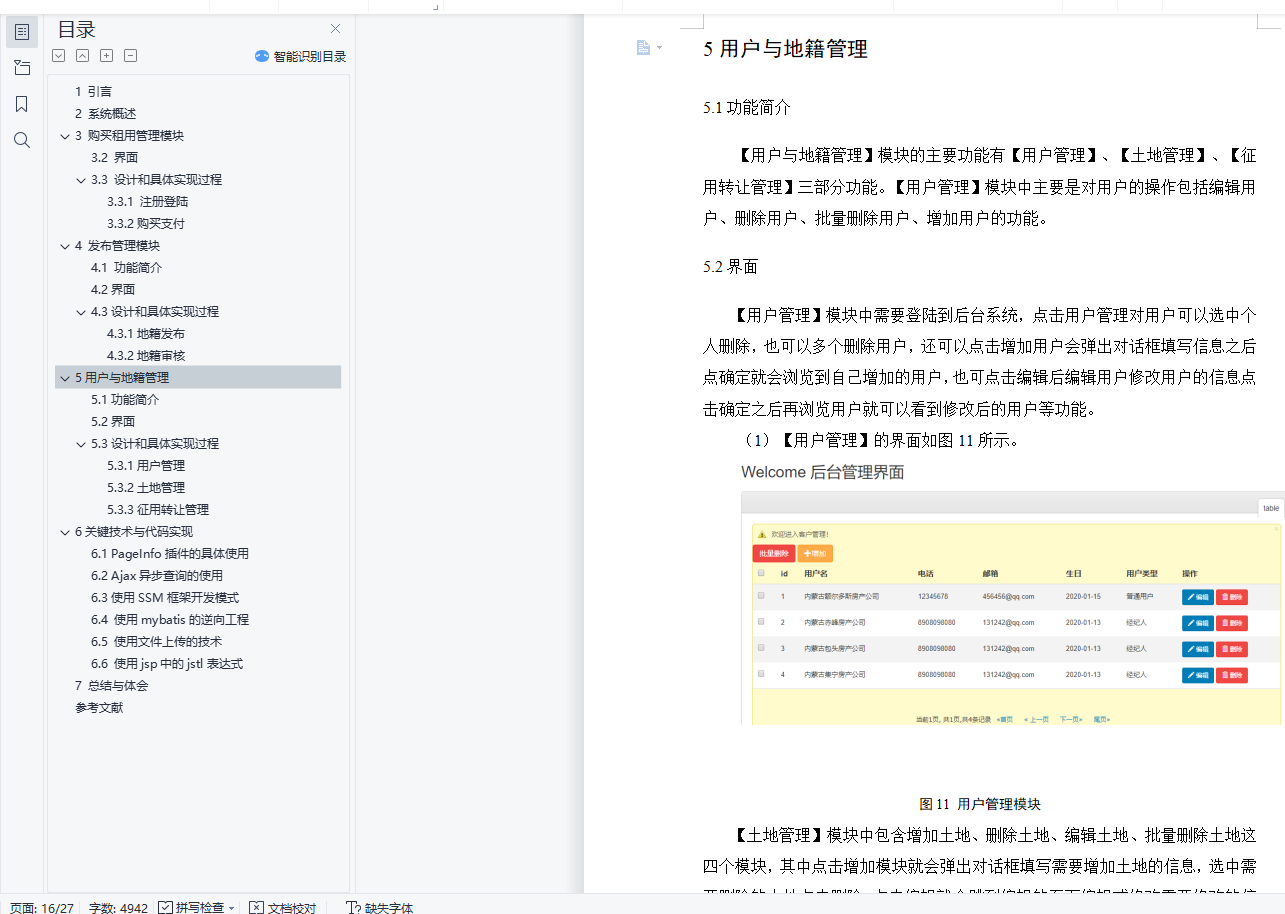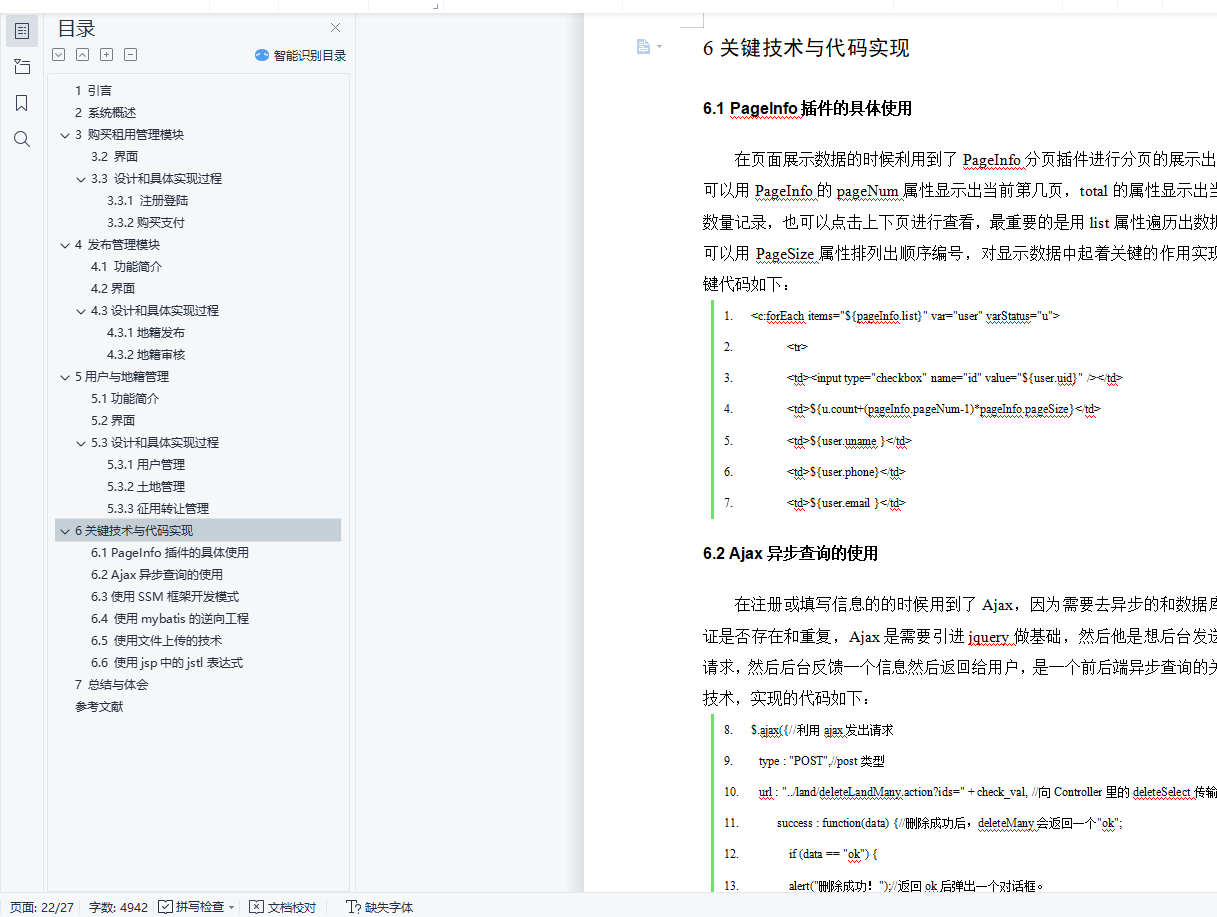 基于SSM的房产局地籍登记与管理系统设计与实现摘要:房产局地籍登记与管理系统是一个面向社会的地籍交易平台,用于发布土地信息和购买土地等一些基本的交易模块。本系统是基于SSM开源框架的一个地籍交易的系统,此系统是通过java,jsp,javaScript,jQuery等语言实现的。其功能包括用户注册登陆,发布地籍,购买商品,出租地籍,地籍管理,用户管理,审核管理等。本文着重讨论系统模块组成设计,数据处理流程。关键词 房产局地籍登记与管理系统;地籍发布;购买Abstract: The cadastral registration and management system of the Real Estate Bureau is a society-oriented cadastral trading platform for some basic trading modules such as publishing land information and land purchase.This system is a system of cadastral transactions based on the SSM open-source framework, which is implemented in the languages java, jsp, javaScript, jQuery, etc.Its functions include user registration and landing, cadastral release, commodity purchase, rental cadastral registration, cadastral management, user management, audit management, etc.This paper focuses on the composition design of the system module, and the data processing process.Key words of real estate bureau cadastral registration and management system; cadastral release; purchase目 录1 引言 12 系统概述 23 购买租用管理模块 33.2 界面 43.3 设计和具体实现过程 63.3.1 注册登陆 63.3.2购买支付 74 发布管理模块 94.1 功能简介 94.2界面 94.3设计和具体实现过程 104.3.1地籍发布 104.3.2地籍审核 115用户与地籍管理 125.1功能简介 125.2界面 125.3设计和具体实现过程 145.3.1用户管理 145.3.2土地管理 155.3.3征用转让管理 166关键技术与代码实现 186.1 PageInfo插件的具体使用 186.2 Ajax异步查询的使用 186.3使用SSM框架开发模式 196.4 使用mybatis的逆向工程 196.5 使用文件上传的技术 216.6 使用jsp中的jstl表达式 217 总结与体会 22参考文献 23