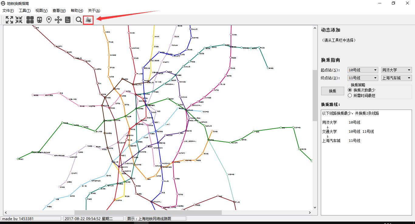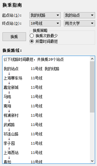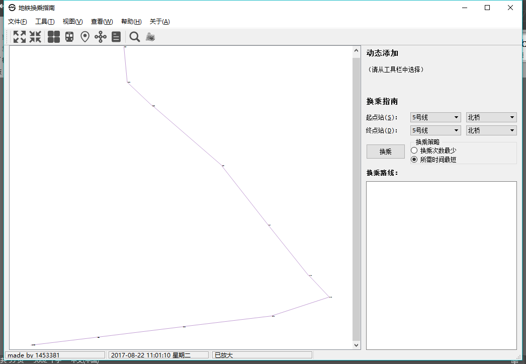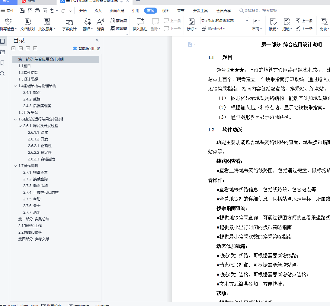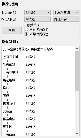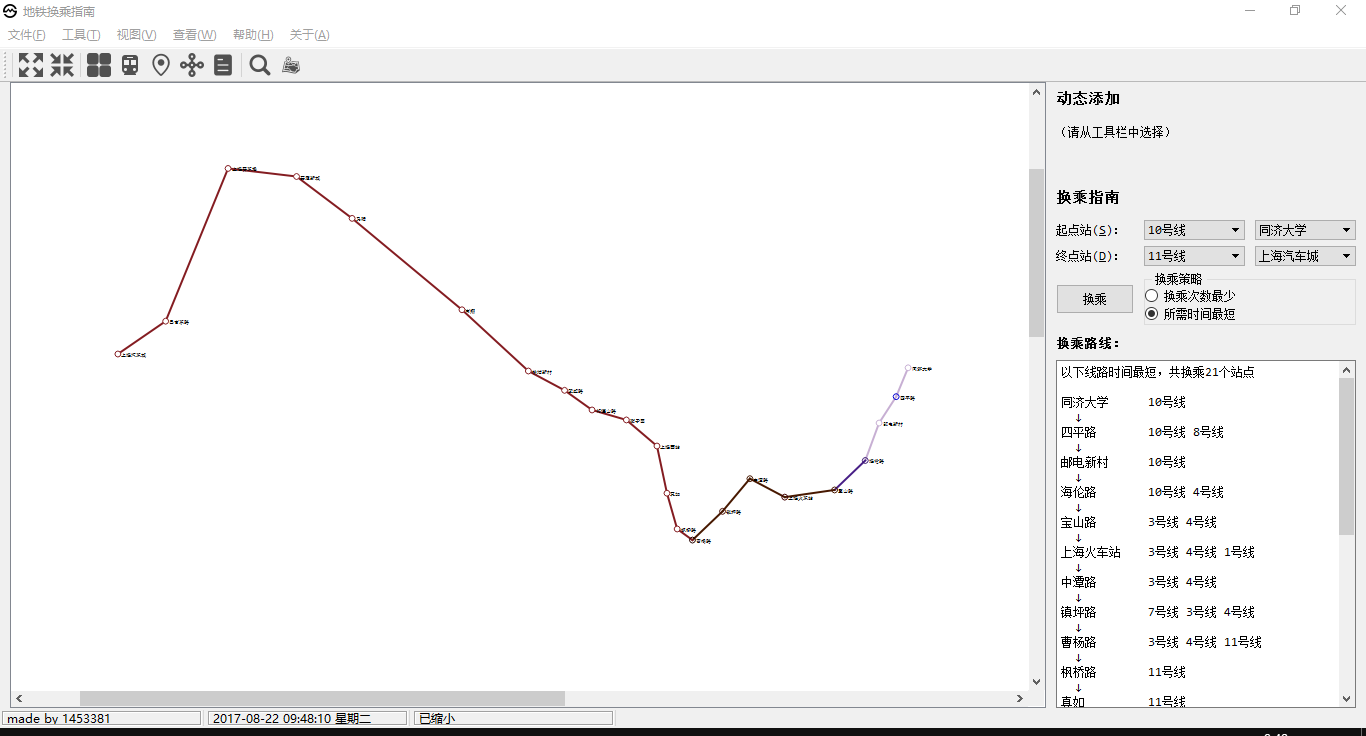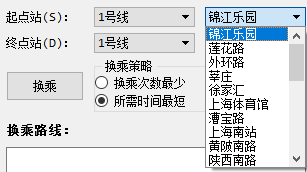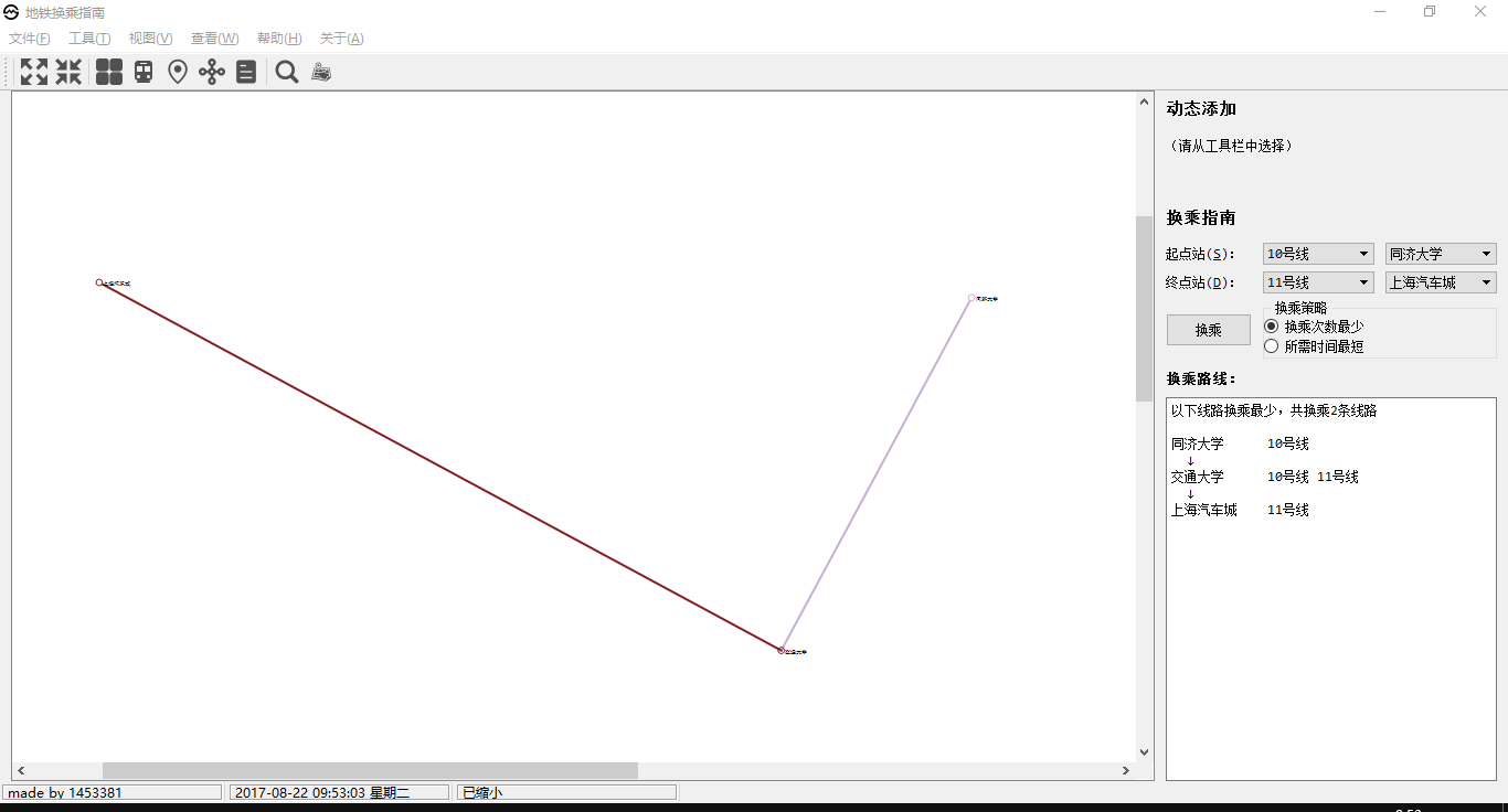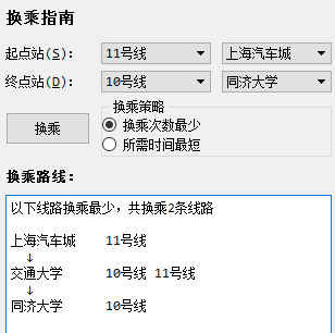 目录第二部分 综合应用设计说明 11.1 题目 11.2 软件功能 11.3 设计思想 11.4 逻辑结构与物理结构 32.4.1 站点 42.4.2 线路 42.4.3 后端实现类 51.5 开发平台 71.6 系统的运行结果分析说明 72.6.1 调试及开发过程 72.6.1.1 调试 82.6.1.2 开发 82.6.2.1 正确性 92.6.2.2 稳定性 152.6.2.3 容错能力 151.7 操作说明 172.7.1 视图查看 172.7.2 换乘查询 192.7.3 动态添加 222.7.4 工具栏和状态栏 262.7.5 帮助 262.7.6 关于 272.7.7 退出 27第三部分 实践总结 282.1 所做的工作 282.2 总结和收获 28第四部分 参考文献 28第一部分 综合应用设计说明11.1题目题号2★★★:上海的地铁交通网络已经基本成型,建成的地铁线十多条,站点上百个,现需建立一个换乘指南打印系统,通过输入起点和终点站,打印出地铁换乘指南,指南内容包括起点站、换乘站、终点站。(1)图形化显示地铁网络结构,能动态添加地铁线路和地铁站点。(2)根据输入起点和终点站,显示地铁换乘指南。(3)通过图形界面显示乘除路径。1.2软件功能功能主要功能包含地铁网络线路的查看,地铁换乘指南查询,动态添加线路站点等。线路图查看:●查看上海地铁网络线路图,包括通过键盘、鼠标拖放、放大缩小等简易查看操作;●查看地铁线路信息,包括线路段、包含站点等;●查看地铁站的详细信息,包括站点地理坐标、所属线路等换乘指南查询:●提供地铁换乘查询,可通过视图方便的查看乘坐路线和换乘路线;●提供最小出行时间的换乘策略指南●提供最小换乘次数的换乘策略指南动态添加线路:●动态添加线路,可根据需要新增线路;●动态添加站点,可根据需要新增站点;●动态添加连接,可根据需要新增站点连接;●文本方式简易添加,方便快捷;