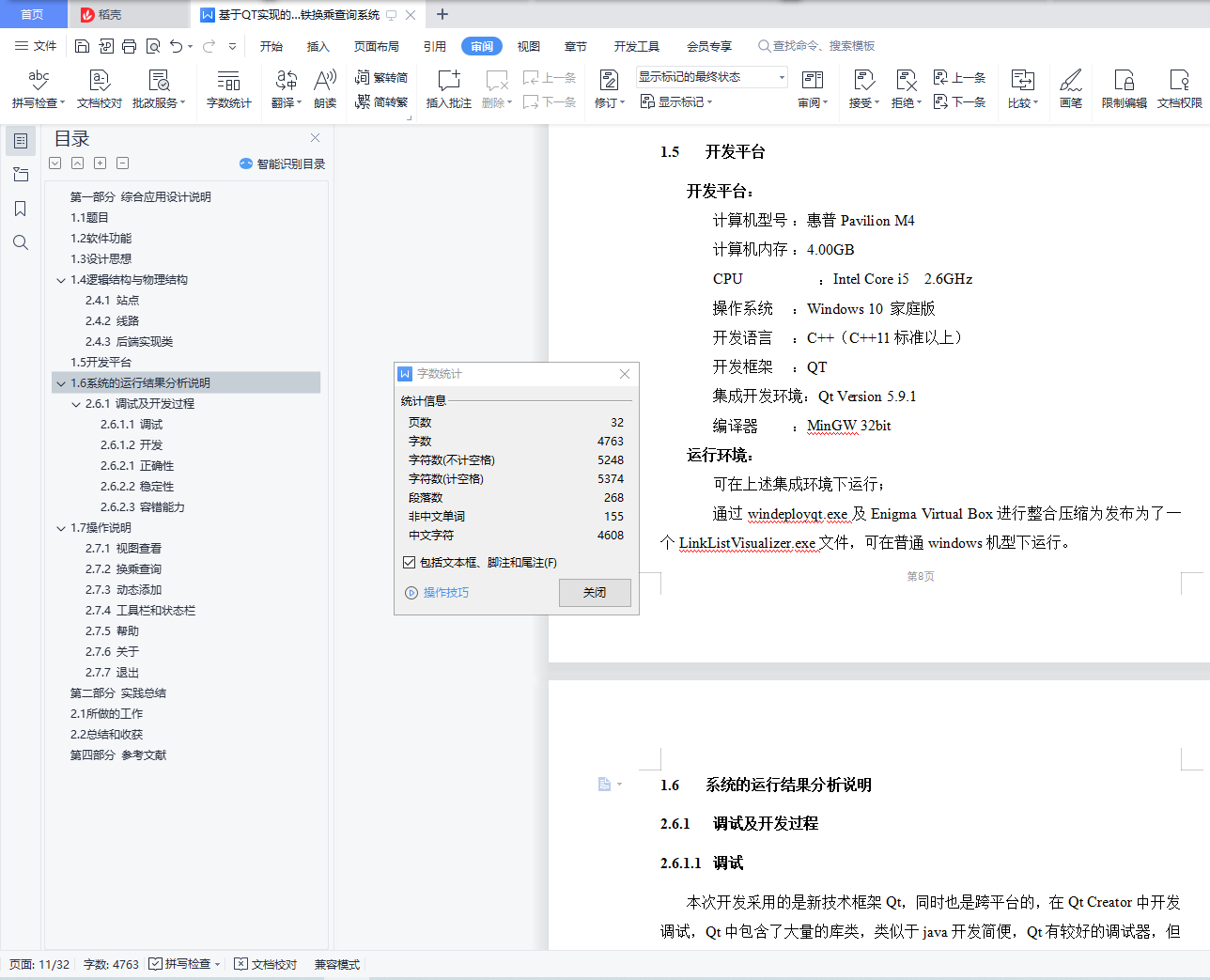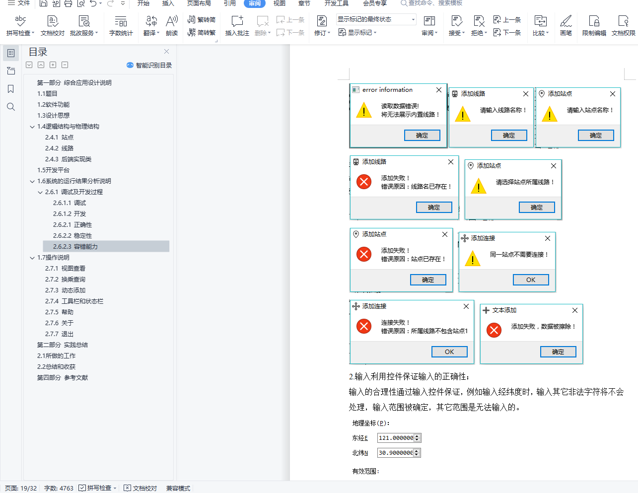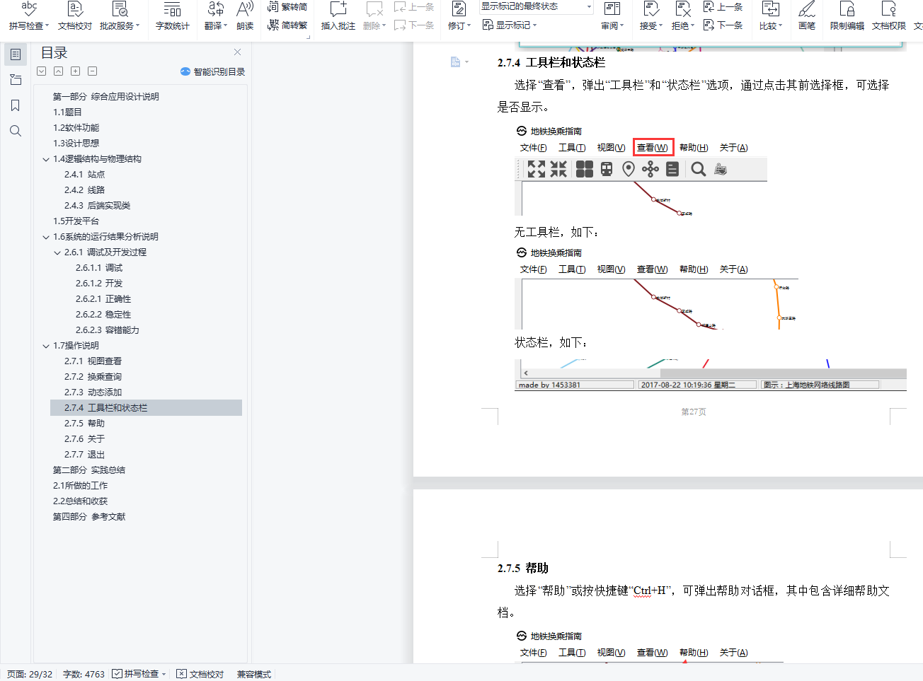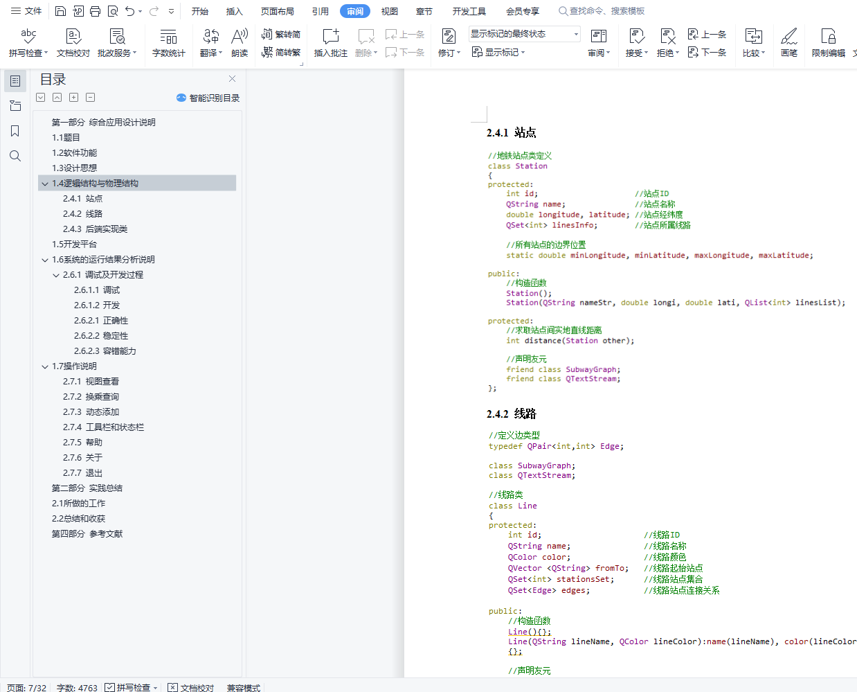 目录第二部分 综合应用设计说明 11.1 题目 11.2 软件功能 11.3 设计思想 11.4 逻辑结构与物理结构 32.4.1 站点 42.4.2 线路 42.4.3 后端实现类 51.5 开发平台 71.6 系统的运行结果分析说明 72.6.1 调试及开发过程 72.6.1.1 调试 82.6.1.2 开发 82.6.2.1 正确性 92.6.2.2 稳定性 152.6.2.3 容错能力 151.7 操作说明 172.7.1 视图查看 172.7.2 换乘查询 192.7.3 动态添加 222.7.4 工具栏和状态栏 262.7.5 帮助 262.7.6 关于 272.7.7 退出 27第三部分 实践总结 282.1 所做的工作 282.2 总结和收获 28第四部分 参考文献 28第一部分 综合应用设计说明11.1题目题号2★★★:上海的地铁交通网络已经基本成型,建成的地铁线十多条,站点上百个,现需建立一个换乘指南打印系统,通过输入起点和终点站,打印出地铁换乘指南,指南内容包括起点站、换乘站、终点站。(1)图形化显示地铁网络结构,能动态添加地铁线路和地铁站点。(2)根据输入起点和终点站,显示地铁换乘指南。(3)通过图形界面显示乘除路径。1.2软件功能功能主要功能包含地铁网络线路的查看,地铁换乘指南查询,动态添加线路站点等。线路图查看:●查看上海地铁网络线路图,包括通过键盘、鼠标拖放、放大缩小等简易查看操作;●查看地铁线路信息,包括线路段、包含站点等;●查看地铁站的详细信息,包括站点地理坐标、所属线路等换乘指南查询:●提供地铁换乘查询,可通过视图方便的查看乘坐路线和换乘路线;●提供最小出行时间的换乘策略指南●提供最小换乘次数的换乘策略指南动态添加线路:●动态添加线路,可根据需要新增线路;●动态添加站点,可根据需要新增站点;●动态添加连接,可根据需要新增站点连接;●文本方式简易添加,方便快捷;