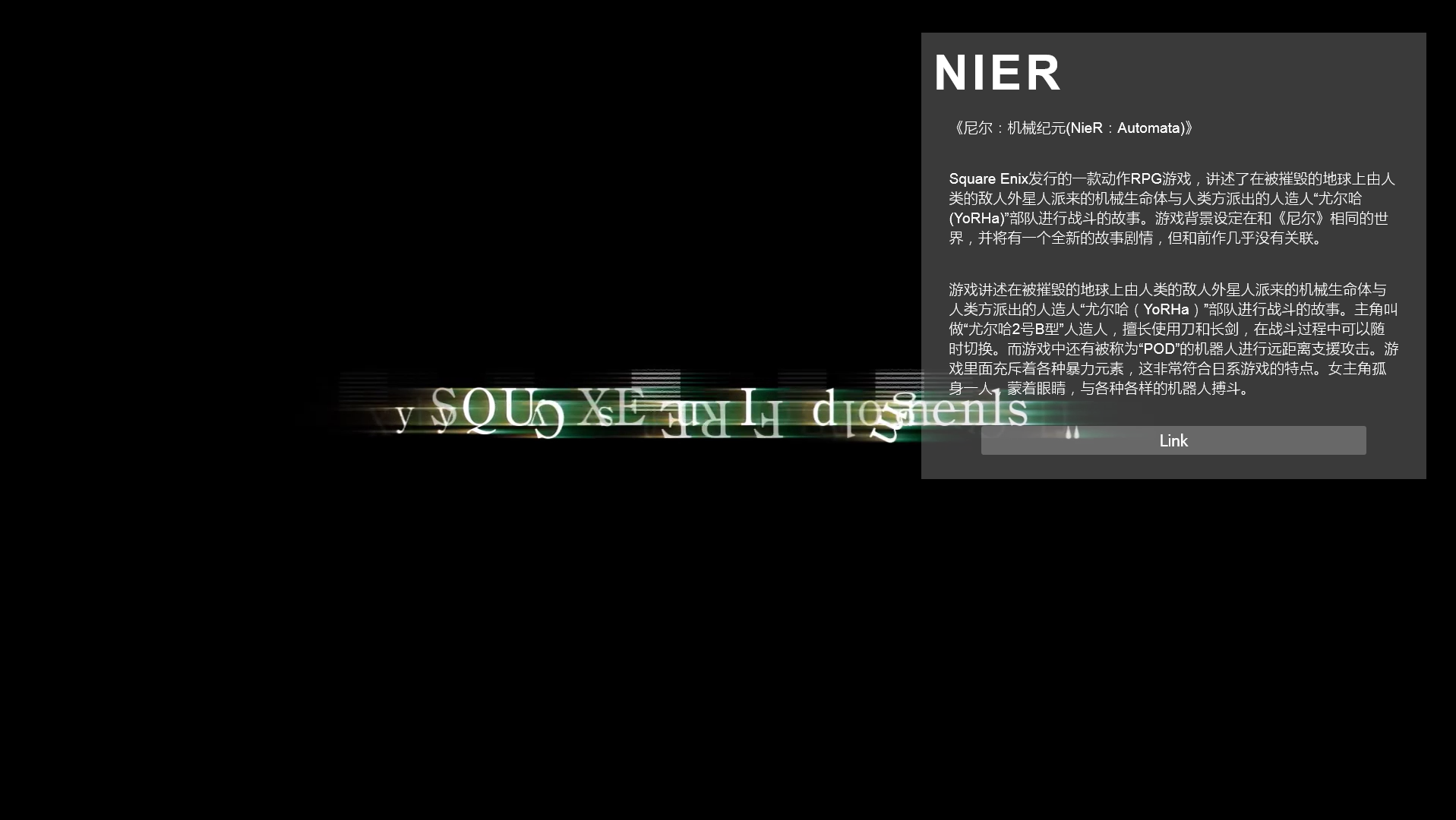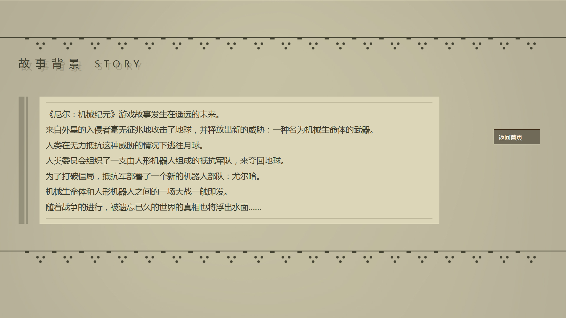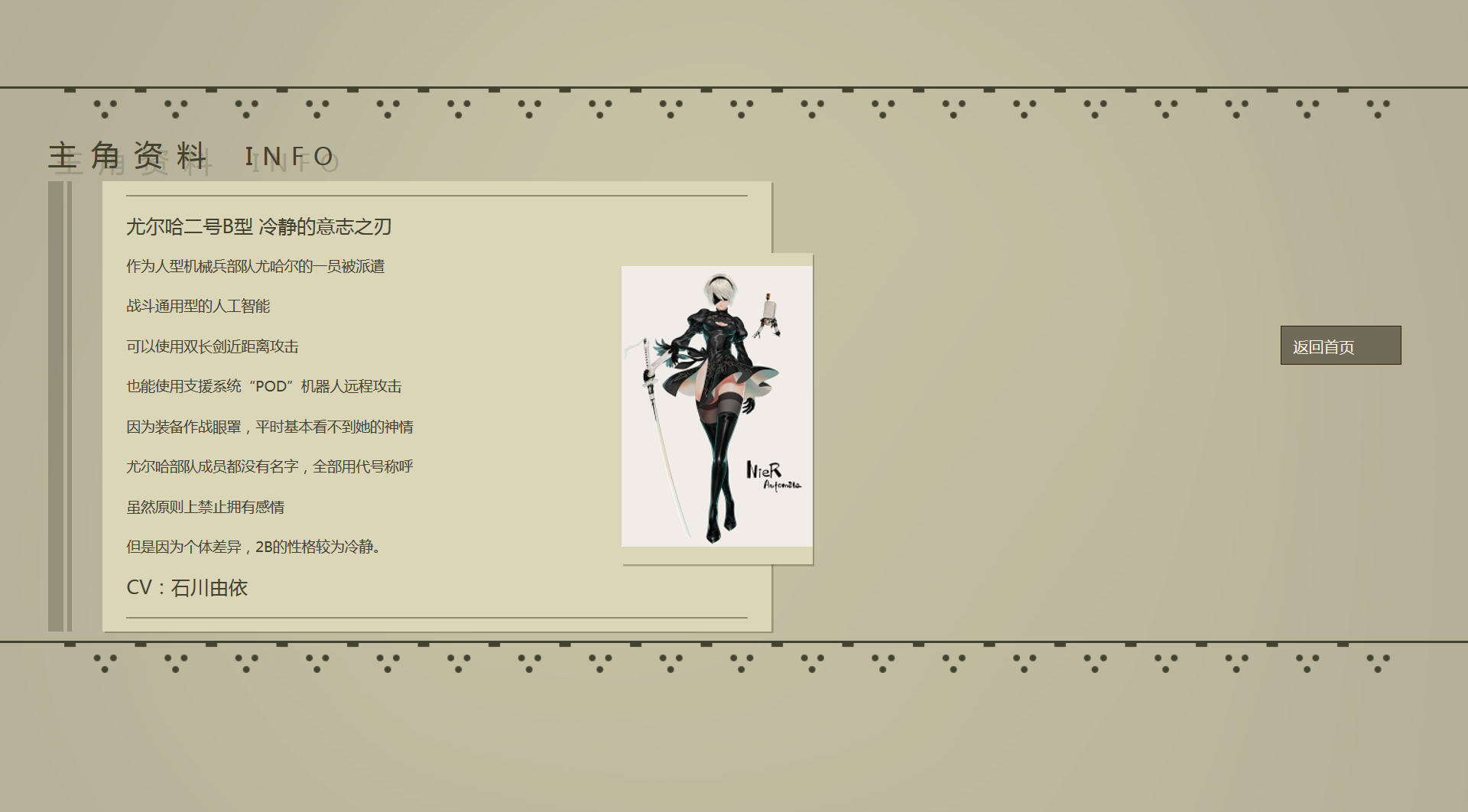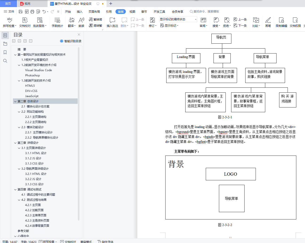 大观园:尼尔机械纪元篇摘 要大观园系列是游民星空出品的向广大用户提供了解新上市游戏的方便途径,上玩家直观的看到游戏界面,内容,人物设定,剧情等重要信息,促使玩家购买。提供方便的同时,也增加了网站浏览量。大观园:尼尔机械纪元篇是为了2017-03-17上市的游戏《尼尔机械纪元》制作的网页,以文字及视频的方式介绍了游戏的背景故事,主角资料。同时提供了正版游戏购买链接。美观的界面设计是本次设计的重点,为了让玩家有良好的用户体验,对网页排版,UI交互,做了精心的设计。尽量达到模仿游戏内交互界面的样式。关键词:尼尔:机械纪元 游戏介绍类网页 UI设计 视觉效果目 录摘 要 I第一章 网站开发的背景知识与相关技术 11.1 相关产业背景知识 11.2 前端开发环境的技术介绍 2Visual Studios Code 2Photoshop 41.3 前端开发的技术介绍 5HTML5 5DIV+CSS 6JavaScript 7第二章 总体设计 92.1 模块化设计总方案 92.2 网站功能结构 92.2.1主页面结构 92.2.2主页面结构 92.3 模块功能设计 102.3.1 主页模块化设计 102.3.2 导航菜单模块化设计 11第三章 详细设计 133.1主页面详细设计 133.1.1 HTML设计 133.1.2 JS设计 143.1.3 CSS设计 153.2导航界面详细设计 183.2.1 HTML设计 183.2.2 JS设计 223.1.3 CSS设计 25第四章 调试与测试 384.1 调试过程中的主要问题 384.2 测试过程与结果 394.2.1主页面 394.2.2加载页面 404.2.3主菜单页面 414.2.3主角资料页面 414.2.4故事背景页面 41参考文献 43心得体会 44页面的设计方面 44网页视觉效果 44网页的整体布局和导航 44