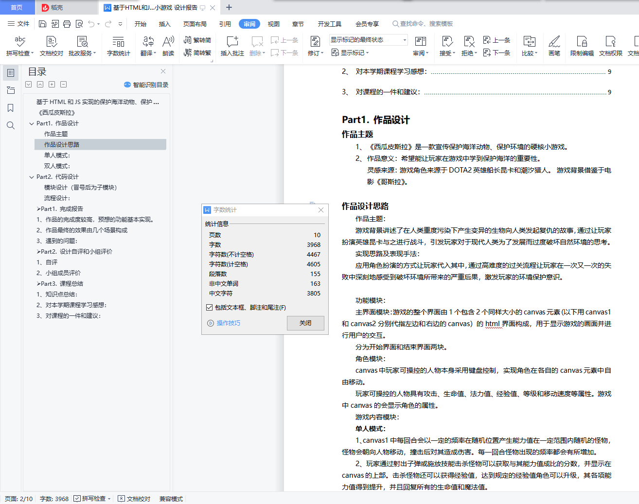 基于HTML和JS实现的保护海洋动物、保护环境的硬核小游戏《西瓜皮斯拉》目录基于HTML和JS实现的保护海洋动物、保护环境的硬核小游戏 1《西瓜皮斯拉》 1Part1. 作品设计 2作品主题 2作品设计思路 2单人模式: 2双人模式: 3Part2. 代码设计 3模块设计(冒号后为子模块) 3流程设计: 3 Part1. 完成报告 81、作品的完成度较高,预想的功能基本实现。 82、作品最终的效果由几个场景构成 83、遇到的问题: 8 Part2. 设计自评和小组评价 81、 自评 82、 小组成员评价 8 Part3. 课程总结 91、 知识点总结: 92、 对本学期课程学习感想: 93、 对课程的一件和建议: 9Part1. 作品设计作品主题1、《西瓜皮斯拉》是一款宣传保护海洋动物、保护环境的硬核小游戏。2、作品意义:希望能让玩家在游戏中学到保护海洋的重要性。灵感来源:游戏角色来源于DOTA2英雄船长昆卡和潮汐猎人。 游戏背景借鉴于电影《哥斯拉》。