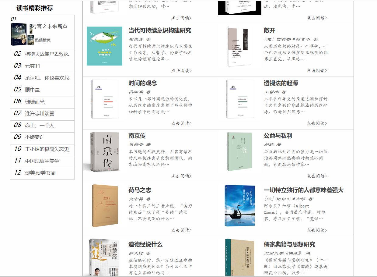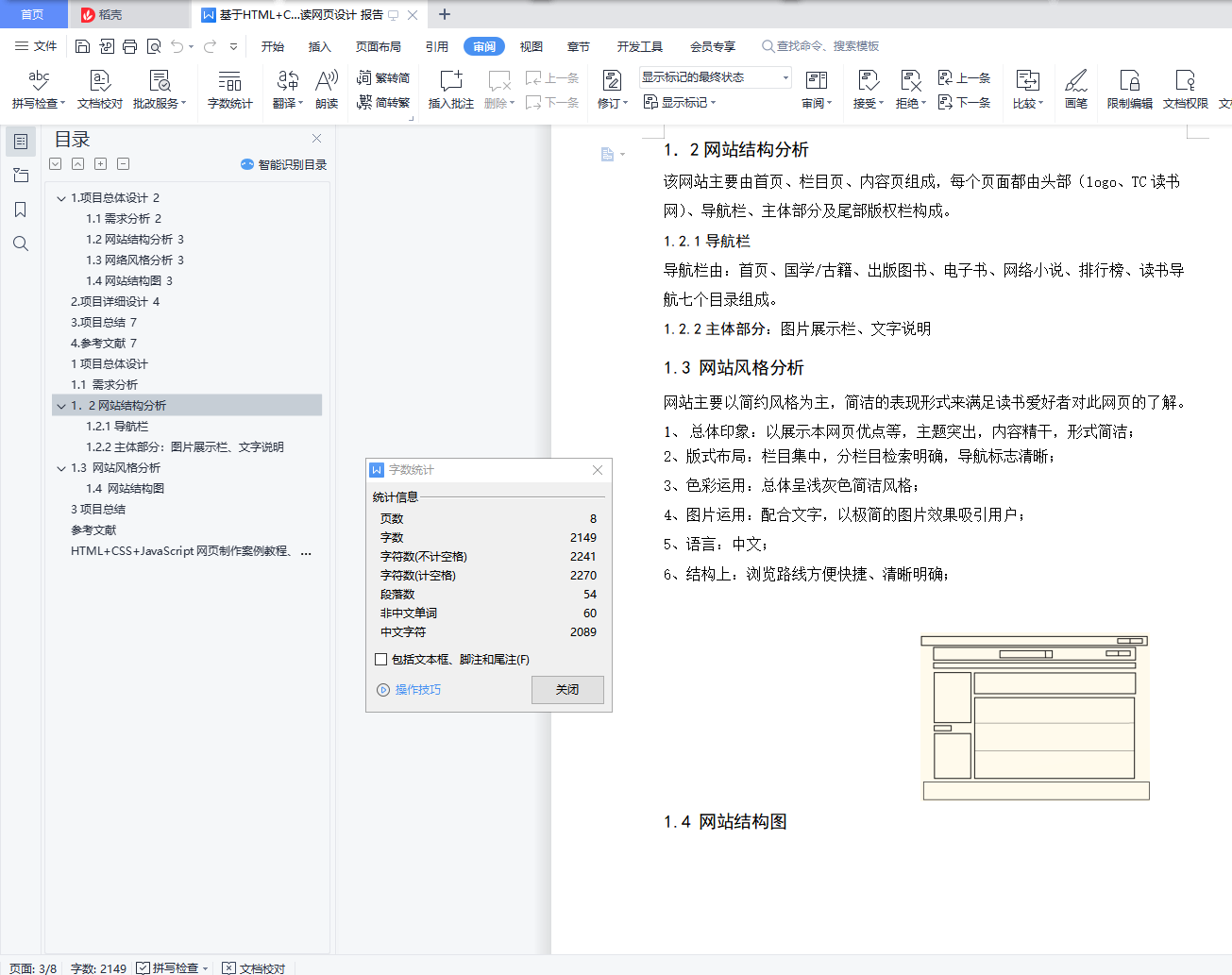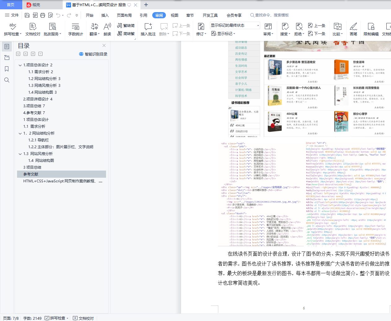 目 录1.项目总体设计 21.1需求分析 21.2网站结构分析 31.2.1导航栏 31.2.2主体部分 31.3网络风格分析 31.4网站结构图 32.项目详细设计 42.1登录页面设计 42.2主页页面设计 52.3在线读书页面设计 63.项目总结 74.参考文献 71项目总体设计1.1 需求分析阐述:这个网页设计我是以“TC读书网”为主题展开,选择这个题目,是因为自己本身就很喜欢看书,喜欢看各种各样的书籍。像很多读书爱好者一样,喜欢在安静的地方静静的看书,比如自己的房间里、图书馆、书店。喜欢把自己生活中的点点滴滴都装扮带有书香的气息。自己在家里的房间里,就装有书架,并摆满了各类书。每次回家我就很喜欢待在房间里,坐在书桌前看书。在这种环境下,能让自己的身心愉悦,心情美美的。自己也养成了坚持看书的习惯,在学校一旦有时间就会去图书馆或自习室看书。在书中不但能学习到很多东西,而且还会让一个人的精神面貌有所不同。在此之前我也浏览了很多读书网页,觉得很有意思。现在学了网页设计,当然也要根据自己的想法来设计自己的网页,同时想通过自己设计的网页,来满足更多读书爱好者的需求,让更多的爱好者在我设计的网页里找到更有意思的东西。