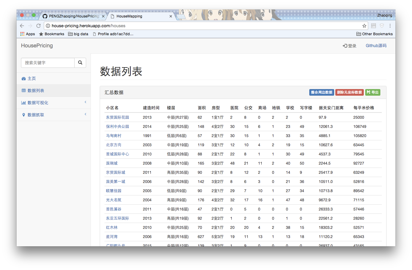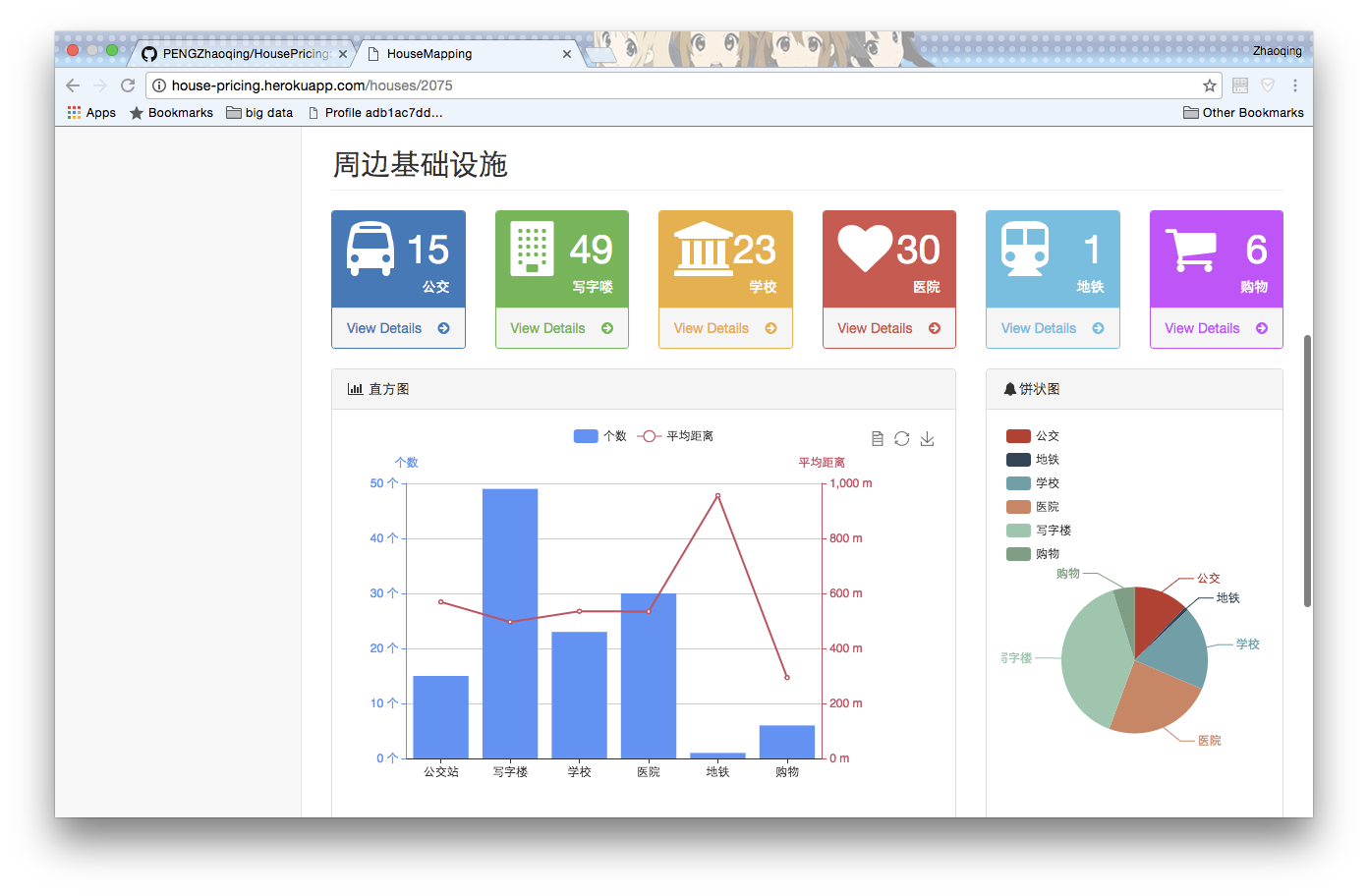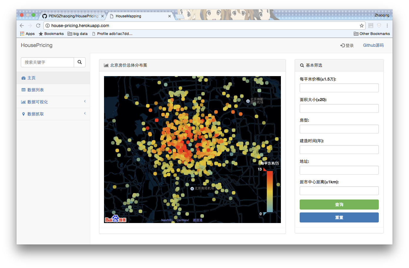 基于python实现的房价的可视化预测系统目录1. 面向用户(买房者、卖房者) 12. 面向开发者(数据挖掘工程师,数据可视化分析师等) 13.项目设计 23.1. 数据挖掘 (Done) 23.2. 建立模型对数据进行分析(Under Construction) 23.3. 数据可视化(Partial done) 24.目前进展(更新) 2房屋预测功能具体应用场景: 25.截图 36.数据说明 57.开发 68.Docker运行 61. 面向用户(买房者、卖房者)对于买家,在主页面通过各种筛选选出符合条件的房屋,进入各个房屋的详细页面,应用通过各种可视化手段让用户从交通、教育、工作、交通、生活等方面对这套房子进行评估。未来工作:1.加入房屋预测功能2.加入相似房屋推荐功能