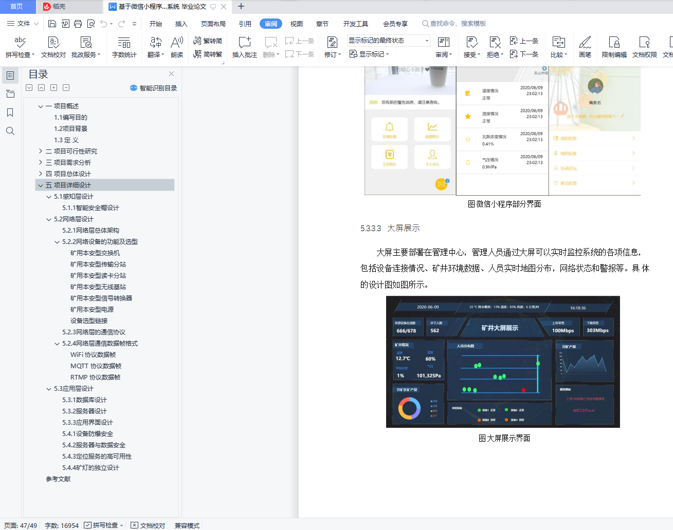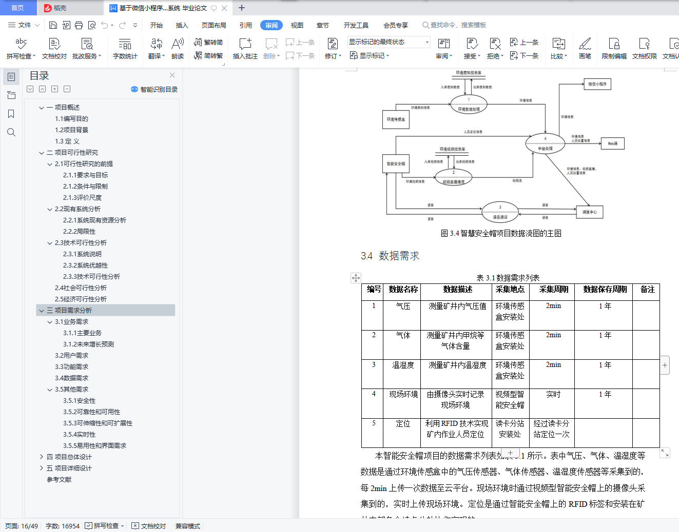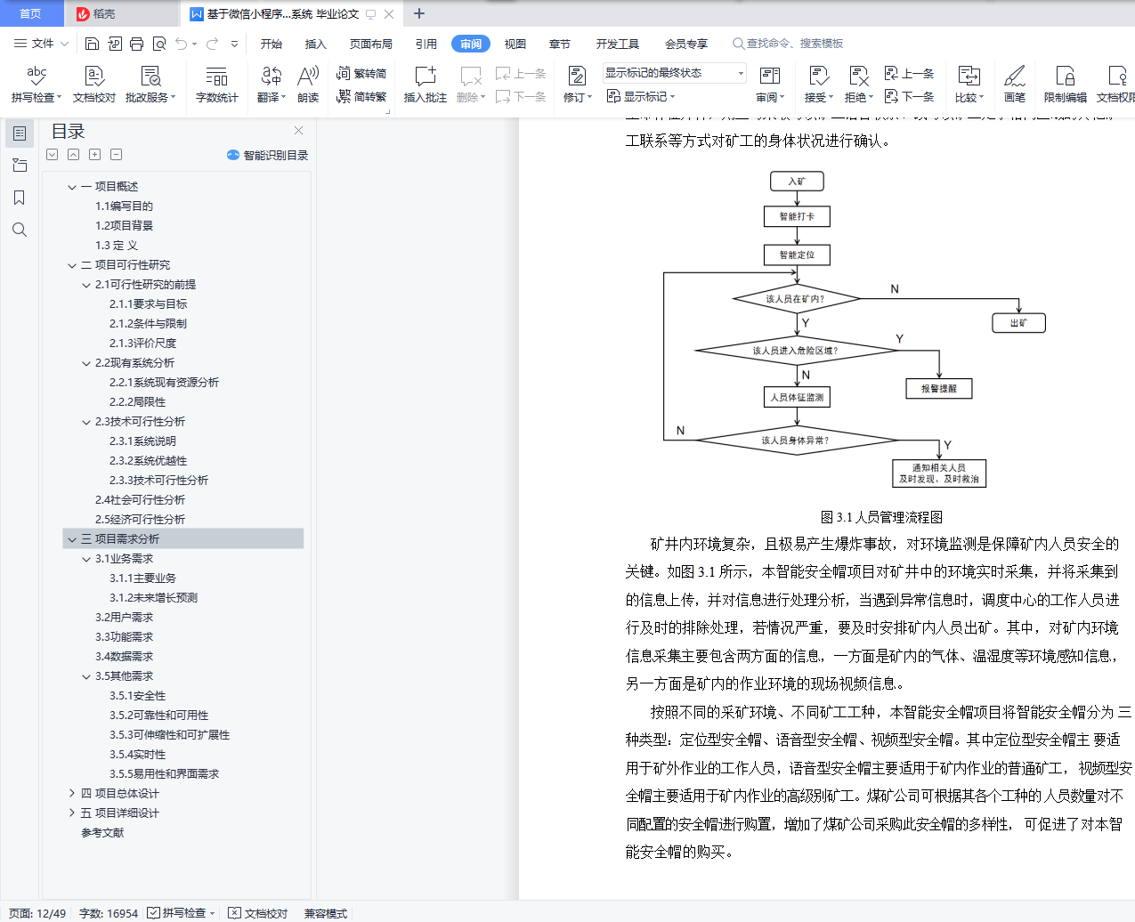 摘要:目前矿井环境及其恶劣,安全事故频发。然而矿工主要使用的安全帽只具备防护和照明功能,无法对由于其他外部或内部因素导致的安全威胁进行有效的预防和处理。故基于以上现状,本项目设计了一套以“矿井生产”为背景的智能安全帽全生态系统,以期解决当前行业的痛点。本项目将先从可行性研究、需求分析等方面分析,确定本项目的具体实施方案与功能实现,然后提出本项目的总体设计与分层的详细设计,最后是模拟对项目进行测试。关键词:小程序;矿井;安全管理;管理系统;后台webAbstract: The current mine environment and its bad, frequent safety accidents.However, the hard hats mainly used by miners can only have protective and lighting functions, and they cannot effectively prevent and handle security threats due to other external or internal factors.Therefore, based on the above current situation, this project has designed an intelligent safety helmet whole ecosystem based on "mine production", in order to solve the pain points of the current industry.The project will first analyze the feasibility study and demand analysis, determine the specific implementation plan and functional implementation of the project, and then put forward the overall design and hierarchical detailed design of the project, and finally the simulated test of the project.Key words: small program; mine; safety management; management system; background web目录一 项目概述 51.1编写目的 51.2项目背景 51.3定义 6二 项目可行性研究 72.1可行性研究的前提 72.1.1要求与目标 72.1.2条件与限制 72.1.3评价尺度 72.2现有系统分析 82.2.1系统现有资源分析 82.2.2局限性 82.3技术可行性分析 92.3.1系统说明 92.3.2系统优越性 92.3.3技术可行性分析 92.4社会可行性分析 92.5经济可行性分析 10三 项目需求分析 113.1业务需求 113.1.1主要业务 113.1.2未来增长预测 133.2用户需求 133.3功能需求 143.4数据需求 163.5其他需求 173.5.1安全性 173.5.2可靠性和可用性 173.5.3可伸缩性和可扩展性 173.5.4实时性 173.5.5易用性和界面需求 18四 项目总体设计 194.1 系统技术架构 194.2.1 设备 204.2.2云服务 204.2.3展示层 214.2.4交互过程 21五 项目详细设计 235.1感知层设计 235.1.1智能安全帽设计 235.1.1.1总体设计 235.1.1.2元件选型 245.1.1.3软件设计流程图 295.1.1.4成本造价 295.1.2环境传感盒设计 305.1.2.1总体设计 305.1.2.2元件选型 315.1.2.3软件设计流程图 335.1.2.4成本造价 345.2网络层设计 355.2.1网络层总体架构 355.2.2网络设备的功能及选型 365.2.3网络层的通信协议 405.2.4网络层通信数据帧格式 415.3应用层设计 435.3.1数据库设计 435.3.2服务器设计 445.3.3应用界面设计 455.3.3.1 网页 455.3.3.2微信小程序 465.3.3.3大屏展示 475.4安全设计 485.4.1设备防爆安全 485.4.2服务器与数据安全 485.4.3定位服务的高可用性 485.4.4矿灯的独立设计 48