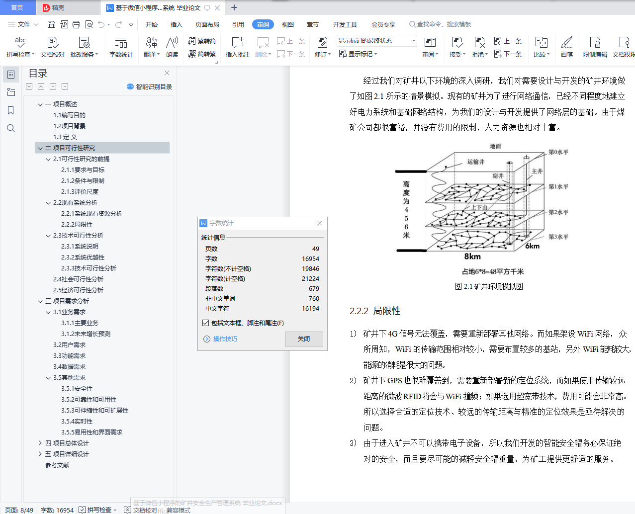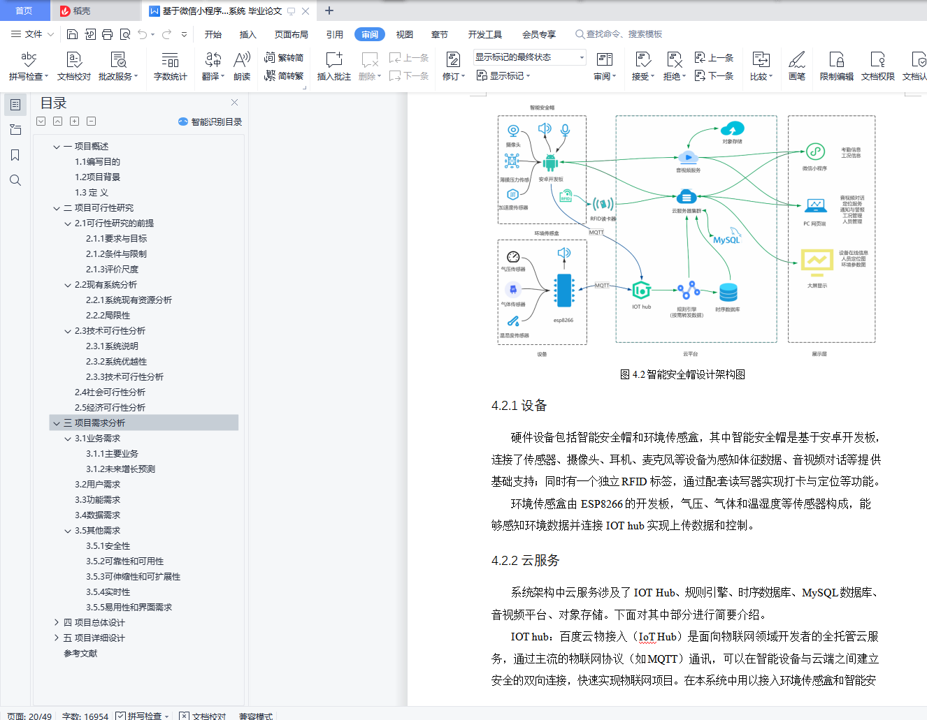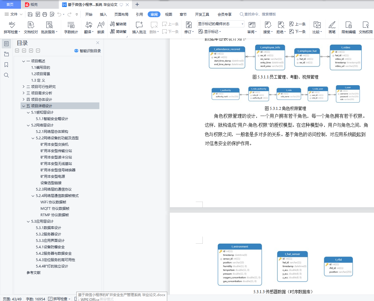 摘要:目前矿井环境及其恶劣,安全事故频发。然而矿工主要使用的安全帽只具备防护和照明功能,无法对由于其他外部或内部因素导致的安全威胁进行有效的预防和处理。故基于以上现状,本项目设计了一套以“矿井生产”为背景的智能安全帽全生态系统,以期解决当前行业的痛点。本项目将先从可行性研究、需求分析等方面分析,确定本项目的具体实施方案与功能实现,然后提出本项目的总体设计与分层的详细设计,最后是模拟对项目进行测试。关键词:小程序;矿井;安全管理;管理系统;后台webAbstract: The current mine environment and its bad, frequent safety accidents.However, the hard hats mainly used by miners can only have protective and lighting functions, and they cannot effectively prevent and handle security threats due to other external or internal factors.Therefore, based on the above current situation, this project has designed an intelligent safety helmet whole ecosystem based on "mine production", in order to solve the pain points of the current industry.The project will first analyze the feasibility study and demand analysis, determine the specific implementation plan and functional implementation of the project, and then put forward the overall design and hierarchical detailed design of the project, and finally the simulated test of the project.Key words: small program; mine; safety management; management system; background web目录一 项目概述 51.1编写目的 51.2项目背景 51.3定义 6二 项目可行性研究 72.1可行性研究的前提 72.1.1要求与目标 72.1.2条件与限制 72.1.3评价尺度 72.2现有系统分析 82.2.1系统现有资源分析 82.2.2局限性 82.3技术可行性分析 92.3.1系统说明 92.3.2系统优越性 92.3.3技术可行性分析 92.4社会可行性分析 92.5经济可行性分析 10三 项目需求分析 113.1业务需求 113.1.1主要业务 113.1.2未来增长预测 133.2用户需求 133.3功能需求 143.4数据需求 163.5其他需求 173.5.1安全性 173.5.2可靠性和可用性 173.5.3可伸缩性和可扩展性 173.5.4实时性 173.5.5易用性和界面需求 18四 项目总体设计 194.1 系统技术架构 194.2.1 设备 204.2.2云服务 204.2.3展示层 214.2.4交互过程 21五 项目详细设计 235.1感知层设计 235.1.1智能安全帽设计 235.1.1.1总体设计 235.1.1.2元件选型 245.1.1.3软件设计流程图 295.1.1.4成本造价 295.1.2环境传感盒设计 305.1.2.1总体设计 305.1.2.2元件选型 315.1.2.3软件设计流程图 335.1.2.4成本造价 345.2网络层设计 355.2.1网络层总体架构 355.2.2网络设备的功能及选型 365.2.3网络层的通信协议 405.2.4网络层通信数据帧格式 415.3应用层设计 435.3.1数据库设计 435.3.2服务器设计 445.3.3应用界面设计 455.3.3.1 网页 455.3.3.2微信小程序 465.3.3.3大屏展示 475.4安全设计 485.4.1设备防爆安全 485.4.2服务器与数据安全 485.4.3定位服务的高可用性 485.4.4矿灯的独立设计 48