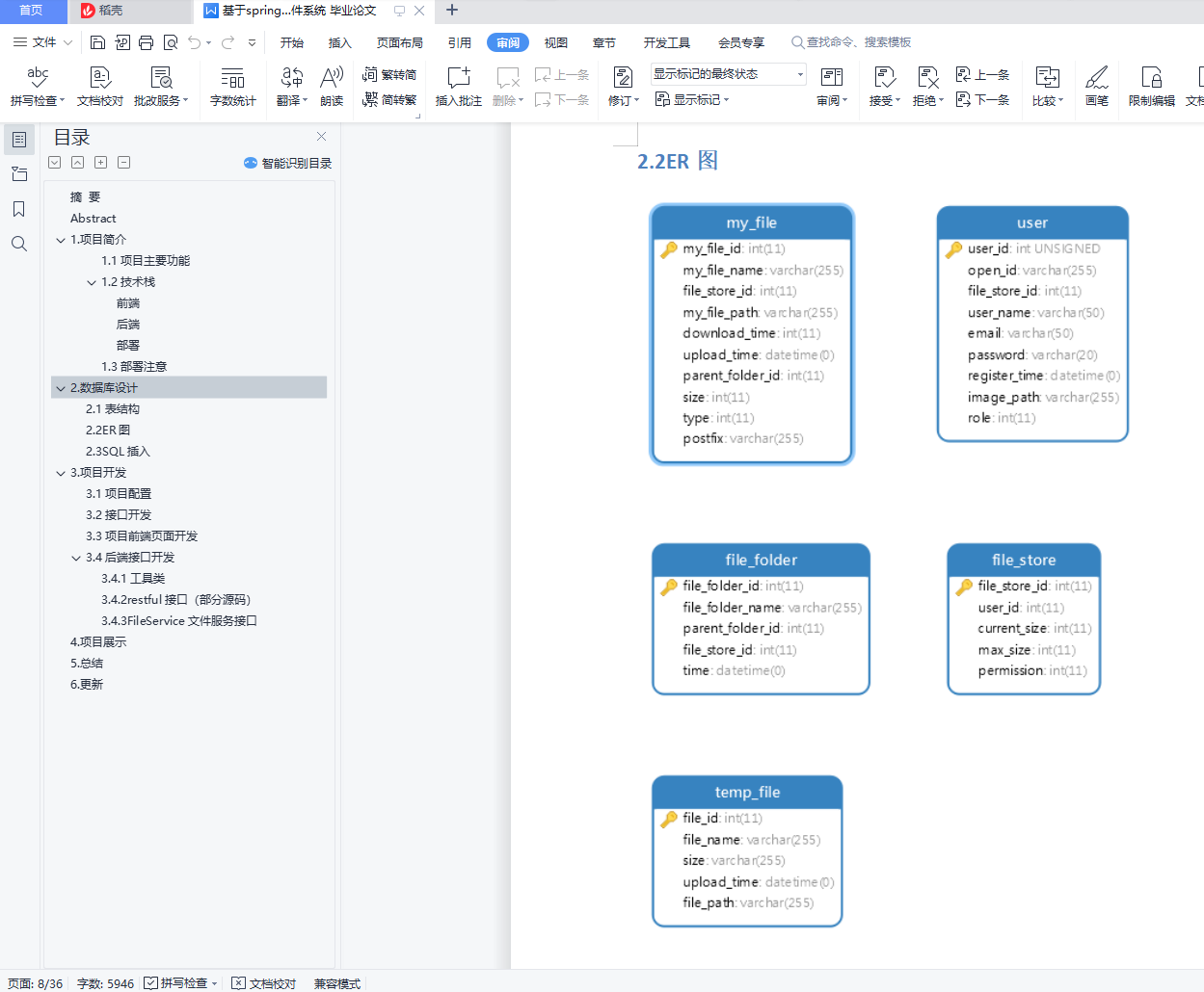 摘 要现代信息存储的方式有很多,人们对信息存储的便捷性要求也越来越高。本设计主要研究和设计一个基于微服务架构的网盘系统应用。系统可以让用户通过浏览器随时管理自己的文件,它提供了如文件分类、文件上传和下载、文件夹管理、文件搜索、文件分享等功能。本系统开发基于B/S结构的,以及使用微服务架构实现。后端的微服务治理工具采用Spring cloud框架,它提供了诸如服务注册和发现、服务熔断和服务网关所需的组件。因为开发中很多时候都需要上传和下载文件,所以想开发出一个模块,用于文件的上传和下载,自然而然也就想到了网盘,因为是个人开发,所以版本项目应该会持续迭代,优化,此外,技术栈是springboot+mybatis+jquery+bootstrap。单个微服务利用Spring boot进行构建,Spring Boot在集成了许多第三方技术情况下允许开发人员快速构建项目。该系统的文件存储服务选用了FastDFS分布式文件系统,它提供了文件上传以及文件下载的基本存储接口,缓存采用Redis集群,Redis作为内存数据库能够提供高速的缓存服务,用户信息加密方面使用了JWT技术,文件以外的数据存储在MySQL数据库,采用了持久层框架MyBatis,使用数据库连接池Druid,整个项目总体使用Maven进行构建。关键词:网盘;网盘系统;Spring boot;bootstrap;mybatisAbstractThere are many ways of modern information storage, and people have higher and higher requirements for the convenience of information storage.This design mainly studies and designs a network disk system application based on a microservice architecture.The system allows users to manage their files at any time through the browser and providing features such as file classification, file upload and download, folder management, file search, file sharing.This system is developed based on B / S structure and implemented using microservice architecture.The back-end micro service governance tool employs the Spring cloud framework that provides components such as service registration and discovery, service circuit breakers and service Gateways.Because many times need to upload and download files, so you want to develop a module to upload and download files, you naturally think of the network disk, because it is personal development, so the version project should continue to iterate and optimize. In addition, the technology stack is springboot + mybatis + jquery + bootstrap.Individual microservices build using Spring boot, and Spring Boot allows developers to quickly build projects while integrating many third-party technologies.The file storage service of this system uses FastDFS distributed file system, which provides the basic storage interface for file upload and file download, cache adopts Redis cluster, Redis as a memory database can provide fast cache service, user information encryption uses JWT technology, data other than files is stored in MySQL database, adopts persistent layer framework MyBatis, using database connection pool Druid, the whole project is built using Maven.Key words: network disk; network disk system; Spring boot; bootstrap; mybatis目录摘 要 1Abstract 21.项目简介 31.1项目主要功能 41.2技术栈 41.3部署注意 42.数据库设计 52.1表结构 52.2ER图 72.3SQL插入 83.项目开发 93.1项目配置 93.2接口开发 103.3项目前端页面开发 123.4后端接口开发 213.4.1工具类 213.4.2restful接口(部分源码) 273.4.3FileService文件服务接口 314.项目展示 325.总结 356.更新 35