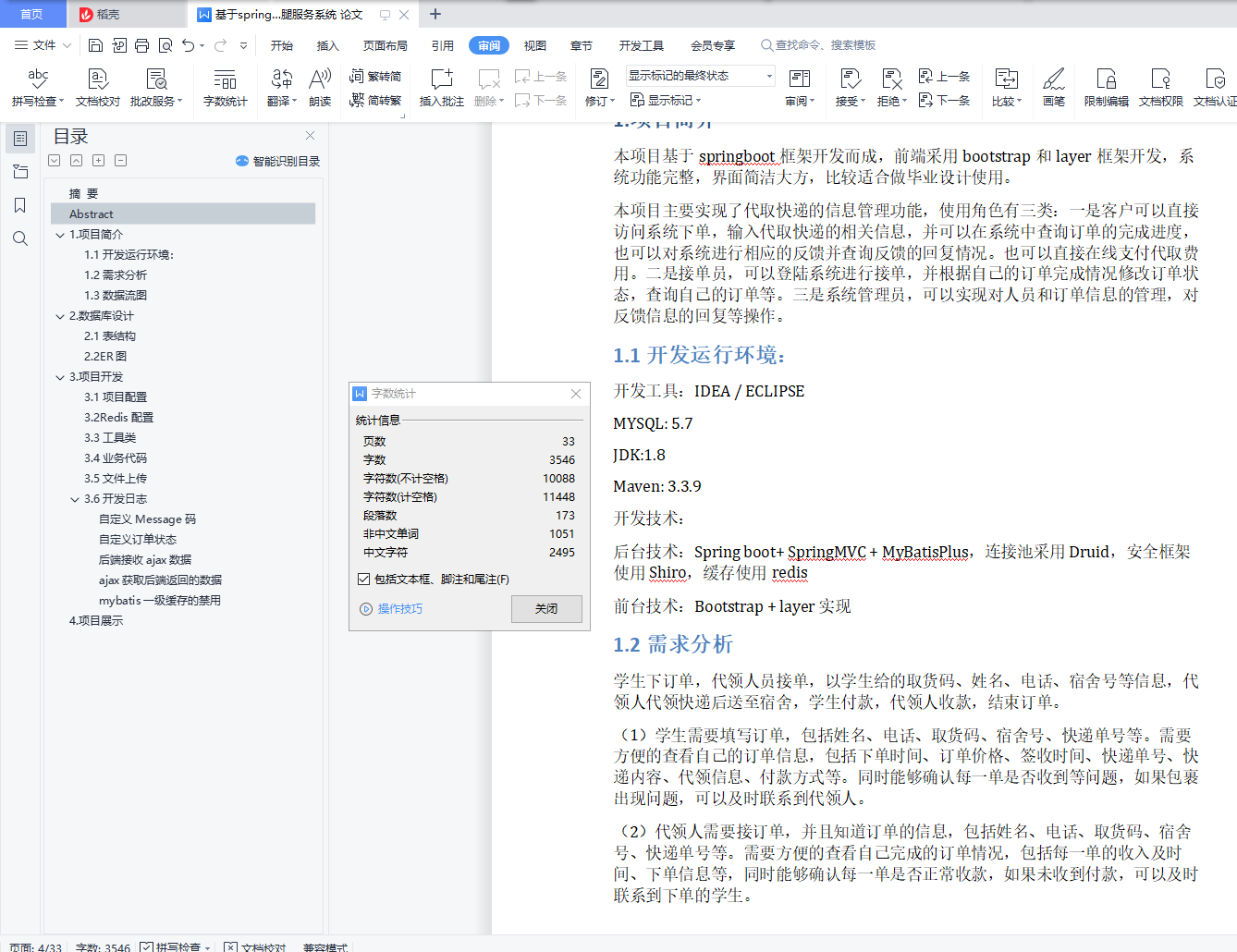 快递代取系统摘 要近年来,网络购物已经逐渐成为人们的一种生活和消费习惯,同时也带动了快递行业的迅猛发展。快递行业中,校园快递交易量近些年呈现高幅度增长,然而高校后勤对于校园快递的管理却处于一种滞后的状态。由于学校的教师和宿舍限制外来人员的进入,并且学校的快递量非常的大,学校无法提供送件上门服务,收件人只能到快递领取点取件,由于快递领取点一般离收件人比较远,学生取件非常的不便;而共享快递盒需要送货上门,签收回收,目前校园无法实现共享快递盒的接收。本项目基于springboot框架开发而成,前端采用bootstrap和layer框架开发,主要实现了代取快递的信息管理功能,使用角色有三类:一是客户可以直接访问系统下单,输入代取快递的相关信息,并可以在系统中查询订单的完成进度,也可以对系统进行相应的反馈并查询反馈的回复情况。也可以直接在线支付代取费用。二是接单员,可以登陆系统进行接单,并根据自己的订单完成情况修改订单状态,查询自己的订单等。三是系统管理员,可以实现对人员和订单信息的管理,对反馈信息的回复等操作。关键词:快递;代取;跑腿;互助;springbootAbstractIn recent years, online shopping has gradually become a people's life and consumption habit, but also led to the rapid development of the express delivery industry.In the express delivery industry, the transaction volume of campus express delivery has shown a high growth in recent years, but the management of college logistics for campus express delivery is in a lagging state.Because the school teachers and dormitories limit the entry of foreign personnel, and the school delivery volume is very large, the school is unable to provide delivery service, the recipient can only pick up the delivery point, because the express delivery point is generally far from the recipient, it is very inconvenient for students to pick up; and the shared delivery box needs to receive recycling, the campus cannot realize the shared delivery box reception.This project is developed based on springboot framework. The front-end adopts bootstrap and layer framework, which mainly realizes the information management function of express delivery. There are three roles: first, customers can directly access the system to order, input the relevant information of express delivery, and can query the completion progress of the order in the system, and also give corresponding feedback to the system and query the feedback reply.It can also be paid directly online.The second is the order receiver, can log in the system to receive orders, and according to their own order completion of the situation to modify the order status, query their own orders, etc.Third, the system administrator can realize the management of personnel and order information, the reply to the feedback information and other operations.Key words: express; generation; errands; mutual assistance; springboot目录摘 要 1Abstract 21.项目简介 41.1开发运行环境: 41.2需求分析 41.3数据流图 52.数据库设计 62.1表结构 62.2ER图 73.项目开发 73.1项目配置 73.2Redis配置 93.3工具类 103.4业务代码 123.5文件上传 203.6开发日志 21自定义Message码 21自定义订单状态 22后端接收ajax数据 22ajax获取后端返回的数据 27mybatis一级缓存的禁用 294.项目展示 29
