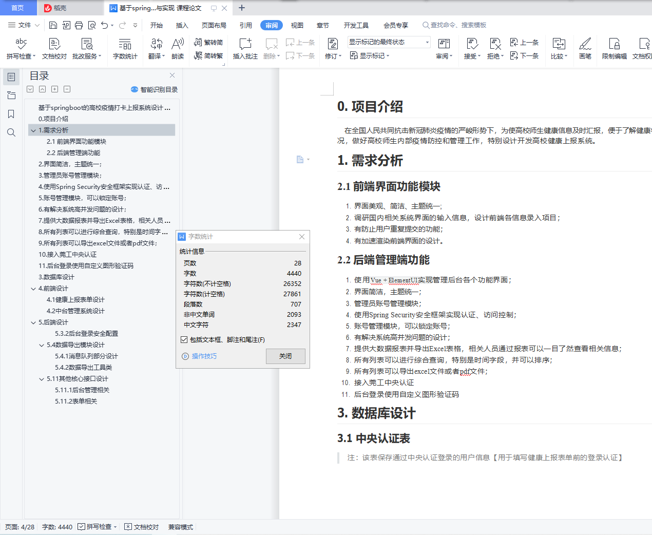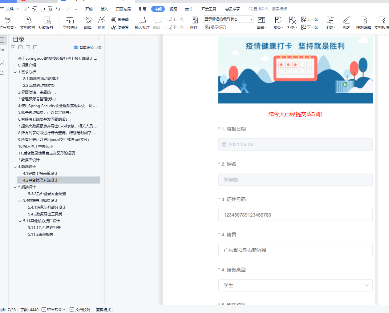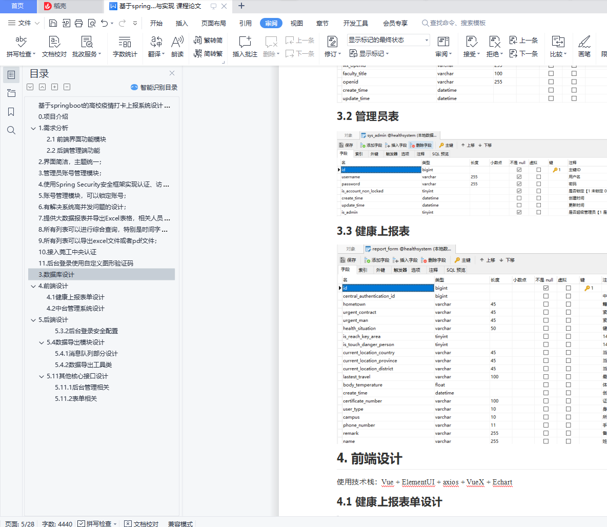 基于springboot的高校疫情打卡上报系统设计与实现摘要:在互联网环境下结合疫情防控要求,开发了基于微信小程序的体温填报、信息预警管理平台。随着微信小程序的热度越来越高,更多的人将目光放在这个平台。微信小程序具有基于微信的用户平台先天的优势,其次小程序用法很简单,用户只需扫码进入系统就能使用相应的功能,避免了App繁琐的下载注册等诸多不便,真正做到了用完即走的理念,用户不用担心手机上安装过多的软件,以及内存占用问题。本次设计采用微信开发工具和基于Java语言的springboot框架实现了平台客户端和后台管理端。前台客户端主要功能包括用户身份的选择、个人信息管理、体温信息的填报,当日整体数据统计,人员填报信息汇总与下载;后台管理端主要包括对用户身份的录入、用户信息修改、部门管理、预警信息通知、体温定时填报通知、人员角色权限分配。该平台的开发不仅提供了一个体温上报、数据汇总、简化工作的同时,也在疫情防控期间开学做好安全保障。关键词:疫情上报;疫情打卡;疫情管理;小程序;springbootAbstract: In the Internet environment, combined with the requirements of epidemic prevention and control, a temperature filling and information early warning management platform based on WeChat mini program was developed.As the popularity of WeChat small programs increases, more people will focus on this platform.WeChat small program has the inherent advantage of the based on WeChat user platform, then small program usage is very simple, the user just scan the code into the system can use the corresponding function, avoid the App cumbersome download registration and many other inconvenience, really did the concept of use, users don't have to worry about installing too much software, and memory footprint.This design adopts WeChat development tools and Java language-based springboot framework to implement the platform client and background management side.The main functions of front desk client include user identity selection, personal information management, temperature information filling, overall data statistics, personnel filling information summary and download; background management mainly includes user identity input, user information modification, department management, early warning information notification, temperature timing filling notification, and personnel role authority allocation.The development of the platform not only provides a temperature report, data summary and simplified work, but also provides a safety guarantee for the school semester during the epidemic prevention and control period.Key words: epidemic reporting; epidemic clock in; epidemic management; small program; springboot目录基于springboot的高校疫情打卡上报系统设计与实现 10. 项目介绍 31. 需求分析 32.1 前端界面功能模块 32.2 后端管理端功能 32. 界面简洁,主题统一; 33. 管理员账号管理模块; 34. 使用Spring Security安全框架实现认证、访问控制; 35. 账号管理模块,可以锁定账号; 36. 有解决系统高并发问题的设计; 37. 提供大数据报表并导出Excel表格,相关人员通过报表可以一目了然查看相关信息; 38. 所有列表可以进行综合查询,特别是时间字段,并可以排序; 39. 所有列表可以导出excel文件或者pdf文件; 310. 接入莞工中央认证 411. 后台登录使用自定义图形验证码 43. 数据库设计 44. 前端设计 54.1 健康上报表单设计 54.2 中台管理系统设计 85. 后端设计 105.3.2 后台登录安全配置 125.4 数据导出模块设计 145.4.1 消息队列部分设计 145.4.2 数据导出工具类 165.11 其他核心接口设计 235.11.1 后台管理相关 235.11.2 表单相关 28