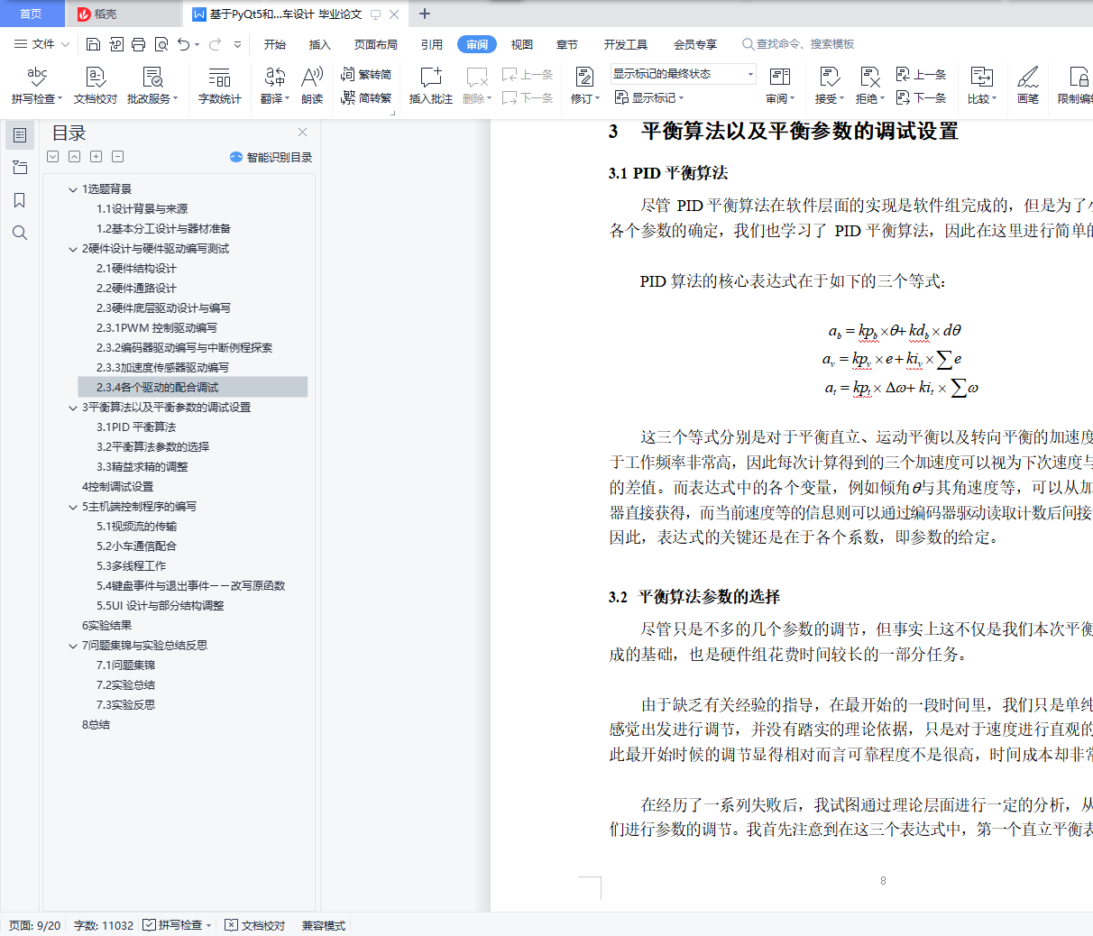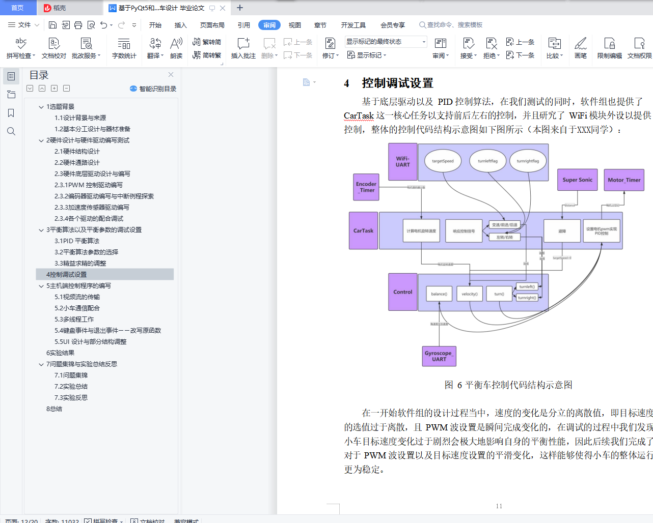 目录1故事的开始 11.1设计背景与灵感来源 11.2基本分工设计与器材准备 12硬件设计与硬件驱动编写测试 22.1硬件结构设计 22.2硬件通路设计 32.3硬件底层驱动设计与编写 42.3.1PWM 控制驱动编写 42.3.2编码器驱动编写与中断例程探索 52.3.3加速度传感器驱动编写 72.3.4各个驱动的配合调试 73平衡算法以及平衡参数的调试设置 83.1PID 平衡算法 83.2平衡算法参数的选择 83.3精益求精的调整 104控制调试设置 115主机端控制程序的编写 125.1视频流的传输 135.2小车通信配合 135.3多线程工作 145.4键盘事件与退出事件――改写原函数 155.5UI 设计与部分结构调整 166实验结果 167问题集锦与实验总结反思 177.1问题集锦 177.2实验总结 187.3实验反思 198 总结 191选题背景1.1设计背景与来源时至今日,越来越多的智能无人系统进入我们的视野。这其中,便有视觉冲击力极强的平衡车。无论是日常载人的平衡车,还是例如在机场、餐厅中看到的那些已经被投入使用的平衡车,其独特而具有视觉美感的造型设计以及相比于四轮车的低功耗、便捷等特性已经逐渐被大众所接纳,也有望在未来占有相当可观的市场份额。与此同时,组内成员对于平衡车的构造、平衡原理、运动控制等内容都极为感兴趣,在进行一系列的项目评估以及头脑风暴后,我们一致认为这是一个可行的选题,因此有了最后作为成品出现在验收现场的基于 PSoC6 的多功能平衡车。