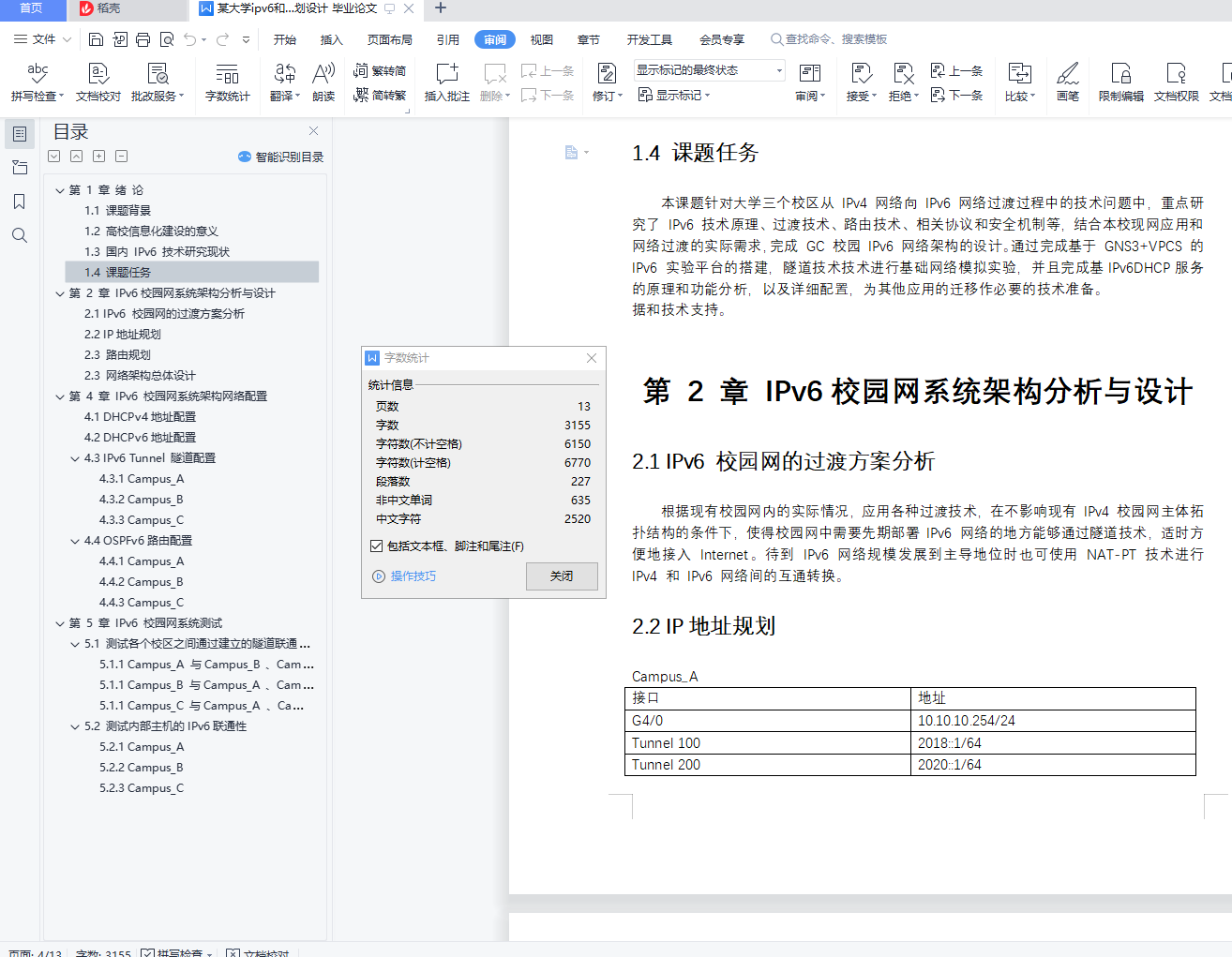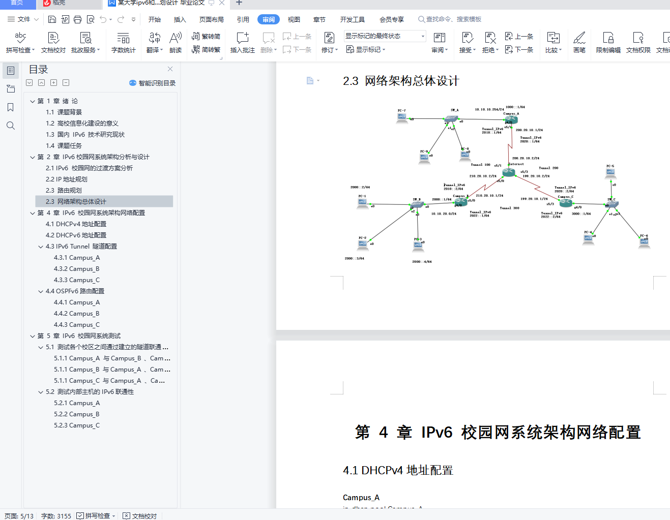 摘 要高校作为当今互联网建设、发展与推动的主要技术力量之一,应在 IPv6 的布署与应用上开创先河,领先业界。GC 学院校园网从 IPv4 网络向 IPv6 网络过渡中需要经历 IPv6 孤岛在 IPv4 海洋中的应用、IPv6 与 IPv4 混合共存和 IPv4 孤岛在 IPv6 海洋中应用三个阶段。本文通过分析 IPv6 相关协议和服务,对 IPv4 向 IPv6 过渡过程中涉及到的过渡技术、ICMPv6、邻居发现、路由协议、部署和配置方案等进行了研究。根据GC学院校园网当前网络架构及服务应用,本文详细阐述了校园网由IPv4网络向 IPv6 网络过渡改造过程中的相关问题,提出了从纯正 IPv4 网络过渡到 IPv4 和 IPv6混合共存网络的策略,解决了 IPv4 网络中 IPv6 孤岛、IPv4 和 IPv6 混合共存,以及IPv6 网络中 IPv4 孤岛在设计中的路由规划、网络配置以及安全管理等关键技术。通过搭建基GNS3+VPSC模拟实验环境,对动态路由、地址解析、网络连通性以及DHCPv6服务功能进行了配置。通过论文的分析、设计与实验,完成了基于 GNS3+VPSC 模拟实验环境的学院校园网由IPv4网络向IPv6与IPv4混合共存和 IPv4 孤岛在 IPv6 中应用的设计、配置和模拟验证,基本满足了 GC 学院校园网的设计要求。可以此设计方案为蓝本,拓展 IPv6 网络建设和管理的思路,提高学院网络技术管理水平与教学水平。关键词 IPv4;IPv6;校园网;网络设计;网络规划目录第 1 章 绪 论 41.1 课题背景 41.2 高校信息化建设的意义 41.3 课题任务 5第 2 章 IPv6校园网系统架构分析与设计 52.1 IPv6 校园网的过渡方案分析 52.2 IP地址规划 52.3 路由规划 62.3 网络架构总体设计 6第 4 章 IPv6 校园网系统架构网络配置 64.1 DHCPv4地址配置 64.2 DHCPv6地址配置 74.3 IPv6 Tunnel 隧道配置 84.3.1 Campus_A 84.3.2 Campus_B 84.3.3 Campus_C 94.4 OSPFv6路由配置 94.4.1 Campus_A 94.4.2 Campus_B 104.4.3 Campus_C 10第 5 章 IPv6 校园网系统测试 115.1 测试各个校区之间通过建立的隧道联通性 115.1.1 Campus_A 与Campus_B 、Campus_C 115.1.1 Campus_B 与Campus_A 、Campus_C 125.1.1 Campus_C 与Campus_A 、Campus_B 125.2 测试内部主机的IPv6联通性 135.2.1 Campus_A 135.2.2 Campus_B 135.2.3 Campus_C 14