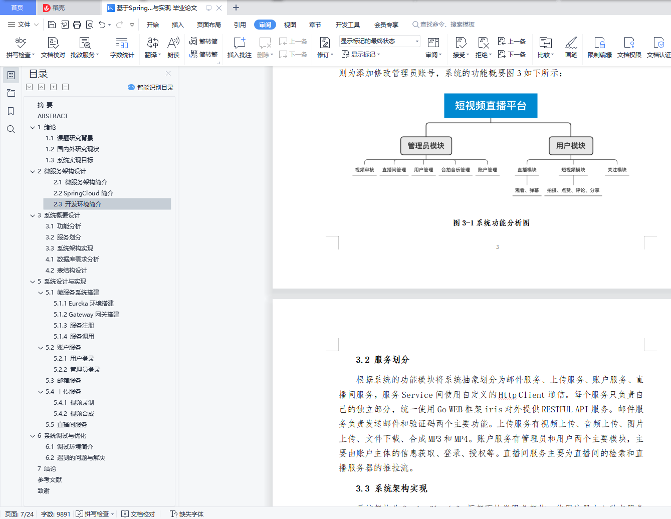 摘 要本文的主题是设计与实现一个基于 SpringCloud+Golang 微服务框架的分布式直播平台,主要聚焦于短视频与直播流媒体服务。系统由服务端,后台管理端和微信小程序端三部分组成,推拉直播流的协议分别为 RTMP 协议和 HLS 协议, 直播服务器为livego。后端服务由 Eureka 注册中心,Gateway 网关,和各种 Gloang实现的微服务模块组成,Golang 具有高性能、高并发、轻量等特点,服务端之间的相互调用基于 HTTP 协议,耦合性相对于 RPC、gRPC 协议较低。后台管理端使用 Vue.js 框架,ui 框架为 Ant Design,用户端的微信小程序基于 Vant-UI 设计。用户端的所有 API 请求都需要经过 Gateway 网关统一拦截、鉴权、代理转发, 网关在启动时从 Eureka 同步所有服务实例,同时提供负载均衡能力。关键词: 流媒体直播,微服务,SpringCloud,GolangABSTRACTThe theme of this paper is to design and implement a distributed live platform based on spring cloud + golang micro service framework, which mainly focuses on short video and live streaming media services. The system consists of three parts: server, background management and wechat applet. The protocol of push-pull live stream is RTMP protocol and HLS protocol, and the live server is livego. The back-end service is composed of Eureka registry, gateway gateway and various micro service modules implemented by gloang. Golang has the characteristics of high performance, high concurrency and light weight. The mutual calls between servers are based on HTTP protocol, and the coupling is lower than RPC and grpc protocols. The background management end uses vue.js framework, the UI framework is ant design, and the wechat applet of the user end is designed based on vant UI. All API requests of client end need to be intercepted, authenticated and forwarded by gateway gateway. Gateway synchronizes all service instances from Eureka when it starts, and provides load balancing capability.Keywords: Streaming Media Live; Micro Service; Spring Cloud; Golang目录摘 要 IABSTRACT II1 绪论 11.1 课题研究背景 11.2 国内外研究现状 11.3 系统实现目标 12 微服务架构设计 22.1 微服务架构简介 22.2 SpringCloud简介 22.3 开发环境简介 33 系统概要设计 33.1 功能分析 33.2 服务划分 43.3 系统架构实现 44.1 数据库需求分析 44.2 表结构设计 55 系统设计与实现 95.1 微服务系统搭建 95.1.1 Eureka环境搭建 95.1.2 Gateway网关搭建 105.1.3 服务注册 105.1.4 服务调用 115.2 账户服务 125.2.1 用户登录 125.2.2 管理员登录 135.3 邮箱服务 135.4 上传服务 145.4.1 视频录制 145.4.2 视频合成 155.5 直播间服务 166 系统调试与优化 176.1 调试环境简介 176.2 遇到的问题与解决 177 结论 18参考文献 19致谢 20