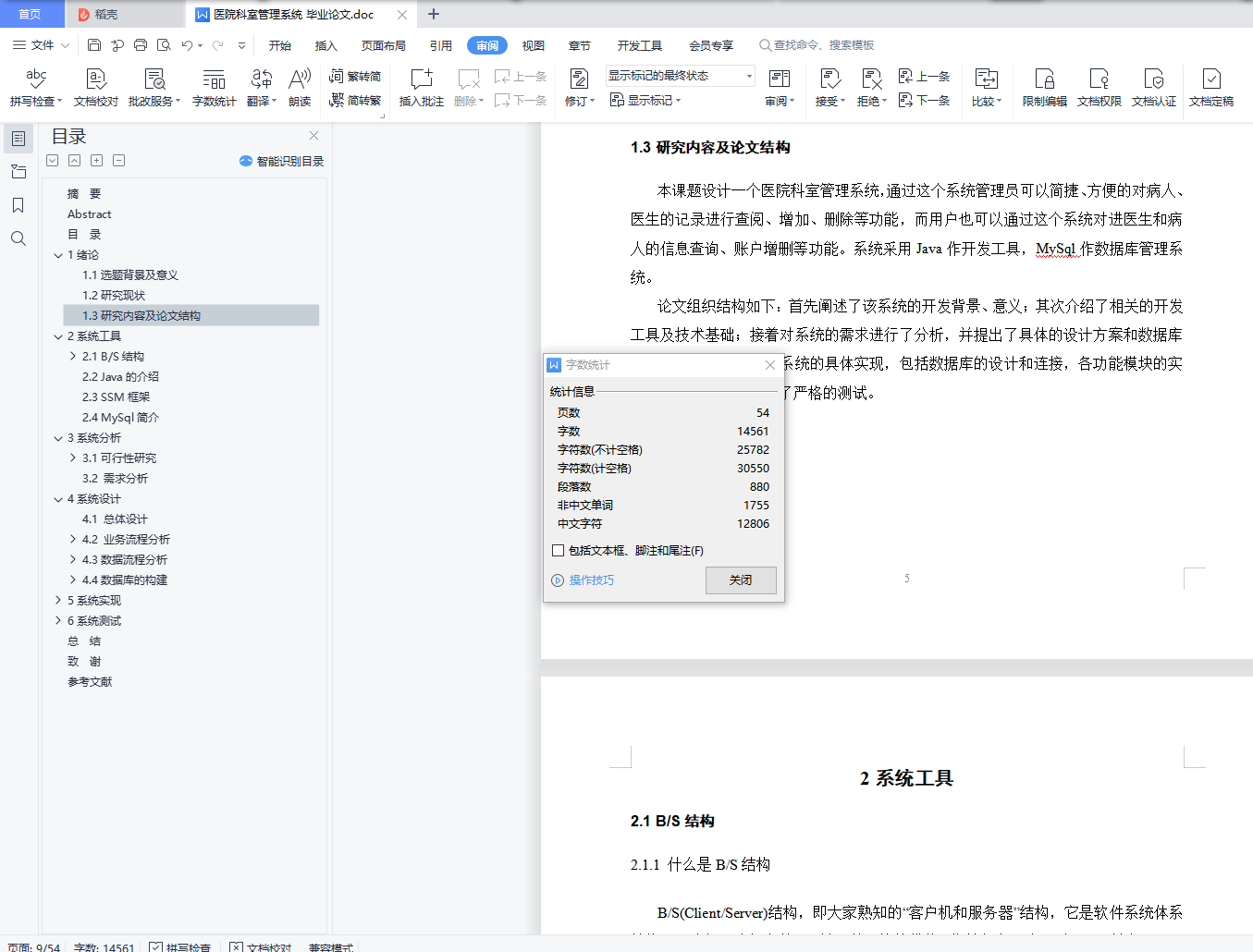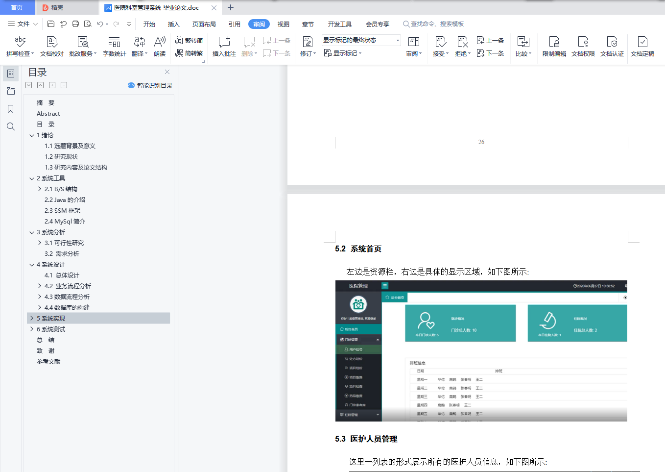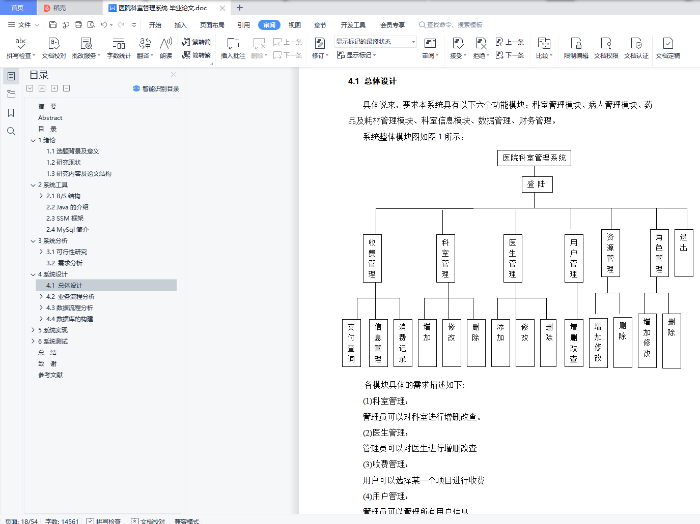 摘 要在信息化的今天,计算机网络和互联网的作用越来越重要,医院规模不断扩大,与医院运营相关的管理任务也越来越复杂,尤其是医院管理任务日趋复杂。越来越困难。目前大部分医院管理仍是传统的人工管理方式,即对医院信息进行人工处理。不再能适应社会发展和现实需要。医院在现代社会的发展中扮演着举足轻重的角色,无论医院规模大小,科室设计都是非常复杂的,即使是最小的错误也会让患者复活。不同科室有不同类型的交流,各级管理人员需要及时了解患者相关信息和药品信息,做到相关环节的识别和合理放置。当复杂的行政任务的管理依赖于人工分析时,难以实现且难以保证数据的准确性,从而导致管理决策不善。大多数中小医院还没有实现医院管理和就医指导信息化,日常的配药、写病历等工作繁重。无法为患者提供详细的计费项目清单,这在医生和患者之间造成了紧张局势。论文细致说明了基于SSM 的病院科室经管体系的开辟计划历程。体系以Java为开辟领域,MySql为数据库经管体系,完成病人登记、大夫消息经管、病人消息经管和病人消息经管功效。该体系可以或许知足病院经管的请求,赞助病院有用进步工作服从。关键词:医院管理系统;科室管理系统;信息管理系统;MySql;Java SSMAbstractIn the day of informatization, the role of computer network and the Internet is becoming more and more important, the scale of hospitals is constantly expanding, and the management tasks related to hospital operation are becoming more and more complex, especially the hospital management tasks are becoming more and more complex. It is getting more difficult. At present, most hospital management is still the traditional manual management method, that is, the artificial processing of hospital information. No longer can adapt to social development and real needs. Hospitals play a pivotal role in the development of modern society. No matter the size of the hospital, the department design is very complex, and even the smallest mistake will revive patients. Different departments have different types of communication, and the management personnel at all levels need to timely understand the relevant patient information and drug information of patients, so as to achieve the identification and reasonable placement of relevant links. When the management of complex administrative tasks depends on manual analysis, it is difficult to achieve and ensure the accuracy of the data, leading to poor decision management making. Most small and medium-sized hospitals have not yet realized the informatization of hospital management and medical guidance, and their daily drug dispensing and medical records is heavy. Unable to provide patients with a detailed list of billing items, which creates tension between doctors and patients.The paper explains the development of economic management system based on SSM. The system takes Java as the field, MySql as the database management system, to complete the effect of patient registration, doctor information management, patient information management and patient information management. The system may be satisfied with its request to sponsor useful progressive work.Keywords: hospital management system; department management system; information management system; MySql;Java SSM目 录摘 要 IAbstract II目 录 III1绪论 11.1选题背景及意义 11.2研究现状 11.3研究内容及论文结构 52系统工具 62.1 B/S结构 62.1.1 什么是B/S结构 62.1.2 B/S架构软件的优势与劣势 62.2 Java的介绍 72.3 SSM框架 72.4 MySql简介 113系统分析 123.1可行性研究 123.1.1 技术可行性 123.1.2 经济可行性 123.1.3 操作可行性 123.1.4 社会可行性 133.2 需求分析 134系统设计 144.1 总体设计 144.2 业务流程分析 154.2.1 科室业务流程分析 154.2.2 资源业务流程分析 164.2.3 病人管理业务流程分析 164.3数据流程分析 174.3.1 科室数据流程分析 174.3.2 病人数据流程分析 184.3.3 药品及耗材入库流程图 184.3.4 ER图 184.4数据库的构建 194.4.1 科室管理表 194.4.2 病人管理表 204.4.3 药品及耗材管理表 214.4.4 科室职员管理表 225系统实现 235.1登陆界面 235.2 系统首页 275.3 医护人员管理 275.4 病房管理 305.5 收费管理 325.6 留言管理 345.7 病人管理 365.8 出院管理 375.9 资源管理 405.10 角色管理 415.11 用户管理 416系统测试 456.1单元测试 456.2功能测试 466.3性能测试 46总 结 48致 谢 49参考文献 50