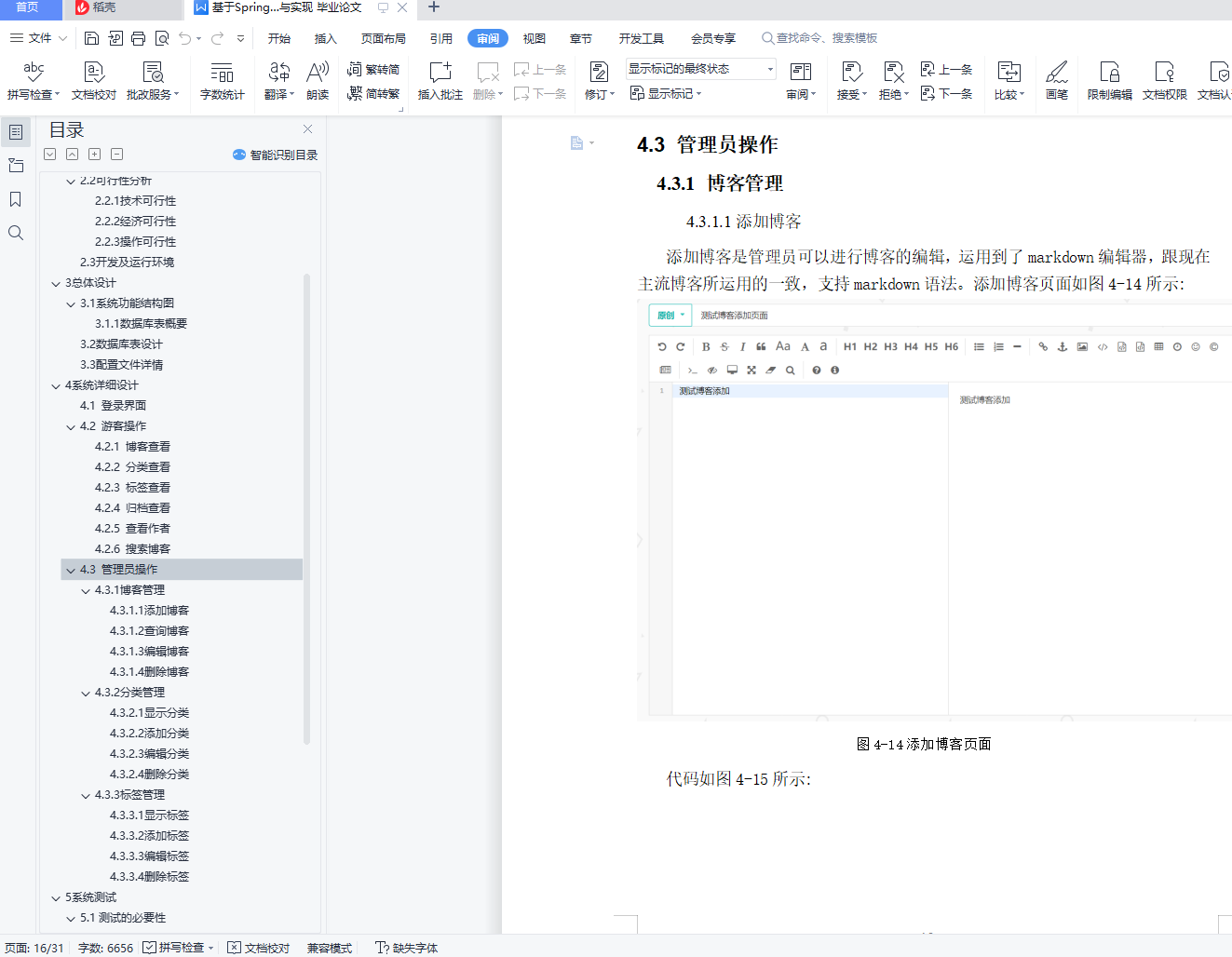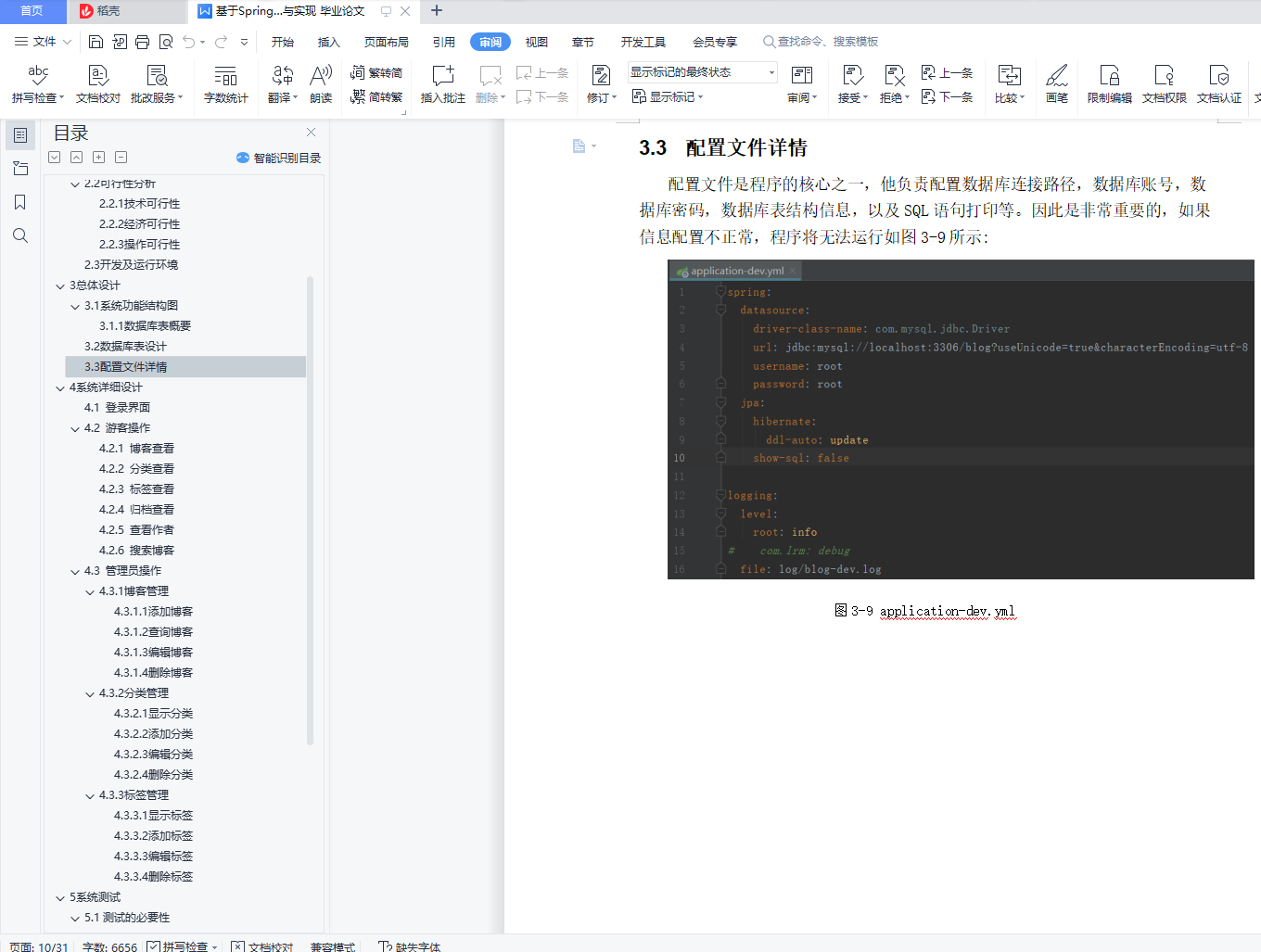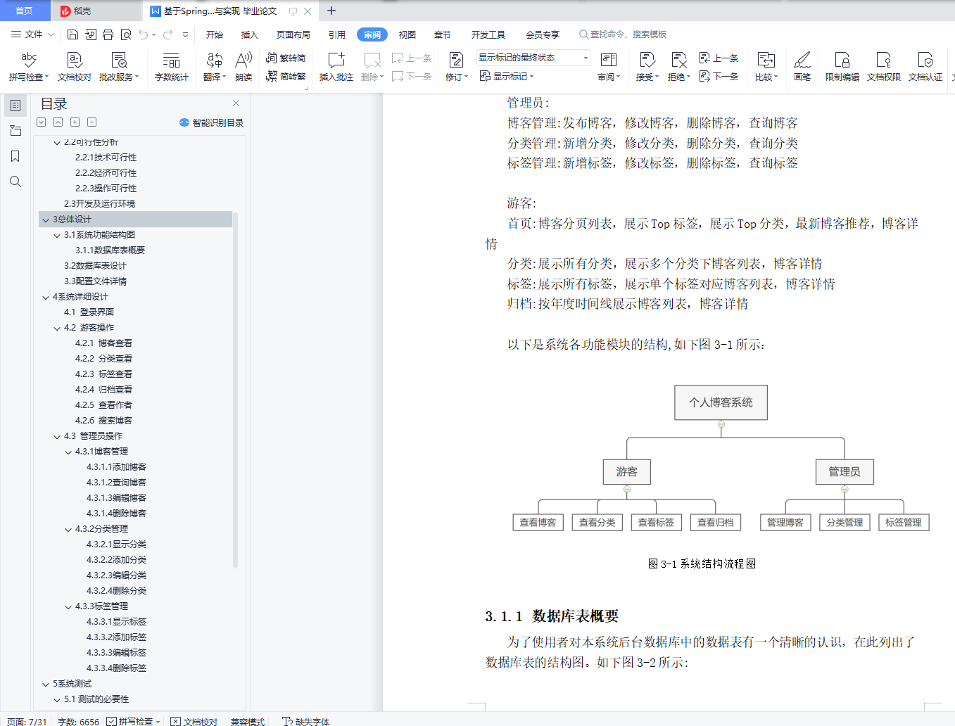 目 录设计总说明 Iintroduction II1 绪论 11.1 系统的概述 11.2 系统的研究背景 12 需求分析 22.1 系统需求分析 22.2 可行性分析 22.2.1 技术可行性 22.2.2 经济可行性 22.2.3 操作可行性 22.3 开发及运行环境 23 总体设计 33.1 系统功能结构图 33.1.1 数据库表概要 33.2 数据库表设计 43.3 配置文件详情 64 系统详细设计 74.1 登录界面 74.2 游客操作 74.2.1 博客查看 74.2.2 分类查看 84.2.3 标签查看 94.2.4 归档查看 104.2.5 查看作者 114.2.6 搜索博客 114.3 管理员操作 124.3.1 博客管理 124.3.2 分类管理 154.3.3 标签管理 185 系统测试 215.1测试的必要性 215.1.1 目的 215.2测试过程 215.2.1 白盒测试 215.3测试结果 235.4项目部署 235.5负载均衡测试 24总 结 25鸣 谢 26参考文献 27摘 要作为计算机的学生,我们学习的方法是通过老师,书籍,论文等。对很多从事计算机方面的人来说,他们学习知识是通过官方文档,以及相关博客。现在知名博客网站有很多,比如CSDN,博客园,还有全球最知名的Github。其中我也在这几个博客中写过一些文章,分享自己学习的成果。因此我在想为什么不自己打造一个属于自己的博客呢。我的博客系统是采用SpringBoot、SpringMvc、Spring、SpringDataJPA等技术栈编写的,数据库采用MySQL。架构方式是采用MVC三层架构方式。管理员可以对博客进行添加,删除,修改,查询操作。游客可以查看管理员编辑的博客,并可以评论,打赏。最后通过测试跟负载均衡完善最终需求。关键词:SpringBoot;Github;MVCintroductionAs computer students, we learn by teachers, books, papers, etc. For many people engaged in computer science, they learn knowledge through official documents and related blogs. Now there are many well-known blog sites, such as CSDN, blog Park, and the world's most famous GitHub. Among them, I also wrote some articles in these blogs to share my learning achievements. So I wonder why not build a blog of my own.My blog system is written by spring boot, spring MVC, spring, spring datajpa and other technology stacks, and the database is mysql. MVC three-tier architecture is adopted. Administrators can add, delete, modify and query blogs. Visitors can view the blog edited by the administrator, and can comment and reward. Finally, the final requirement is improved by testing and load balancing.Keywords: SpringBoot;Github;MVC