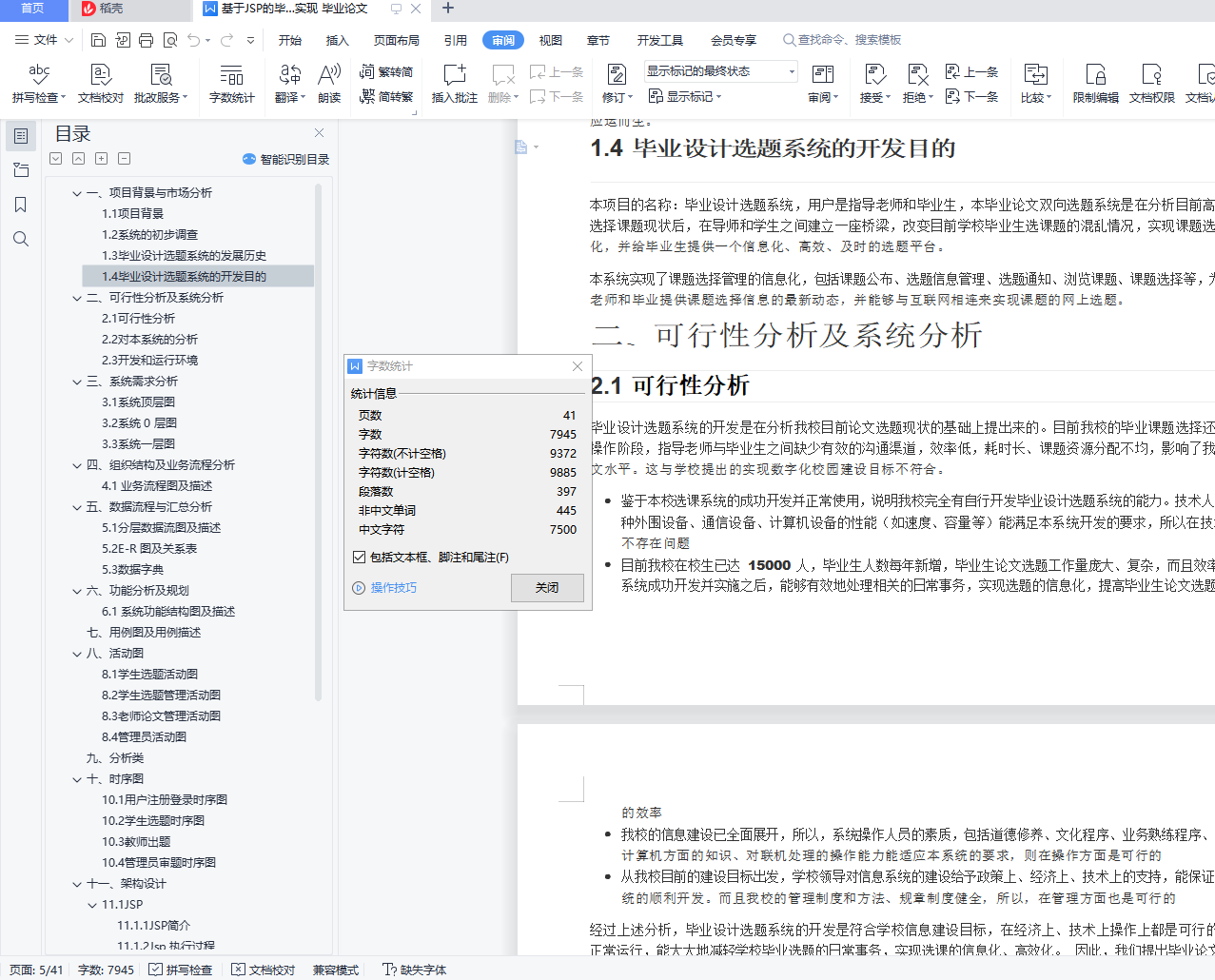 摘要现如今提倡"互联网+"发展的时代,高校信息管理也跟上互联网的步伐,逐渐信息化,智能化.在作者就读的高校中,毕业生的论文以及毕业设计的管理以及资料报存工作,全都是由人工操作来完成的.为了节省时间,以及更好的提高工作效率,学校需要搭建基于JSP的毕业设计管理系统,构建一个更加高效、易用的平台.关键词:选题;选题管理;双向选题;JSP;管理系统summaryNowadays, in the era of advocating "Internet +" development, information management in universities also keeps up with the pace of the Internet and gradually informationized and intelligent.In the universities where the author attends, the management of graduate papers and graduation design and the storage of materials are all completed by manual operation.In order to save time and better improve work efficiency, schools need to build a JSP-based graduation design management system to build a more efficient and easy to use platform.Keywords: topic selection; topic selection management; two-way topic selection; JSP; management system目录一、项目背景与市场分析 31.1 项目背景 31.2 系统的初步调查 51.3 毕业设计选题系统的发展历史 51.4 毕业设计选题系统的开发目的 5二、可行性分析及系统分析 52.1 可行性分析 52.2 对本系统的分析 62.3 开发和运行环境 6三、系统需求分析 63.1 系统顶层图 63.2 系统 0 层图 73.3 系统一层图 7四、组织结构及业务流程分析 94.1 业务流程图及描述 10五、数据流程与汇总分析 145.1 分层数据流图及描述 145.2 E-R 图及关系表 155.3 数据字典 16六、功能分析及规划 196.1 系统功能结构图及描述 19七、用例图及用例描述 21八、活动图 248.1 学生选题活动图 248.2 学生选题管理活动图 258.3 老师论文管理活动图 278.4 管理员活动图 28九、分析类 29十、时序图 3010.1 用户注册登录时序图 3010.2 学生选题时序图 3110.3 教师出题 3210.4 管理员审题时序图 33十一、架构设计 3411.1 JSP 3411.5 MVC 35十二、编码实现 36十三、页面实现 4013.1 毕业设计选题系统首页 4013.2 后台管理登陆页面 4113.3 教师信息添加页面 4113.4 教师信息查询页面 4113.5 课题管理页面 4213.6 新闻添加页面 4213.7 课题添加页面 4313.8 选题管理页面 4313.9 学生选题界面 4413.10 查看选题结果页面 44十四、心得感悟 44