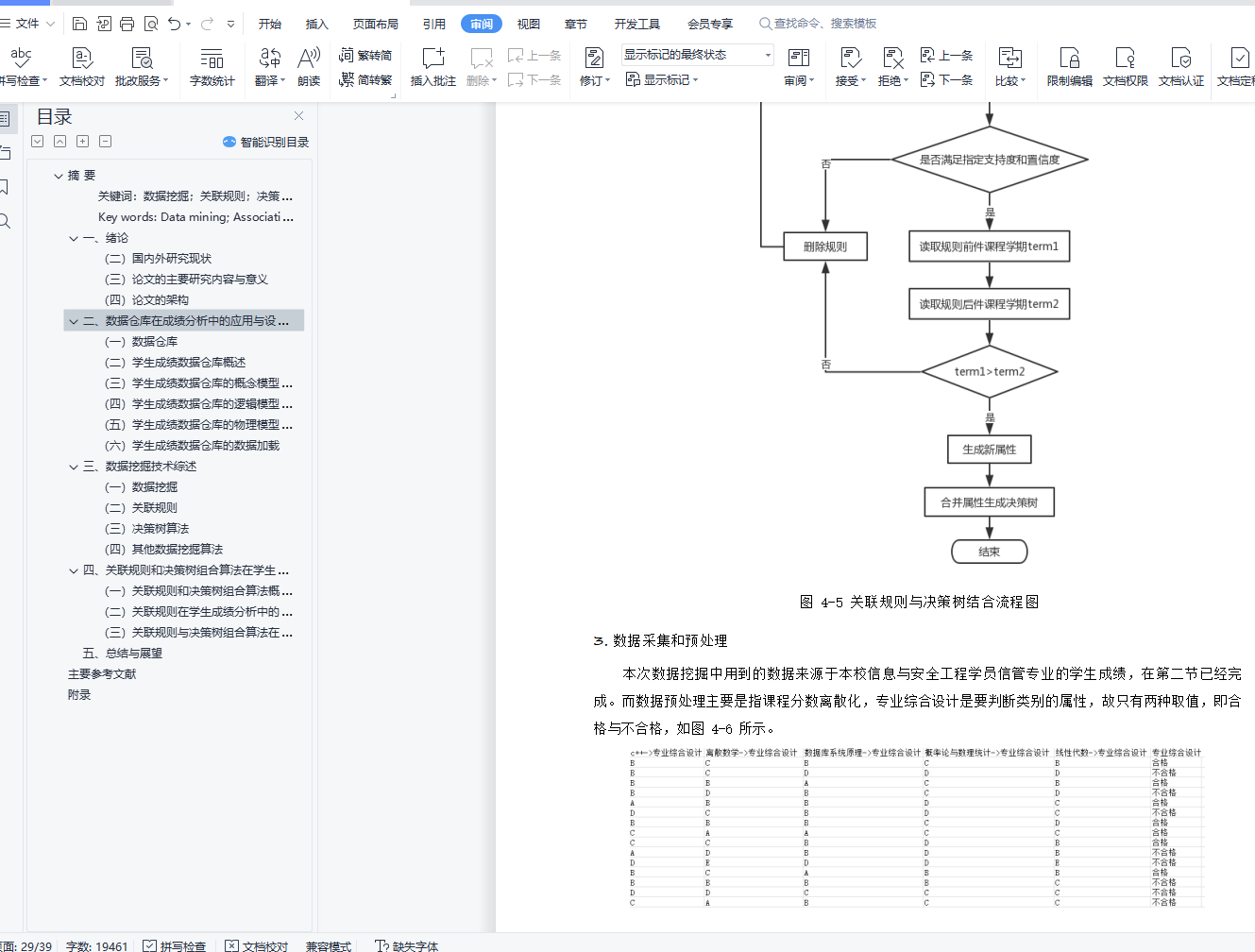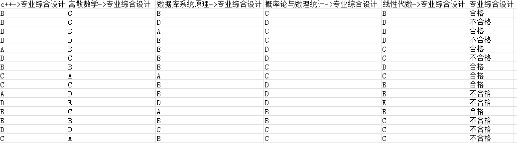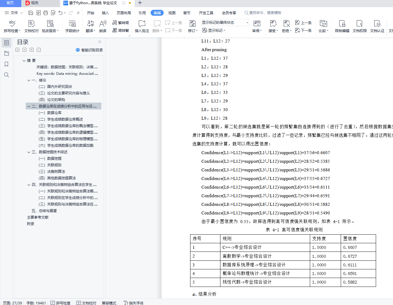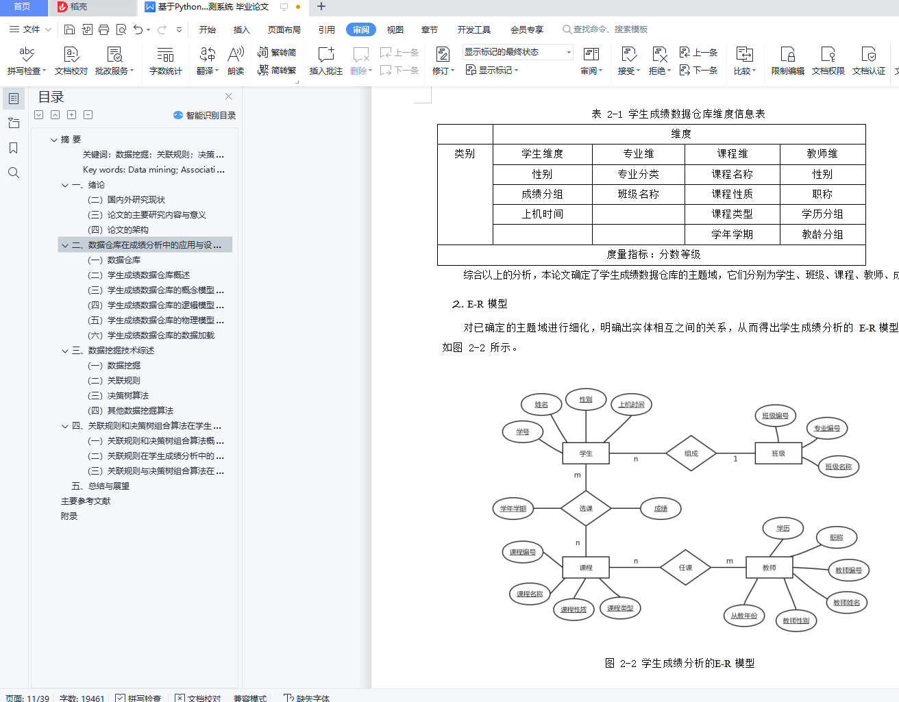 摘 要近年来,大数据引领的风潮不断向各大领域推进,推动了各个领域的发展和变革,教育领域也毫不例外地迈入了大数据时代。教育信息化的快速发展积累了大量的数据,而其中最为重要的就是考试成绩。因此,我们如何利用科学的方法对这些数据进行挖掘与分析,不断革新学生的学习模式、教师的教学模式以及教育政策制定的方法,这个问题引起了广大教育工作者们的关注。目前,大部分学生成绩分析的研究方向一方面是基于关联规则算法展开的,另一方面是基于决策树算法展开的。尽管关联规则能够挖掘出课程之间的关联性,但是却没有考虑学生、教师自身等个性化因素对学生成绩造成的影响,因此关联规则得到的结果通常在个体分析时有失偏颇。而决策树算法虽然能够实现个体学生成绩的预测,但是由于没有考虑到个体学生的课程间的关联性,因而决策树算法得到的预测结果准确度不高。如果能结合关联规则和决策树两者的优势,弥补两者的劣势,就能实现高效的挖掘分析。针对目前研究方向的缺陷,本文提出一种高效的关联规则和决策树组合算法,综合考虑学生课程间的关联性和学生、教师自身等个性化因素,以期提高学生成绩分析结果的准确性。首先,本文基于本校信息与安全工程学院信管专业的学生课程成绩设计以学生成绩为主题的数据仓库,为后续的成绩分析提高可靠的数据支持。其次,利用关联规则算法挖掘分析课程间的关联性,并生成用于构造决策树的新属性。最后,通过信息增益率的思想将生成的新属性和原有属性构造成决策树, 实现学生成绩分析预测。综上所述,本文提出的组合算法应用于学生成绩分析是可行的,其得到的分析预测结果更全面,个体课程成绩预测更为准确,具有一定的实用性。关键词:数据挖掘;关联规则;决策树;成绩分析;数据仓库AbstractIn recent years, the trend which big data leads has continued to advance in all major areas, promoting development and changes in various fields, and the educational field has entered the era of big data without exception. The rapid development of educational informatization has accumulated a large amount of data, and the most important one is the test scores. Therefore, how do we use scientific methods to mine and analyze these data, and constantly innovate students' learning modes, teachers' teaching modes, and educational policy-making methods? This issue has become the focus of educators.At present, most of the research on student achievement data mining is based on association rule algorithm or decision tree algorithm. Although the association rules can excavate the relevance between courses, it does not consider the impact of individual factors such as students and teachers on scores. Therefore, the results obtained by association rules often have an inaccuracy in individual analysis. However, although the decision tree algorithm can achieve the prediction of individual scores, the accuracy of the prediction results obtained by the decision tree algorithm is not high because the relevance between individual students' courses is not taken into account. If we can combine the advantages of both the association rules and the decision tree to make up for the disadvantages of both, we can achieve efficient mining analysis.In view of the shortcomings of the current research direction, this paper proposes an efficient combination algorithm of association rules and decision trees, which comprehensively considers the correlation between students' courses and individual factors such as students and teachers themselves, in order to improve the accuracy of student performance analysis results.First of all, this paper designs a data warehouse based on students’ scores as a result of the student's course performance of the College of Information and Security Engineering College of Information Management so that we can provide reliable data support for subsequent scores’ analysis. Secondly, the association rule algorithm is used to mine and analyze the correlation between courses and generate new attributes for constructing a decision tree. Finally, through the idea of information gain rate, the generated new attributes and original attributes are constructed into a decision tree to achieve students’ scores analysis and prediction.In summary, the combination algorithm proposed in this paper is applicable to the analysis of students’ scores. The analysis and prediction results obtained by it are more comprehensive, and the individual course performance is more accurate and has certain practicality.Key words: Data mining; Association rules; Decision tree algorithm; Performance analysis; Data warehouse目 录一、绪论 1(一)选题背景 1(二)国内外研究现状 1(三)论文的主要研究内容与意义 3(四)论文的架构 3二、数据仓库在成绩分析中的应用与设计 4(一)数据仓库 4(二)学生成绩数据仓库概述 7(三)学生成绩数据仓库的概念模型设计 7(四)学生成绩数据仓库的逻辑模型设计 8(五)学生成绩数据仓库的物理模型设计 10(六)学生成绩数据仓库的数据加载 11三、数据挖掘技术综述 12(一)数据挖掘 12(二)关联规则 13(三)决策树算法 15(四)其他数据挖掘算法 18四、关联规则和决策树组合算法在学生成绩分析中的应用 18(一)关联规则和决策树组合算法概述 18(二)关联规则在学生成绩分析中的应用 19(三)关联规则与决策树组合算法在学生课程成绩分析中的应用 24五、总结与展望 28主要参考文献 29附录 31