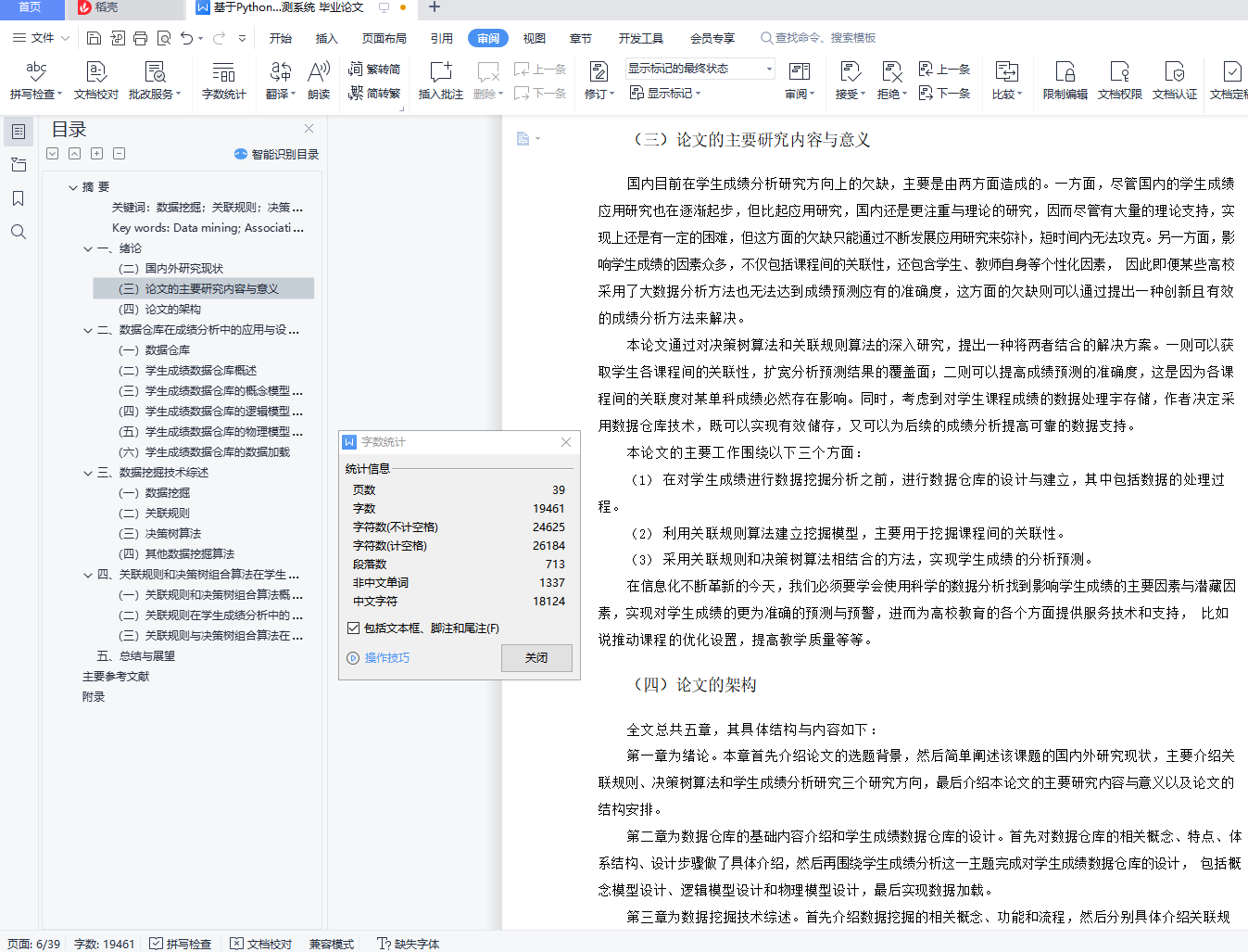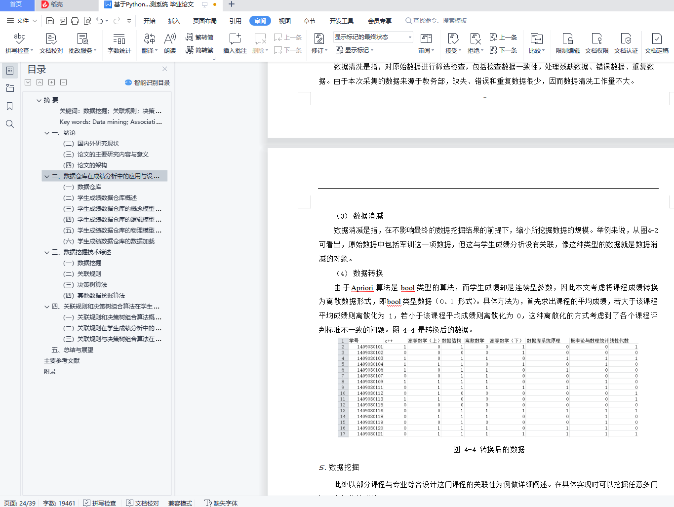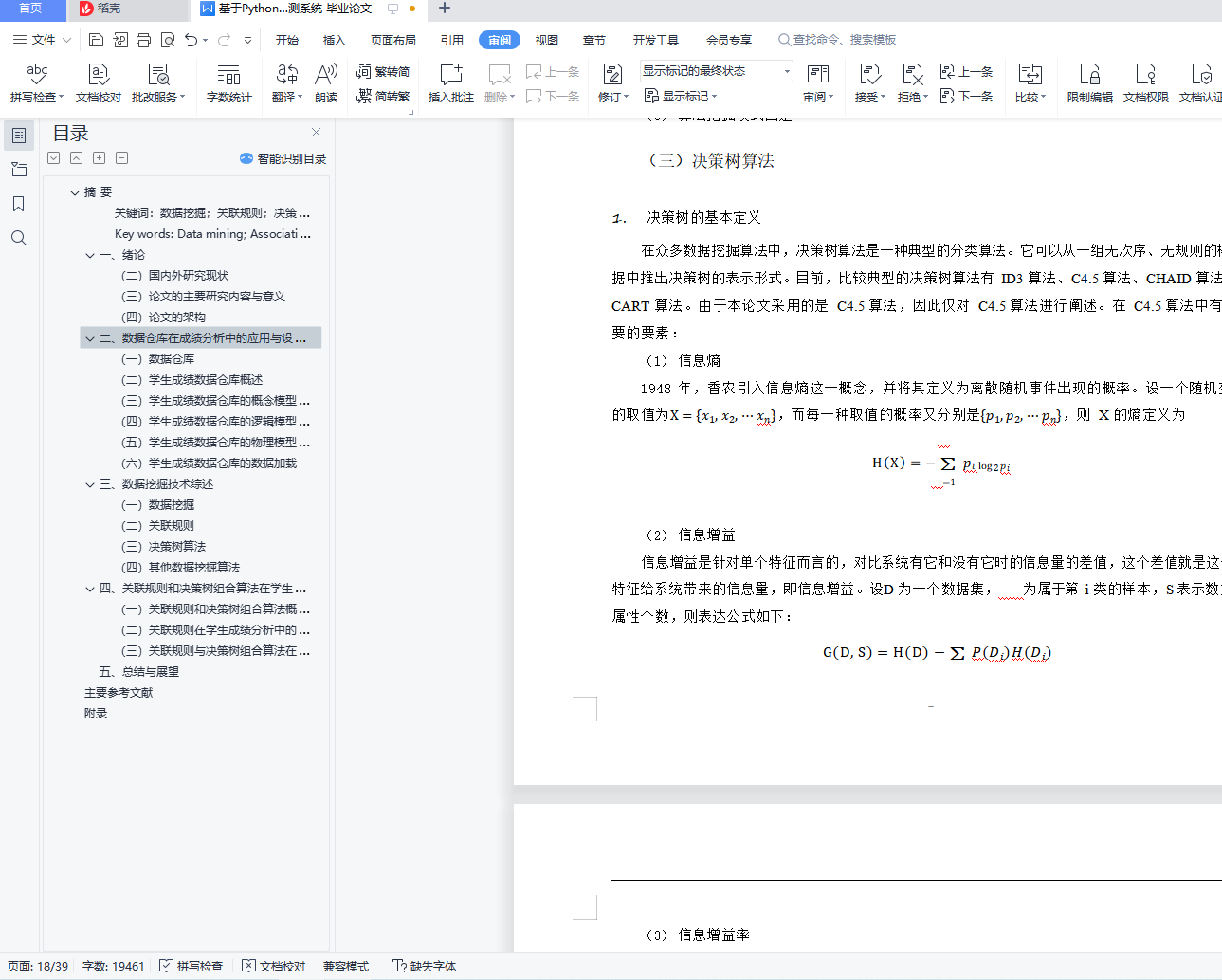 摘 要近年来,大数据引领的风潮不断向各大领域推进,推动了各个领域的发展和变革,教育领域也毫不例外地迈入了大数据时代。教育信息化的快速发展积累了大量的数据,而其中最为重要的就是考试成绩。因此,我们如何利用科学的方法对这些数据进行挖掘与分析,不断革新学生的学习模式、教师的教学模式以及教育政策制定的方法,这个问题引起了广大教育工作者们的关注。目前,大部分学生成绩分析的研究方向一方面是基于关联规则算法展开的,另一方面是基于决策树算法展开的。尽管关联规则能够挖掘出课程之间的关联性,但是却没有考虑学生、教师自身等个性化因素对学生成绩造成的影响,因此关联规则得到的结果通常在个体分析时有失偏颇。而决策树算法虽然能够实现个体学生成绩的预测,但是由于没有考虑到个体学生的课程间的关联性,因而决策树算法得到的预测结果准确度不高。如果能结合关联规则和决策树两者的优势,弥补两者的劣势,就能实现高效的挖掘分析。针对目前研究方向的缺陷,本文提出一种高效的关联规则和决策树组合算法,综合考虑学生课程间的关联性和学生、教师自身等个性化因素,以期提高学生成绩分析结果的准确性。首先,本文基于本校信息与安全工程学院信管专业的学生课程成绩设计以学生成绩为主题的数据仓库,为后续的成绩分析提高可靠的数据支持。其次,利用关联规则算法挖掘分析课程间的关联性,并生成用于构造决策树的新属性。最后,通过信息增益率的思想将生成的新属性和原有属性构造成决策树, 实现学生成绩分析预测。综上所述,本文提出的组合算法应用于学生成绩分析是可行的,其得到的分析预测结果更全面,个体课程成绩预测更为准确,具有一定的实用性。关键词:数据挖掘;关联规则;决策树;成绩分析;数据仓库AbstractIn recent years, the trend which big data leads has continued to advance in all major areas, promoting development and changes in various fields, and the educational field has entered the era of big data without exception. The rapid development of educational informatization has accumulated a large amount of data, and the most important one is the test scores. Therefore, how do we use scientific methods to mine and analyze these data, and constantly innovate students' learning modes, teachers' teaching modes, and educational policy-making methods? This issue has become the focus of educators.At present, most of the research on student achievement data mining is based on association rule algorithm or decision tree algorithm. Although the association rules can excavate the relevance between courses, it does not consider the impact of individual factors such as students and teachers on scores. Therefore, the results obtained by association rules often have an inaccuracy in individual analysis. However, although the decision tree algorithm can achieve the prediction of individual scores, the accuracy of the prediction results obtained by the decision tree algorithm is not high because the relevance between individual students' courses is not taken into account. If we can combine the advantages of both the association rules and the decision tree to make up for the disadvantages of both, we can achieve efficient mining analysis.In view of the shortcomings of the current research direction, this paper proposes an efficient combination algorithm of association rules and decision trees, which comprehensively considers the correlation between students' courses and individual factors such as students and teachers themselves, in order to improve the accuracy of student performance analysis results.First of all, this paper designs a data warehouse based on students’ scores as a result of the student's course performance of the College of Information and Security Engineering College of Information Management so that we can provide reliable data support for subsequent scores’ analysis. Secondly, the association rule algorithm is used to mine and analyze the correlation between courses and generate new attributes for constructing a decision tree. Finally, through the idea of information gain rate, the generated new attributes and original attributes are constructed into a decision tree to achieve students’ scores analysis and prediction.In summary, the combination algorithm proposed in this paper is applicable to the analysis of students’ scores. The analysis and prediction results obtained by it are more comprehensive, and the individual course performance is more accurate and has certain practicality.Key words: Data mining; Association rules; Decision tree algorithm; Performance analysis; Data warehouse目 录一、绪论 1(一)选题背景 1(二)国内外研究现状 1(三)论文的主要研究内容与意义 3(四)论文的架构 3二、数据仓库在成绩分析中的应用与设计 4(一)数据仓库 4(二)学生成绩数据仓库概述 7(三)学生成绩数据仓库的概念模型设计 7(四)学生成绩数据仓库的逻辑模型设计 8(五)学生成绩数据仓库的物理模型设计 10(六)学生成绩数据仓库的数据加载 11三、数据挖掘技术综述 12(一)数据挖掘 12(二)关联规则 13(三)决策树算法 15(四)其他数据挖掘算法 18四、关联规则和决策树组合算法在学生成绩分析中的应用 18(一)关联规则和决策树组合算法概述 18(二)关联规则在学生成绩分析中的应用 19(三)关联规则与决策树组合算法在学生课程成绩分析中的应用 24五、总结与展望 28主要参考文献 29附录 31