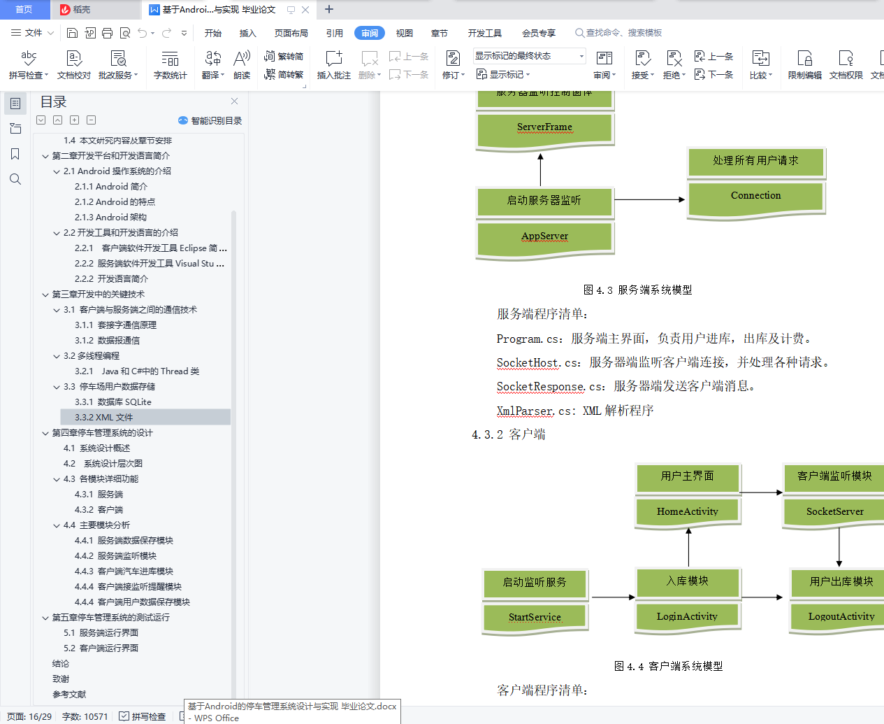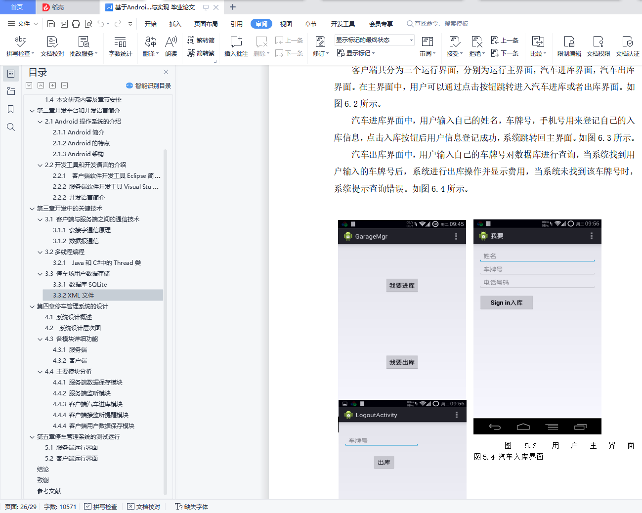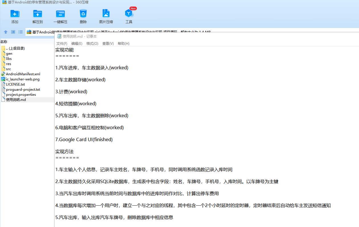 目录摘要 5Abstract: 6引言 7第一章 绪论 8基于Android的停车管理系统 5A Parking Management System Based on Android Operating System 6Abstract: 6引言 7第一章 绪论 81.1所选课题的研究背景与意义 81.2设计系统所要达到的要求 91.3 C/S结构简介 91.4 本文研究内容及章节安排 9第二章 开发平台和开发语言简介 102.1 Android操作系统的介绍 102.1.1 Android简介 102.1.2 Android的特点 102.1.3 Android架构 102.2开发工具和开发语言的介绍 112.2.1 客户端软件开发工具Eclipse简介 112.2.2 服务端软件开发工具Visual Studio简介 122.2.2 开发语言简介 12第三章 开发中的关键技术 133.1 客户端与服务端之间的通信技术 133.1.1 套接字通信原理 133.1.2 数据报通信 133.2 多线程编程 133.2.1 Java和C#中的Thread类 143.3 停车场用户数据存储 143.3.1 数据库SQLite 143.3.2 XML文件 15第四章 停车管理系统的设计 164.1 系统设计概述 164.2 系统设计层次图 164.3 各模块详细功能 174.3.1 服务端 174.3.2 客户端 184.4 主要模块分析 184.4.1 服务端数据保存模块 184.4.2 服务端监听模块 204.4.3 客户端汽车进库模块 224.4.4 客户端接监听提醒模块 224.4.4 客户端用户数据保存模块 24第五章 停车管理系统的测试运行 265.1 服务端运行界面 265.2 客户端运行界面 27结论 29致谢 30参考文献 31摘要:随着我国现代化进程的不断加快,私家车的数量急剧增加,各类停车场的车流量不断增多,对机动车的保管越来越成为社会倍受关注的问题。本论文主要介绍了Android系统架构,并且针对现在普遍采用的人工收费管理方法存在的弊端,提出了一套由Android SDK和Visual C#开发设计的车库车位管理信息系统,使用Socket技术进行电脑服务端和手机客户端之间的通信,手机端软件和电脑端软件分别采用SQLite和XML保存用户数据,采用流行的C/S 结构,也就是客户端/服务器模式。该系统在入口处由用户使用智能手机输入用户的姓名,车牌号,手机号等信息,在出口处服务端根据车牌号在停车记录中自动查找该车信息,并自动计费,收取停车费,当用户停车超过一定时间时,系统会自动发送短信提醒。该系统共分为登录模块、计费模块、查询模块、用户管理模块、短信提醒模块,文中对各模块的功能、操作界面、工作流程做了详细的介绍。关键词:C/S结构;Android操作系统;Socket通信;停车管理Abstract: With the development of economy, the number of cars increasing drastically, so a serious problem emerge: how to supervise the park of cars.This paper mainly introduce the framework of Android Operating System and bring out a new car management system that can replace the old which is done by human power. The system is based on Android SDK and Visual C# development platform. It uses Socket technology to communicate between mobile phone and computer and employs XML file on computer, SQLite on mobile phone accordingly to store user data. The system needs user entering their name, phone number, car number when they arrive, and calculate parking time and fee when they leave. This system contains login module, counting fee module, query module, user management module and SMS notification module.Keywords: C/S Architecture; Android Operating System; Socket Communication; Garage Management