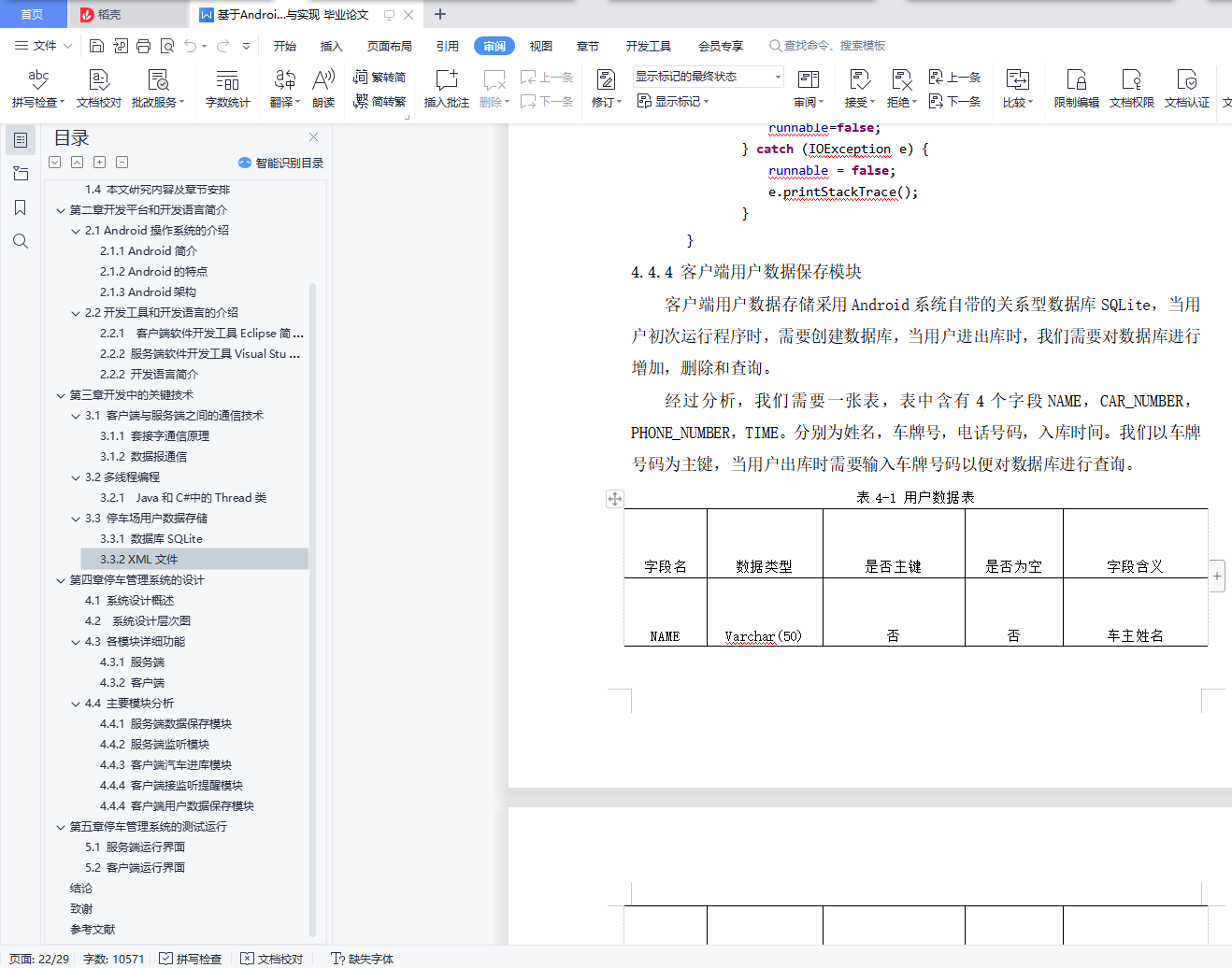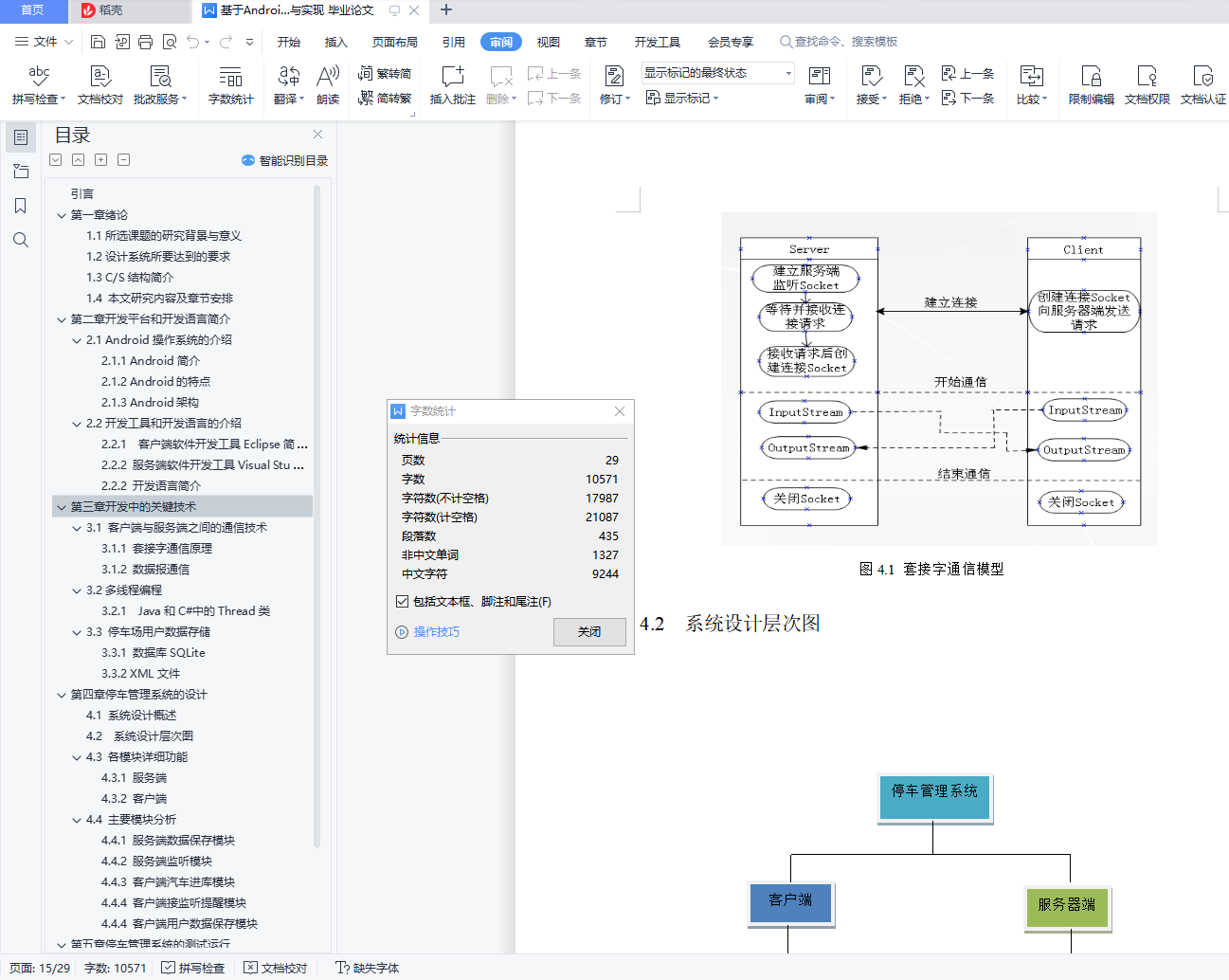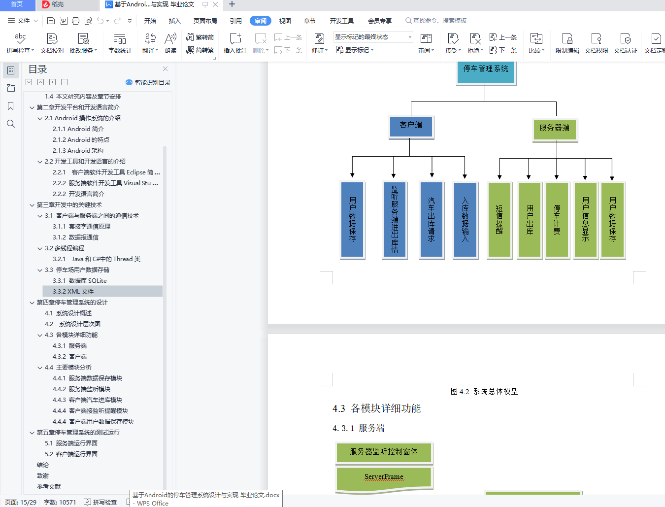 目录摘要 5Abstract: 6引言 7第一章 绪论 8基于Android的停车管理系统 5A Parking Management System Based on Android Operating System 6Abstract: 6引言 7第一章 绪论 81.1所选课题的研究背景与意义 81.2设计系统所要达到的要求 91.3 C/S结构简介 91.4 本文研究内容及章节安排 9第二章 开发平台和开发语言简介 102.1 Android操作系统的介绍 102.1.1 Android简介 102.1.2 Android的特点 102.1.3 Android架构 102.2开发工具和开发语言的介绍 112.2.1 客户端软件开发工具Eclipse简介 112.2.2 服务端软件开发工具Visual Studio简介 122.2.2 开发语言简介 12第三章 开发中的关键技术 133.1 客户端与服务端之间的通信技术 133.1.1 套接字通信原理 133.1.2 数据报通信 133.2 多线程编程 133.2.1 Java和C#中的Thread类 143.3 停车场用户数据存储 143.3.1 数据库SQLite 143.3.2 XML文件 15第四章 停车管理系统的设计 164.1 系统设计概述 164.2 系统设计层次图 164.3 各模块详细功能 174.3.1 服务端 174.3.2 客户端 184.4 主要模块分析 184.4.1 服务端数据保存模块 184.4.2 服务端监听模块 204.4.3 客户端汽车进库模块 224.4.4 客户端接监听提醒模块 224.4.4 客户端用户数据保存模块 24第五章 停车管理系统的测试运行 265.1 服务端运行界面 265.2 客户端运行界面 27结论 29致谢 30参考文献 31摘要:随着我国现代化进程的不断加快,私家车的数量急剧增加,各类停车场的车流量不断增多,对机动车的保管越来越成为社会倍受关注的问题。本论文主要介绍了Android系统架构,并且针对现在普遍采用的人工收费管理方法存在的弊端,提出了一套由Android SDK和Visual C#开发设计的车库车位管理信息系统,使用Socket技术进行电脑服务端和手机客户端之间的通信,手机端软件和电脑端软件分别采用SQLite和XML保存用户数据,采用流行的C/S 结构,也就是客户端/服务器模式。该系统在入口处由用户使用智能手机输入用户的姓名,车牌号,手机号等信息,在出口处服务端根据车牌号在停车记录中自动查找该车信息,并自动计费,收取停车费,当用户停车超过一定时间时,系统会自动发送短信提醒。该系统共分为登录模块、计费模块、查询模块、用户管理模块、短信提醒模块,文中对各模块的功能、操作界面、工作流程做了详细的介绍。关键词:C/S结构;Android操作系统;Socket通信;停车管理Abstract: With the development of economy, the number of cars increasing drastically, so a serious problem emerge: how to supervise the park of cars.This paper mainly introduce the framework of Android Operating System and bring out a new car management system that can replace the old which is done by human power. The system is based on Android SDK and Visual C# development platform. It uses Socket technology to communicate between mobile phone and computer and employs XML file on computer, SQLite on mobile phone accordingly to store user data. The system needs user entering their name, phone number, car number when they arrive, and calculate parking time and fee when they leave. This system contains login module, counting fee module, query module, user management module and SMS notification module.Keywords: C/S Architecture; Android Operating System; Socket Communication; Garage Management