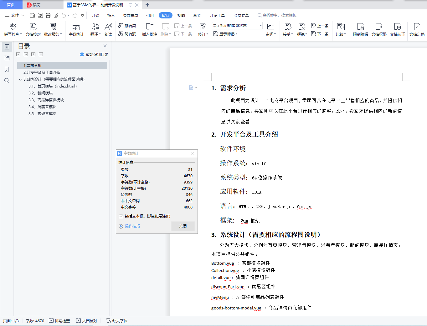 目录1. 需求分析 12. 开发平台及工具介绍 13. 系统设计(需要相应的流程图说明) 13.1、首页模块(index.html) 23.2、新闻模块 53.3、商品详情页模块 63.4、消费者模块 73.5、管理者模块 91.需求分析此项目为设计一个电商平台项目,卖家可以在此平台上出售相应的商品,并提供相应的商品信息,买家则可以在此平台进行相应的购买。此外,卖家还提供相应的新闻信息供买家查看。2.开发平台及工具介绍软件环境操作系统:win 10系统类型:64位操作系统应用软件:IDEA语言:HTML 、CSS、JavaScript、Vue.js框架: Vue 框架
