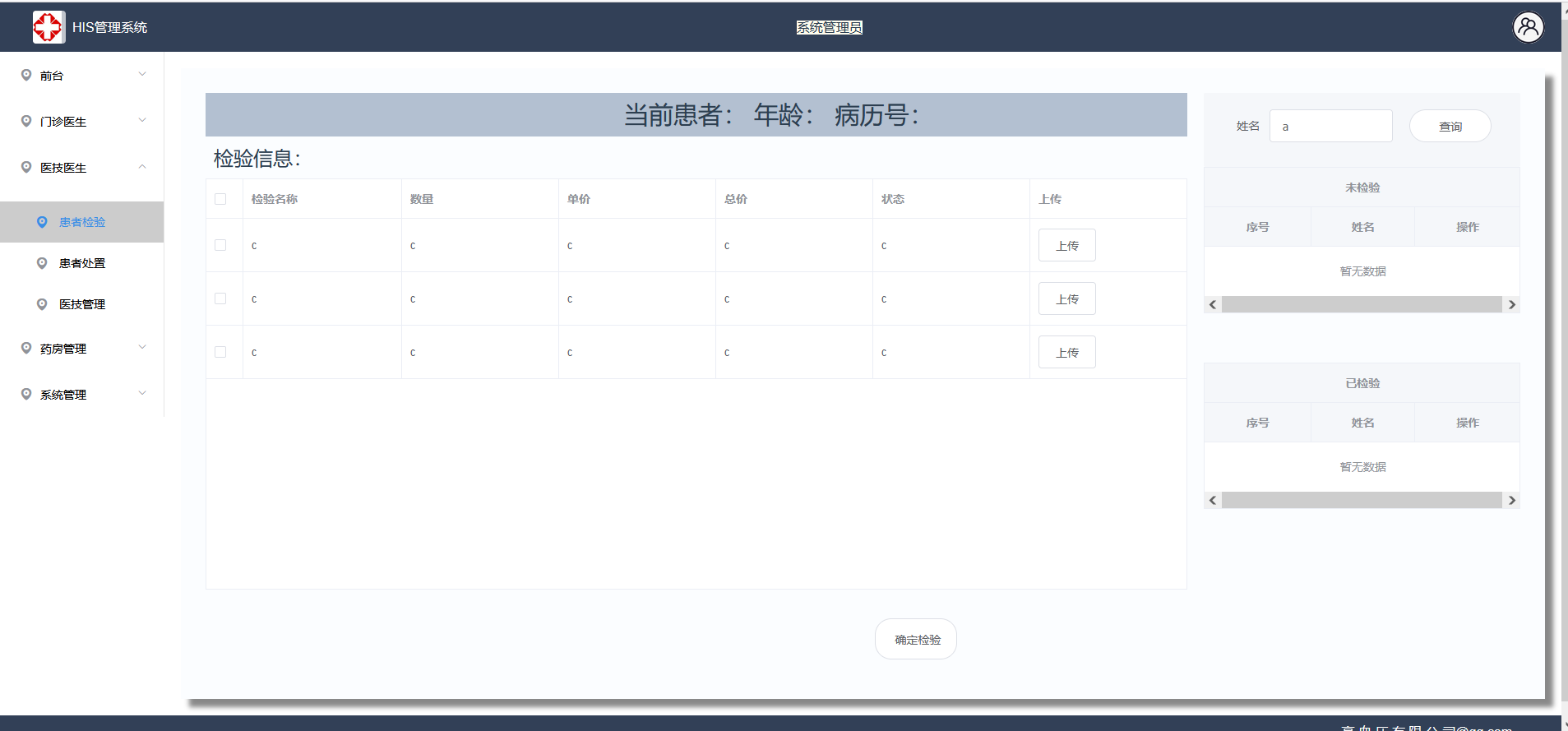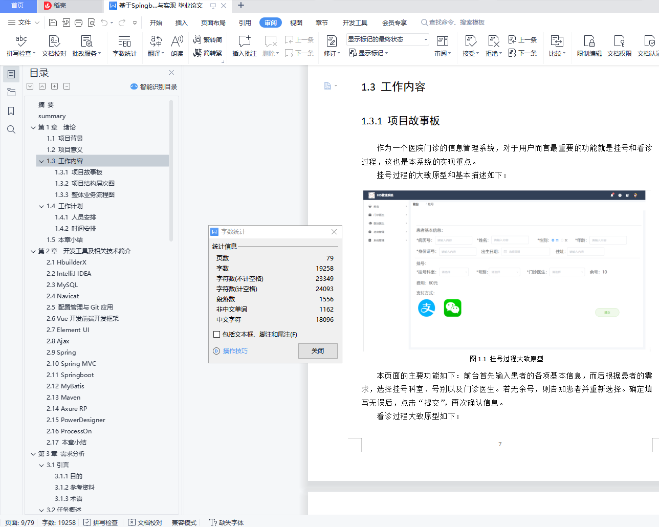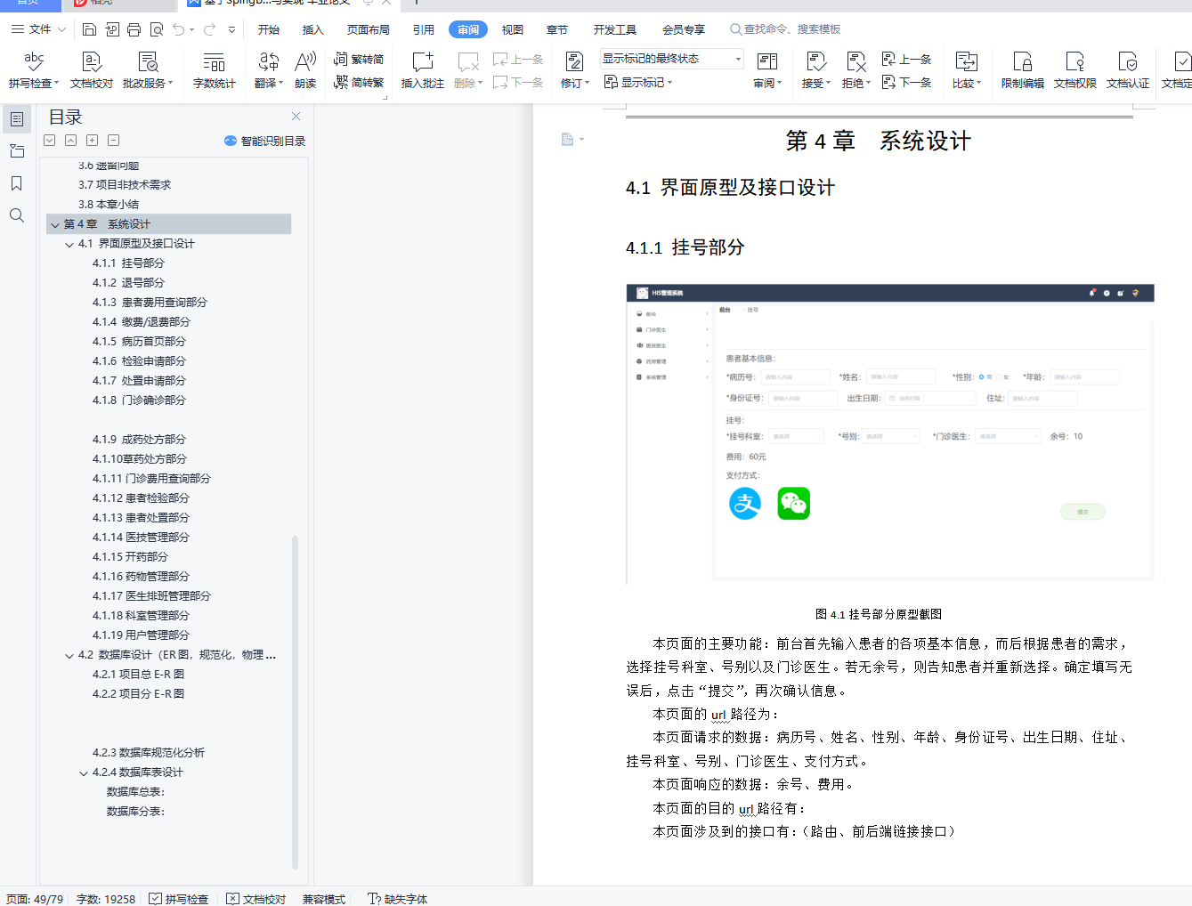 摘 要医院门诊信息管理系统是根据医院的门诊部分以及门诊部分配套的前台、医技、药房等部分的实际情况进行开发编写的一套全方位的管理系统。它的主要目的是方便医院对于门诊部分以及其配套的一些子部份进行集中管理,方便医生的看诊过程和患者的就诊过程,提高医生的工作效率以及患者的满意度。本系统的前端主要使用了Vue框架、Element UI和AJAX技术。Vue采用自底向上增量开发的设计。Vue 的核心库只关注视图层,并且非常容易学习,也非常容易与其它库或已有项目整合。Element UI则具有一致性、优化反馈、高效率和可控的优点。项目后端主要使用了Spring等一系列框架和MyBatis以及Maven。这一套技术易于学习、操作和管理。数据库方面则是使用了MySQL数据库以及Navicat数据库管理工具,轻量,易于管理。本系统基本实现了项目需求中提出的各项内容,主要实现了前台部分、门诊医生部分、医技医生部分、药房部分和系统管理部分五个子系统。其中前台部分包含了现场挂号、退号、费用查询、收费退费四个子模块;门诊医生部分包含了病历首页、检验申请、门诊确诊、处置申请、药物处方、费用查询六个子模块;医技医生部分包含了患者检验、患者处置、医技管理三个子模块;药房管理部分包含出药和药品管理两个子模块;系统管理部分包含科室管理、医生排班管理、用户管理三个子模块。本文将从所应用的技术、具体的实现、完成的功能、在系统中的作用等方面,对我们实现的医院门诊管理系统进行详细的描述。关键词HIS医院信息系统;前后端分离;VUE;SpingbootsummaryThe outpatient information management system of the hospital is an all-round management system developed and written according to the actual situation of the outpatient part of the hospital and the supporting reception desk, medical technology, pharmacy and other parts of the outpatient part.Its main purpose is to facilitate the hospital to conduct centralized management of the outpatient department and its supporting subsidiaries, so as to facilitate the consultation process of doctors and the treatment process of patients, and improve the work efficiency of doctors and patient satisfaction.The front end of this system mainly uses the Vue framework, Element UI, and AJAX technologies.The Vue uses a bottom-up incremental development design.Vue's core library focuses only on the view layer and is very easy to learn and easily integrate with other libraries or existing projects.Element UI has the advantages of consistency, optimized feedback, high efficiency, and control.The backend of the project mainly uses a series of frameworks like Spring and MyBatis as well as Maven.This set of technologies is easy to learn, operate, and manage.In the database side, MySQL database and Navicat database management tools are lightweight and easy to manage.The system basically realizes the contents proposed in the project needs, mainly realizing five sub-systems: front desk part, outpatient doctor part, medical technology doctor part, pharmacy part and system management part.The front desk part includes four sub-modules: field registration, withdrawal, fee inquiry and fee refund; outpatient doctor part includes home page, inspection application, outpatient diagnosis, treatment application, drug prescription, fee inquiry; medical doctor part includes patient inspection, patient disposal, medical technology management; pharmacy management part includes two submodules of drug delivery and drug management; and system management part includes three submodules: department management, physician scheduling management and user management.This paper will provide a detailed description of the hospital outpatient management system we implement in terms of the applied technology, specific implementation, completed functions, role in the system, etc.Keywords HIS hospital information system; front and rear separation; VUE;Spingboot目录摘 要 Isummary 1第1章 绪论 51.1 项目背景 51.2 项目意义 61.3 工作内容 61.3.1 项目故事板 61.3.2 项目结构层次图 91.3.3 整体业务流程图 91.4 工作计划 101.4.1 人员安排 101.4.2 时间安排 101.5 本章小结 10第2章 开发工具及相关技术简介 112.1 HbuilderX 112.2 IntelliJ IDEA 112.3 MySQL 112.4 Navicat 122.5 配置管理与Git应用 122.6 Vue开发前端开发框架 122.7 Element UI 132.8 Ajax 132.9 Spring 132.10 Spring MVC 132.11 Springboot 132.12 MyBatis 142.13 Maven 142.14 Axure RP 142.15 PowerDesigner 152.16 ProcessOn 152.17 本章小结 15第3章 需求分析 163.1引言 163.1.1目的 163.1.2参考资料 163.1.3术语 163.2任务概述 163.2.1目标 163.3需求规定 163.3.1一般性需求 163.3.2功能性需求 173.3.3挂号 193.3.4缴费/退费 213.3.5病例填写 233.3.6 检验申请 253.3.7门诊确诊 263.3.8处置申请 283.3.9开立处方 303.3.10处方管理 313.3.11患者检验 323.3.12患者处置 343.3.13医技管理 363.3.14药房开药 373.3.15药房管理 393.3.16医生排班管理 403.3.17科室管理 413.3.18用户管理 433.4系统安全性的要求 453.4.1数据存储安全 453.4.2访问控制安全 453.4.3网络传输安全 453.4.4应用系统审计 453.4.5系统约束 453.5运行环境规定 453.5.1运行环境 453.5.2接口 463.6遗留问题 463.7项目非技术需求 463.8本章小结 46第4章 系统设计 474.1 界面原型及接口设计 474.1.1 挂号部分 474.1.2 退号部分 484.1.3 患者费用查询部分 494.1.4 缴费/退费部分 504.1.5 病历首页部分 514.1.6 检验申请部分 524.1.7 处置申请部分 534.1.8 门诊确诊部分 544.1.9 成药处方部分 554.1.10 草药处方部分 564.1.11门诊费用查询部分 574.1.12患者检验部分 584.1.13患者处置部分 594.1.14医技管理部分 604.1.15开药部分 604.1