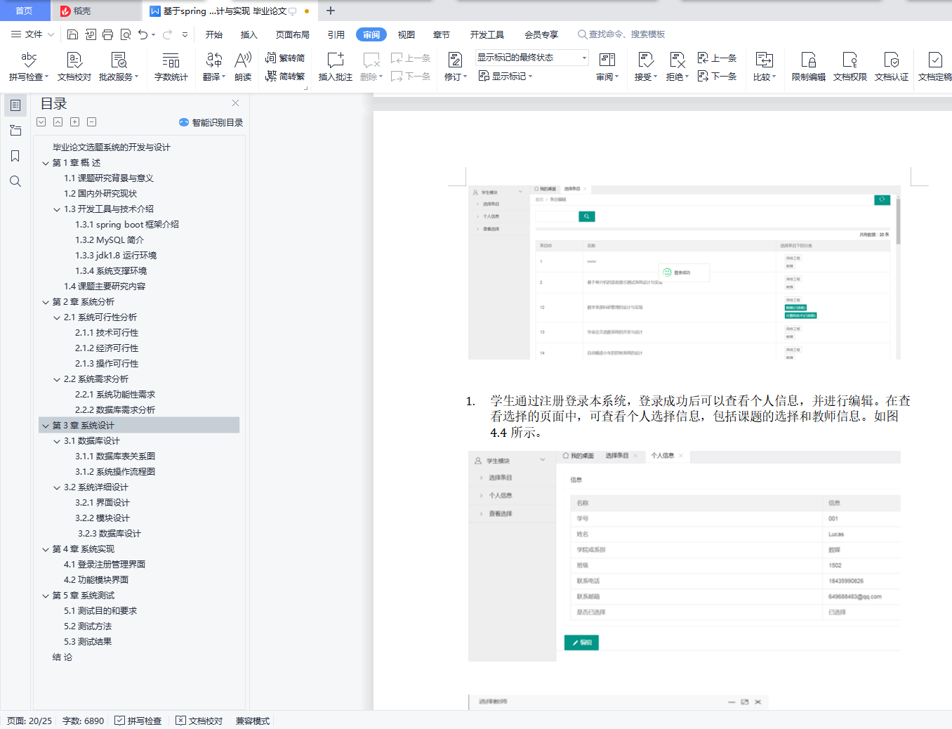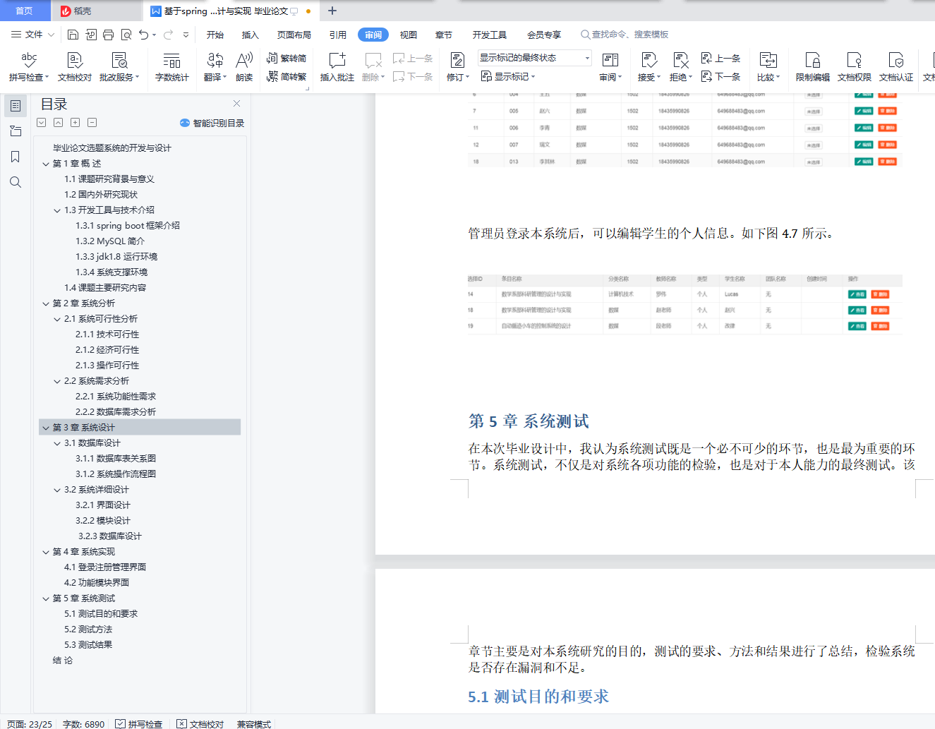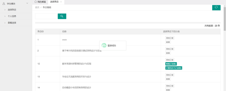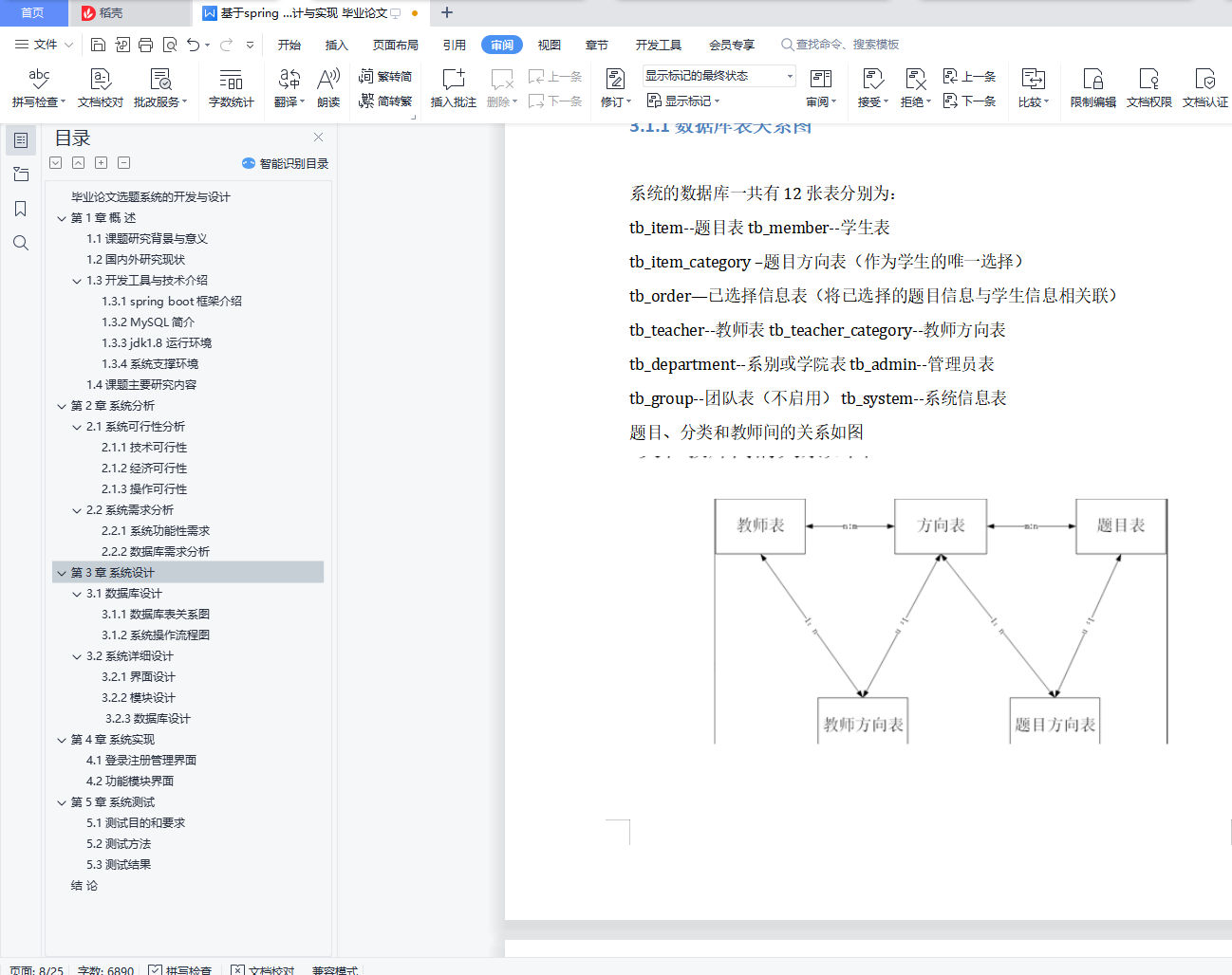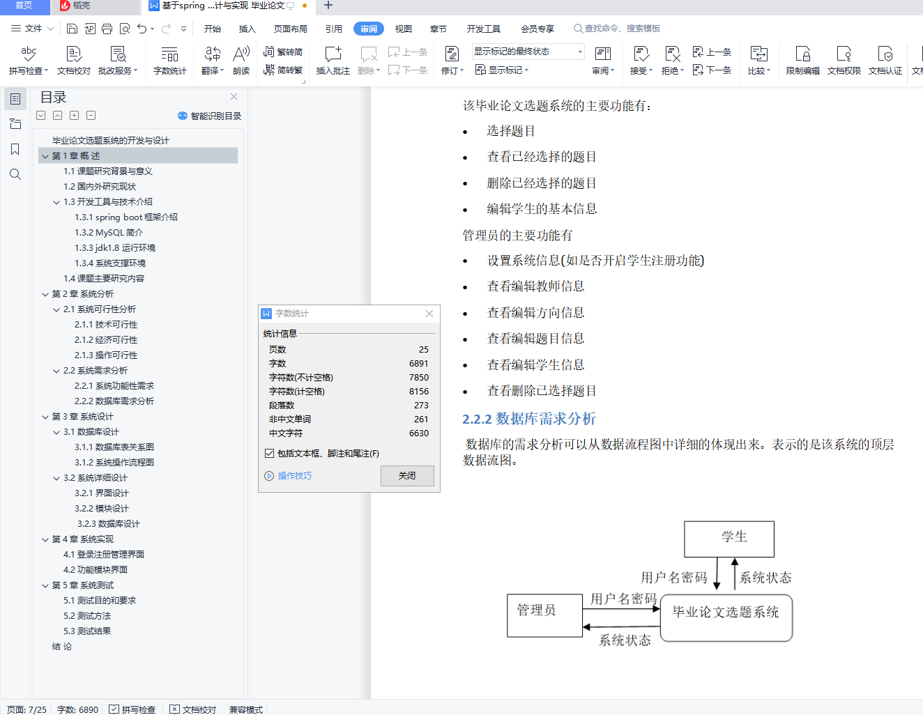 毕业论文选题系统的开发与设计摘 要:伴随着我国高校招生发展趋势的不断扩大,各大高校教学方式的难题和工作量不断增加。传统的管理方式需要耗费大量的资源去处理。所以高校学生论文选题时容易导致出错,出现效率低,质量低,学生对已选择的题目难以进行更改等问题。其次,管理员无法实时有效的对学生、题目、和已选择的题目进行修改编辑;难以实时获取到一个统一的学生论文选择的情况。综上,学院需要拥有一个基于 WEB 的毕业论文选题系统去提高工作效率,减轻工作 负荷的,提高学生选题灵活性。此系统由教师管理员和学生两部分构成,主要包括:选题题目、管理学生的课题、学生查询课题、学生选择课题等模块。设计该系统需要用到Eclipse以及存储数据的MySQL。论文主要介绍了系统的相关技术,对其技术分析,并给出了系统的概要设计、数据库设计和详细的设计,实现完成的系统在运行中没有问题。关键词:学生选课 MVC MySQL近十年以来,在科学技术不断进步,网络信息技术的繁荣,尤其是互联网的普遍应用,在根本上解决的信息传输的难题。构建了一个组织良好的信息结构框架,使用户能够访问媒体文档的信息。在任何网络终端以简单统一的方式进行TS。跟紧Internet的脚步,我国各个高校也开始运用,为了加快现代信息化的进程,各个高校基本都在校园建立了自己的校园网络。为我们现代化的网络教育提供了必备的物质基础。在当下信息爆炸式发展的时代,选择毕业生的原始方法,即手工原始提交的方法,由之凸显出很多缺点和不足,如时间消耗大、工作效率低,而计算机科学与技术系却可以通过Internet来实现网上选题的功能。该网上选题系统,与传统纯手工相比,具有很大的优点。比如:检索迅速,查询快捷,时间消耗量减少,存储更多等优点。所以,这个系统将计划在网页上对学生的选题进行操作。具体的思路是设计与开发毕业了论文选题系统,并且在网页上注册自己的学号以及相关信息,以自己的学号为信息进行选题,帮助应届生更好更快的完成论文的选题工作。本文主要从系统分析,系统设计,系统实现和测试几个方面对该系统进行阐述。系统分析包括可行性分析和需求分析。系统设计从总体和详细对系统进行主要分析。在第三章中实现了对该设计的功能实现,实现各个模块的主要功能之后,对系统进行了非常严谨的测试。目录毕业论文选题系统的开发与设计 1第1章 概 述 31.1 课题研究背景与意义 31.2 国内外研究现状 41.3 开发工具与技术介绍 41.3.1 spring boot框架介绍 41.3.2 MySQL简介 41.3.3 jdk1.8运行环境 41.3.4 系统支撑环境 41.4 课题主要研究内容 5第2章 系统分析 52.1 系统可行性分析 52.1.1 技术可行性 52.1.2 经济可行性 62.1.3 操作可行性 62.2 系统需求分析 62.2.1 系统功能性需求 62.2.2 数据库需求分析 6第3章 系统设计 73.1 数据库设计 73.1.1 数据库表关系图 73.1.2 系统操作流程图 83.2 系统详细设计 103.2.1 界面设计 103.2.2 模块设计 123.2.3 数据库设计 13第4章 系统实现 174.1 登录注册管理界面 174.2 功能模块界面 19第5章 系统测试 225.1 测试目的和要求 235.2 测试方法 235.3 测试结果 23结 论 23