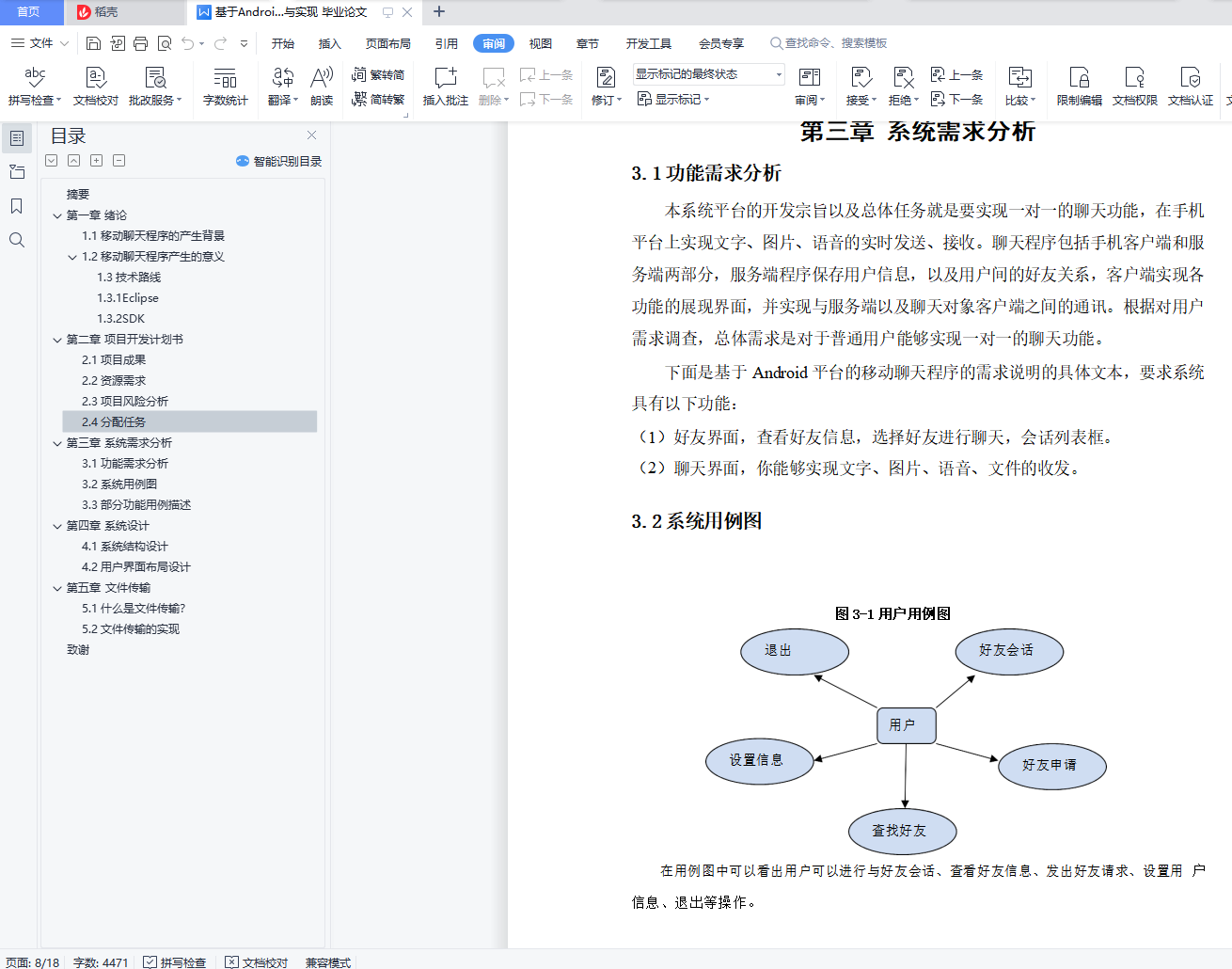 本设计通过配置 Android SDK、Eclipse、ADT 插件、java-jdk 来搭建 Android 的运行环境和 Android 程序开发过程中可以使用其自带的内嵌的 SQLite 数据库 来实现程序的结构化数据存储,能够实现用户的一对一的聊天功能,在 Android 手机平台上实现聊天满足文字、图片、语音的实时收发。聊天程序包括手机客户 端和服务端两部分,服务端程序利用数据库保存用户的信息,客户端实现各功能 的展现界面,并实现与服务端以及聊天对象客户端之间的通信,本程序利用 StartUML 工具,进行统一建模并进行系统用例模型的设计,进而完成移动聊天 程序。