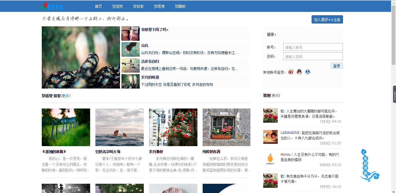 Chinese culture has a long history, Since ancient times, Literati make rhyme, show off literary skill, full of elegance. Today there are singer and writer make idea to article and Elegant, full of elegant. Culture is inherited and endless, Is also the pursuit of many people. From a variety of cultures, We raise and rich ourselves. All I have to do now is to provide a platform for this kind of culture, Through this platform, users can view all kinds of prose poetry, all kinds of excellent user ideas, explore the mysteries of the world. So as to enhance their literary quality, cultural heritage and cultural knowledge. The present society tends to be digitized and Informatization, More and more people have access to information through the Internet to raise themselves. And this platform will cater to the development of society, in line with the people's daily habits.