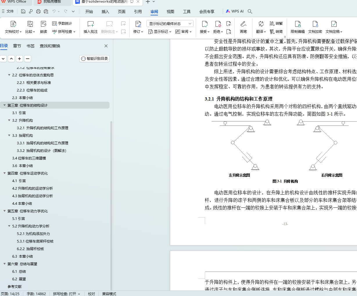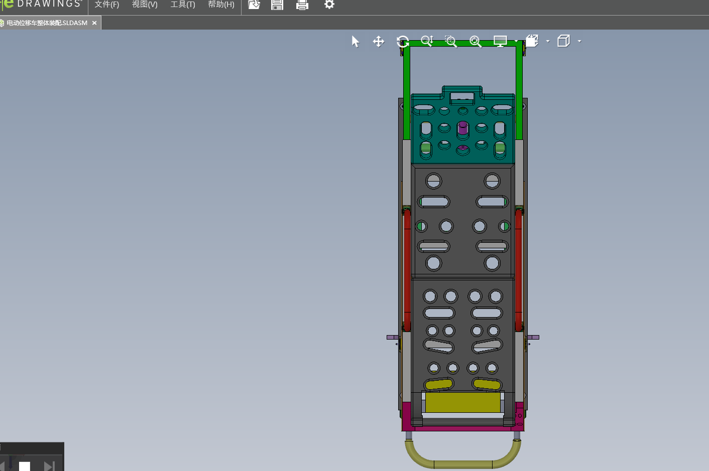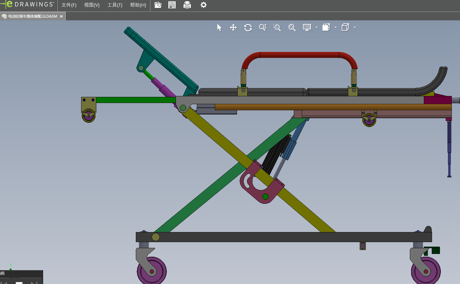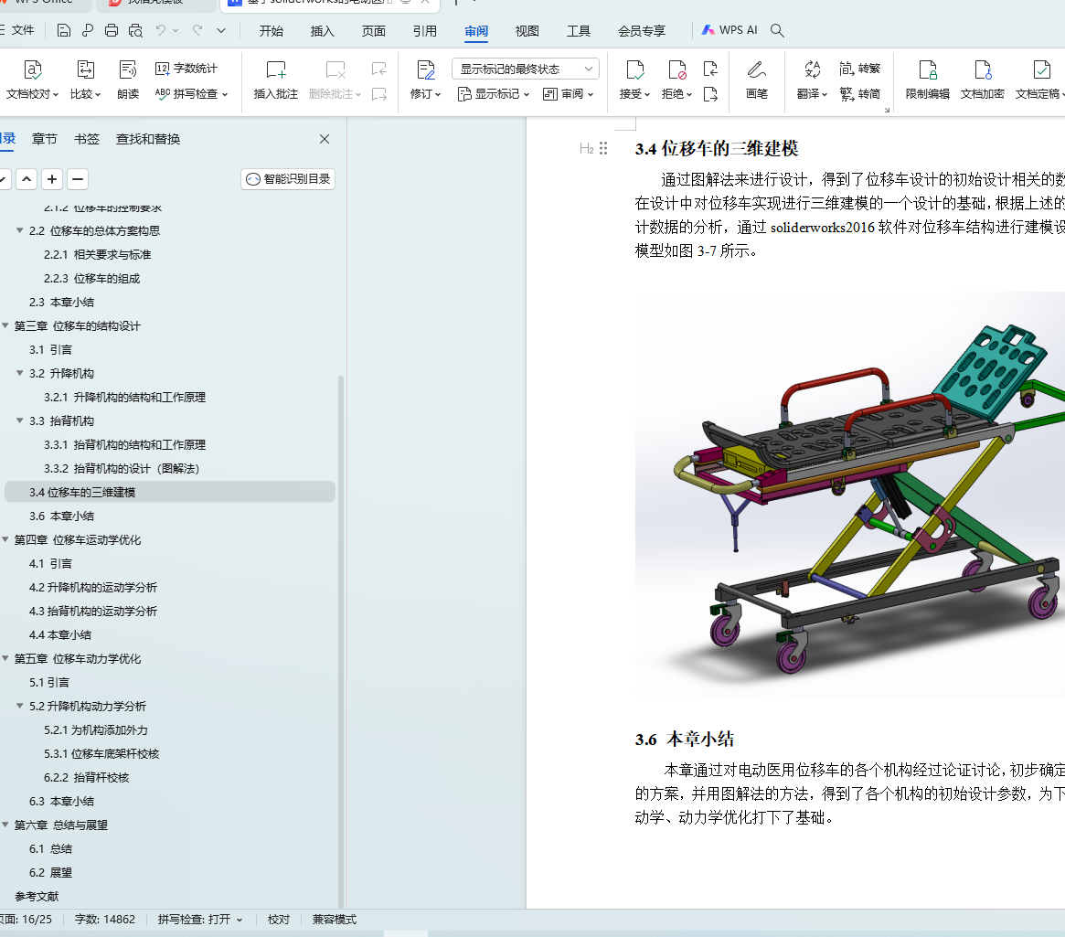 电动医用的位移车,是一种针对在医院和老人护理使用的便捷的设备,用于在危重病人以及瘫痪病人的治疗上使用的有特殊使用需求的一种设计结构,在能随意的实现调节车和床集合的背部结构和脚部倾斜的角度。即使在治疗中不能自理的病人,在护理的人员也可以通过电动位移车的控制系统进行便捷的操作,使得在护理上减少照顾病人和残患病人的护理劳动的强度。本文的设计针对上述的结构性质的情况,提出并设计一种新型的医院和老人护理护理用的电动位移车,首先对整体的结构进行分析,采用三维建模等设计的软件,本次使用soliderworks对位移车的结构进行建模和设计的装配,然后在导出到CAXA软件中进行图纸的修改。研究了在设计升降位移系统在各种实现运动状况下,角加速度在对病人的舒适度造成的影响,分析线性推杆在工作中实现各姿态下的一个受力的状况,进行优化性的功能设计,对位移车的部件分别进行了运动学计算和动力学的分析优化;实现角加速度最大值在最小化下的。
