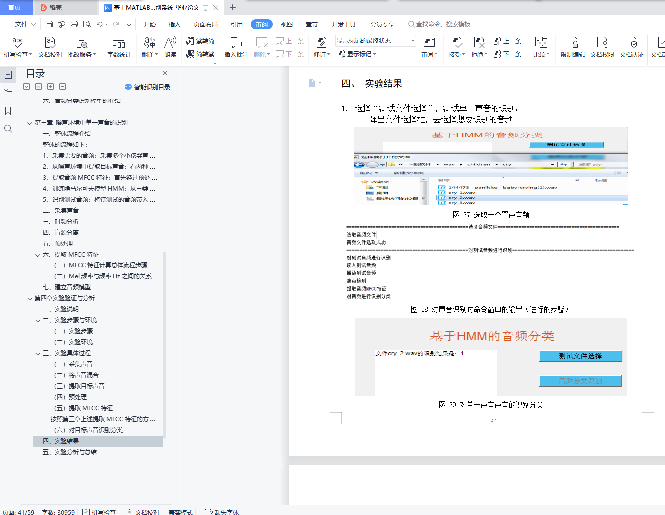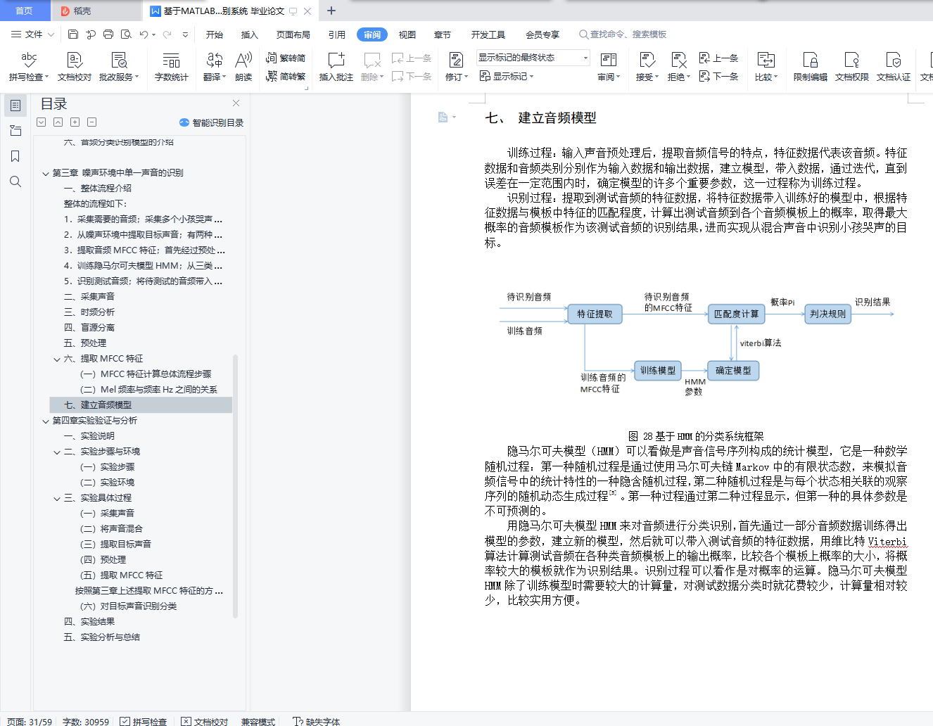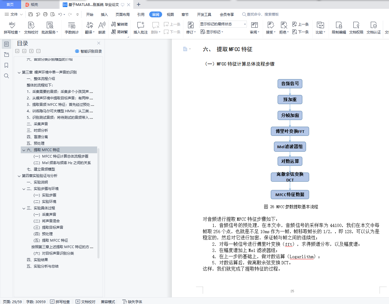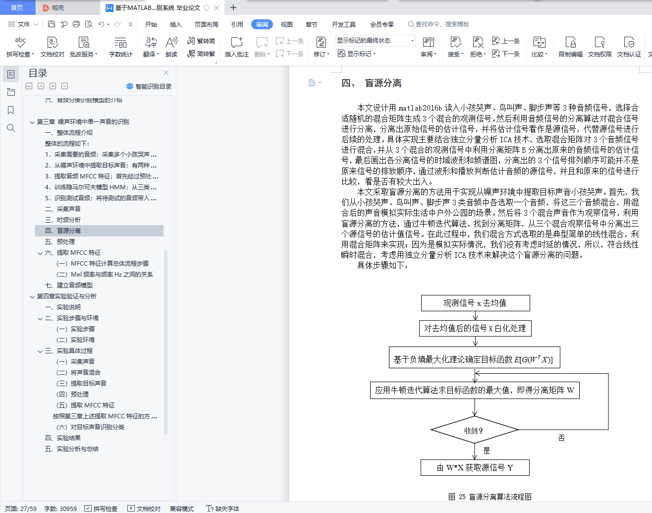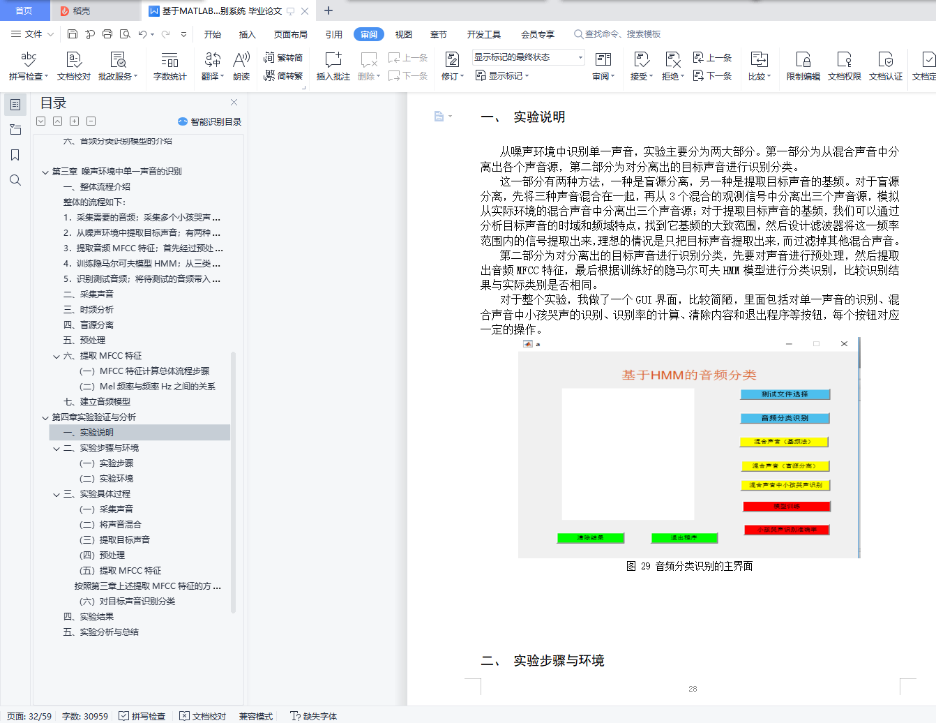 本次设计的仿真实验均在matlab2016b上进行,模拟公园或幼儿园的场景,将小孩的哭声、脚步声、小鸟叫声音三种声音混合在一起。课题专注于如何从这三种混合声音中识别出是否有小孩哭声。主要步骤包括:从混合声音中提取目标声音(小孩哭声),提取音频MFCC特征,将特征数据带入根据训练好的隐马尔可夫模型,进行识别分类。对于如何从三种混合声音中提取出目标声音,本文介绍了两种方法。第一种是根据基频处理的方法,将三种声音录制成一段音频,根据待识别声音的基频范围设计对应的滤波器,将目标声音的基频大致过滤提取出来;第二种是盲源分离,利用盲源分离的方法将这三种声音从混合后的观测声音中分离出来,提取出目标声音。在从混合声音中提取出目标声音(小孩哭声)后,经过分帧加窗端点检测后,提取小孩哭声的MFCC特征,将特征数据带入已经训练好的隐马尔可夫模型HMM中,得出识别结果,比较识别结果与实际类别是否相同,得出模型的识别准确率。