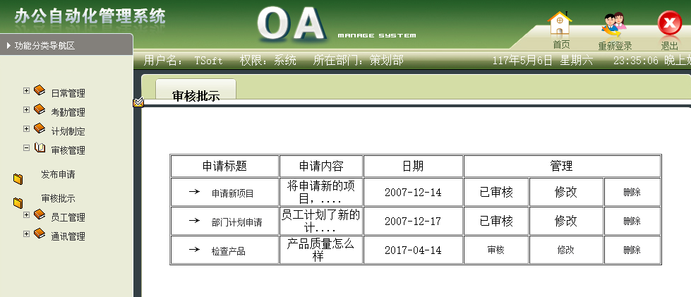Keywords: Office Automation;Jsp;audit management;planning design;B/S three layer architecture