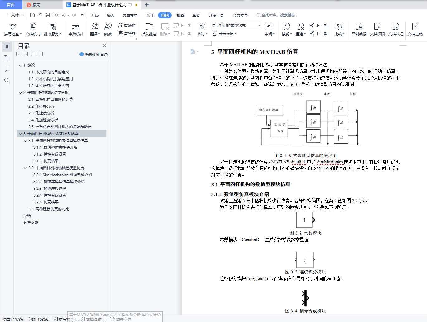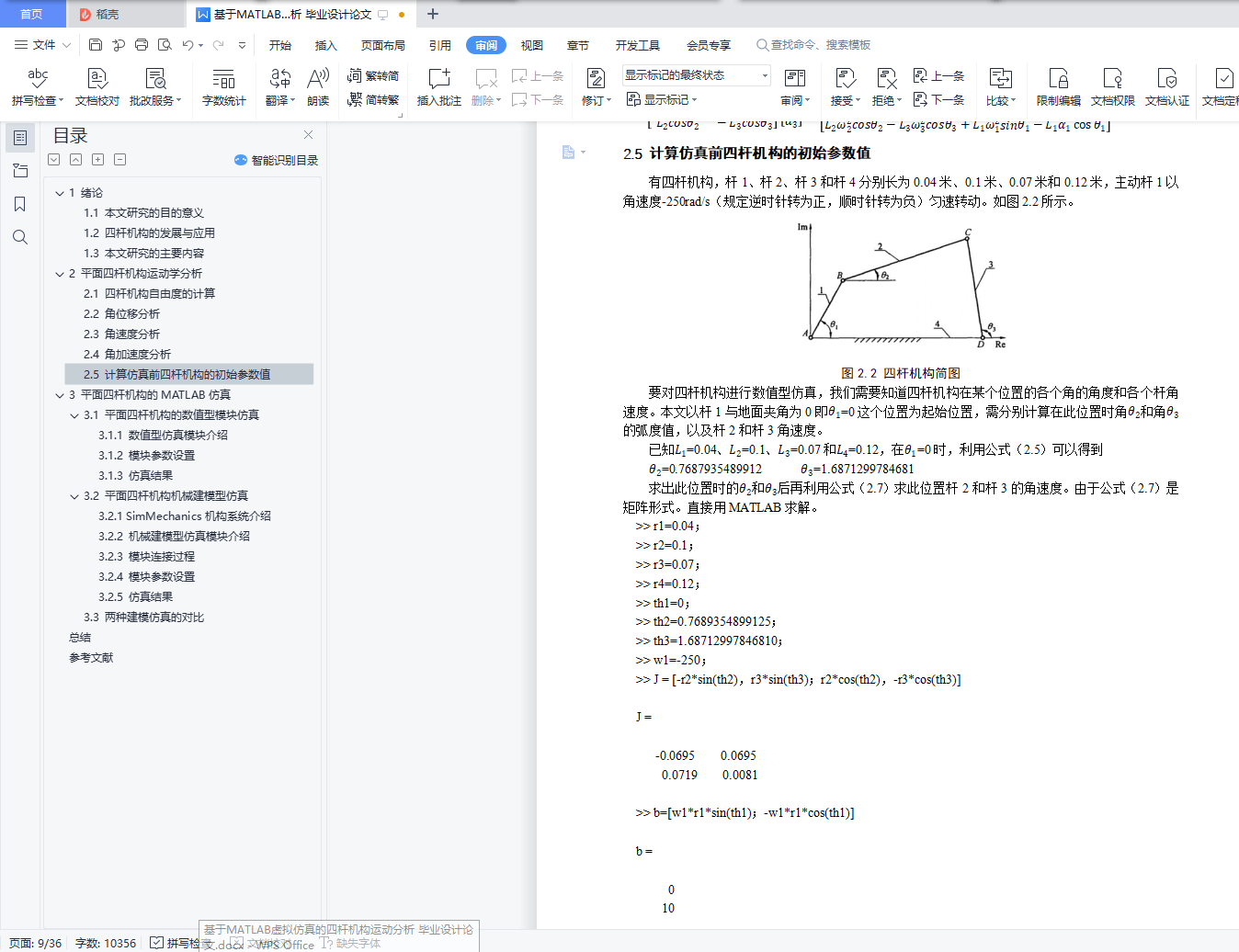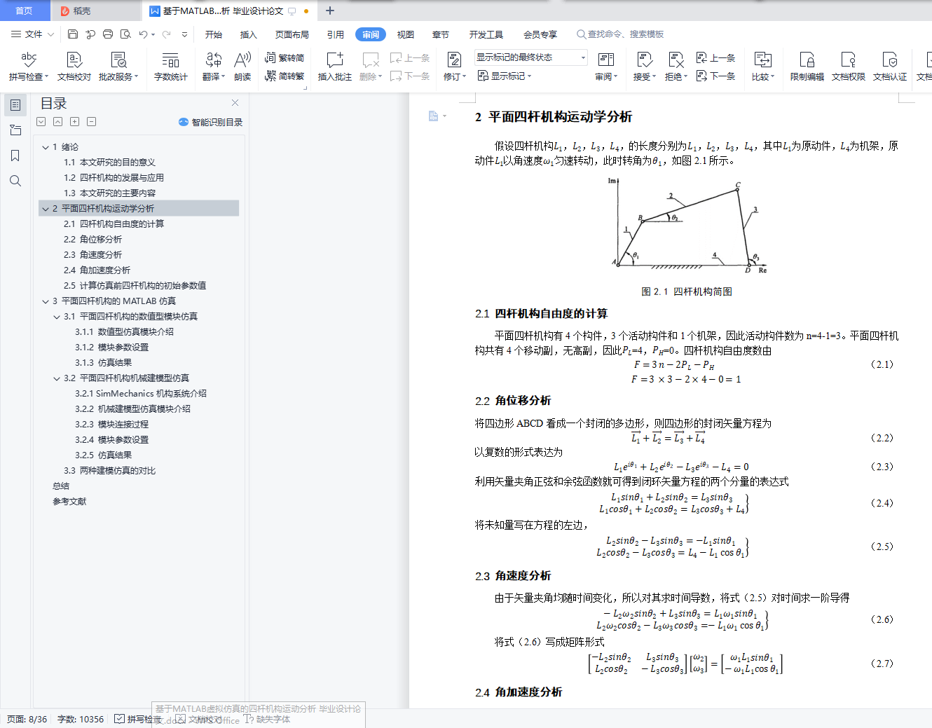 基于MATLAB虚拟仿真的四杆机构运动分析摘 要在工程领域中,四杆机构是一种被广泛应用的传动机构。对四杆机构进行设计时,我们需要对其进行运动分析,得到运动过程中的杆的各个参数。应用计算机软件MATLAB对四杆机构进行运动学分析,可以轻松得到四杆机构在运动过程中,各杆的运动参数的曲线图。本论文研究内容为:(1)对四杆机构进行运动学分析,分析其角位移、角速度和角加速度,并对其进行数学描述。(2)利用对四杆机构的数学描述的结果,用MATLAB/simulink对四杆机构进行数值型的仿真。(3)运用MATLAB/simulink中的SimMechanics 动态仿真工具构建四杆机构模型并对其仿真。(4)通过仿真分析从动杆的瞬时角速度、瞬时角加速度、角位移变化等数据。(5)对比基于MATLAB的两种仿真方法。通过本文的研究,提供了用MATLAB对四杆机构进行运动学分析的方法。【关键词】四杆机构 MATLAB 仿真Motion analysis of four-bar mechanism based on MATLAB virtual simulationAbstractIn the field of engineering, four-bar mechanism is a widely used transmission mechanism. When designing the four-bar mechanism, we need to analyze its motion and get the parameters of the bar in the process of motion. By using the computer software MATLAB to analyze the kinematics of the four-bar mechanism, it is easy to get the curves of the motion parameters of the four-bar mechanism in the process of motion.The research content of this paper is as follows:(1) The kinematics of the four-bar mechanism is analyzed, and its angular displacement, angular velocity and angular acceleration are analyzed.(2) Based on the results of mathematical description of four-bar mechanism, the numerical simulation of four-bar mechanism is carried out with MATLAB / Simulink.(3) The four-bar mechanism model is built and simulated by using the dynamic simulation tool of SimMechanics in MATLAB / Simulink.(4) The data of instantaneous angular velocity, instantaneous angular acceleration and polar angle of driven rod are analyzed by simulation.(5) Compare the two simulation methods based on MATLAB.Through the research of this paper, the method of kinematic analysis of four-bar mechanism with MATLAB is provided.【Key words】four bar linkage MATLAB simulation目 录1 绪论 (1)1.1 本文研究的目的意义 (1)1.2 四杆机构的发展与应用 (1)1.3 本文研究的主要内容 (2)2 平面四杆机构运动学分析 (3)2.1 四杆机构自由度的计算 (3)2.2 角位移分析 (3)2.3 角速度分析 (3)2.4 角加速度分析 (3)2.5 计算仿真前四杆机构的初始参数值 (4)3 平面四杆机构的MATLAB仿真 (6)3.1 平面四杆机构的数值型模块仿真 (6)3.1.1 数值型仿真模块介绍 (6)3.1.2 模块参数设置 (7)3.1.3 仿真结果 (11)3.2 平面四杆机构机械建模型仿真 (15)3.2.1 SimMechanics机构系统介绍 (15)3.2.2 机械建模型仿真模块介绍 (15)3.2.3 模块连接过程 (16)3.2.4 模块参数设置 (20)3.2.5 仿真结果 (23)3.3 两种建模仿真对比 (28)总结 (29)参考文献 (30)